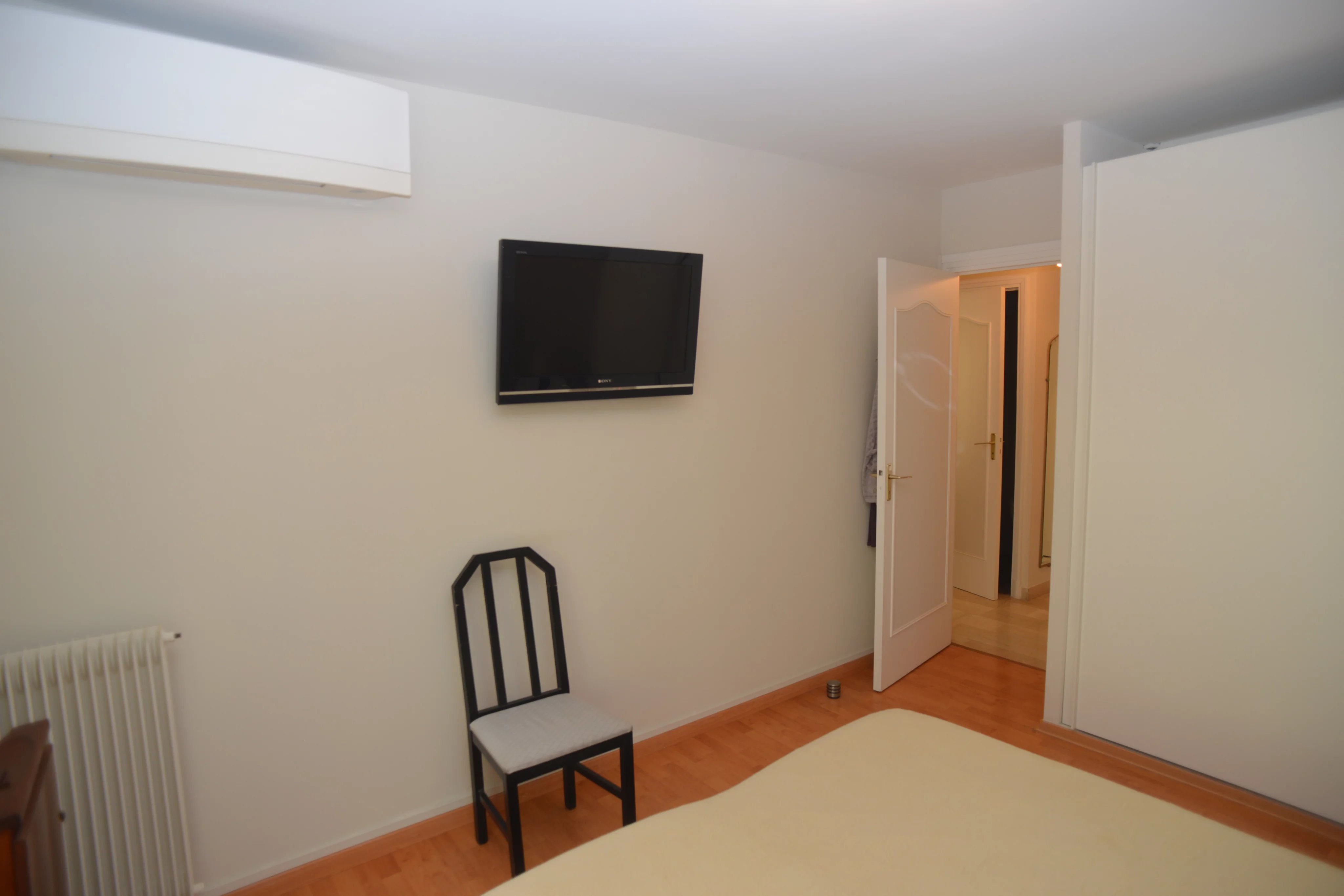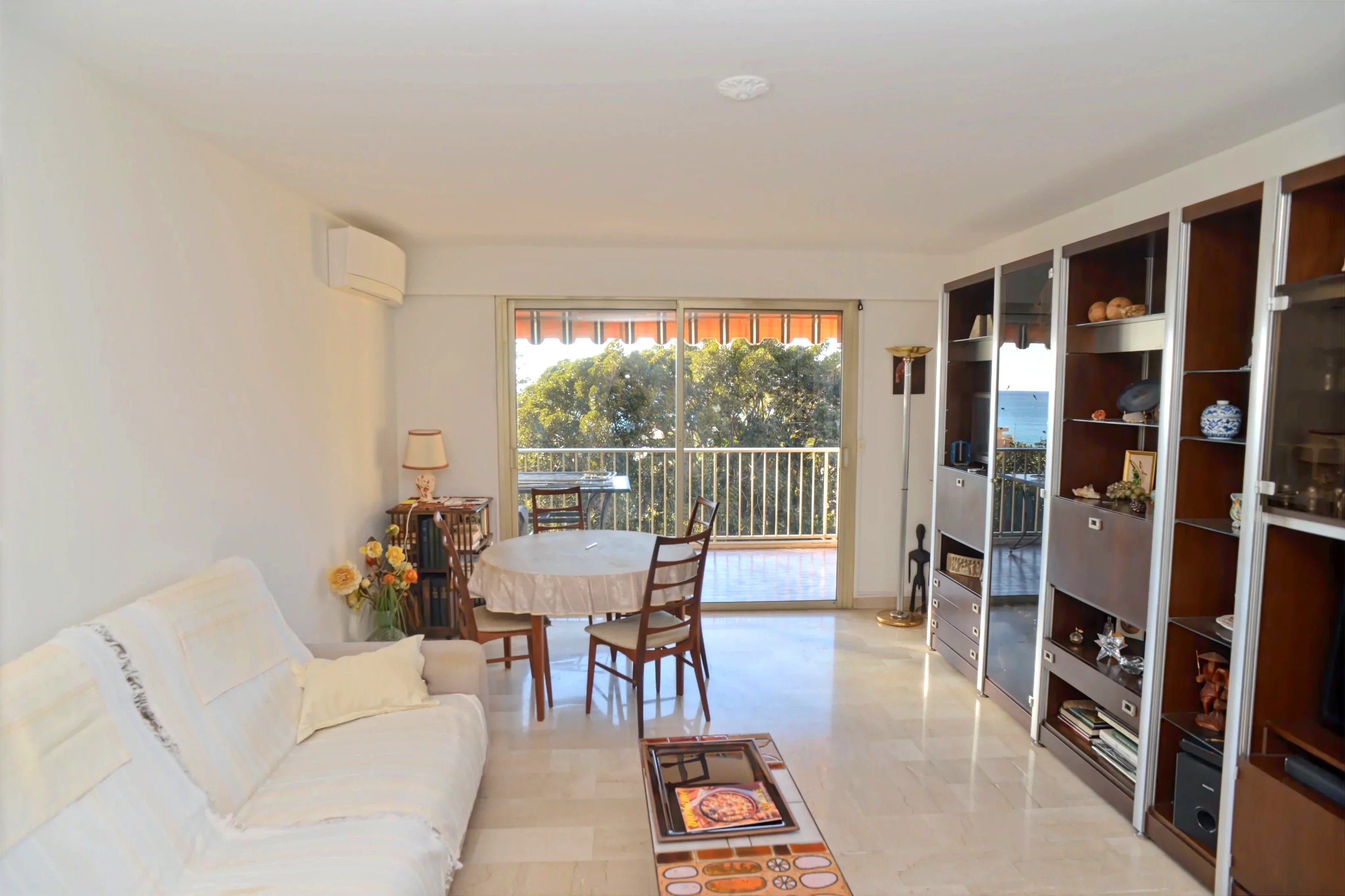 Un chambre, une salle d'eau avec WC, une cuisine ouverte sur le salon et une belle terrasse.
