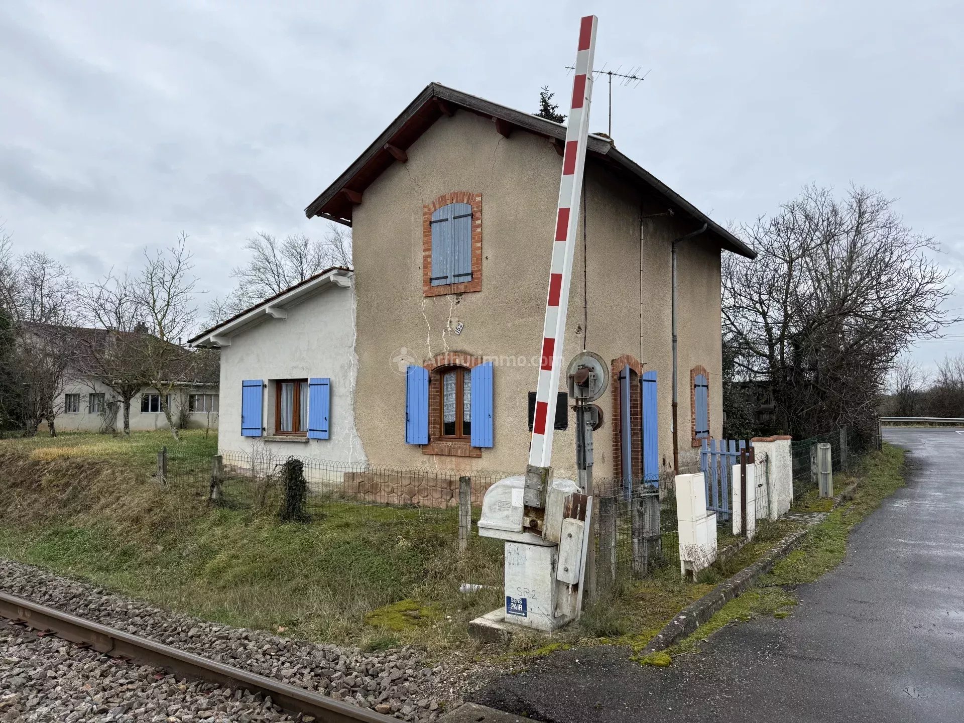 Maison de garde-barrière (en bordure de voie ferrée) de type 3/4, 76m² habitable sur terrain d'environ 700m² avec un puits. Elle est composée d'un salon, d'une cuisine, salle d'eau, bureau et toilette en rez-de-chaussée et de 2 chambres à l'étage. il n'y a pas de chauffage