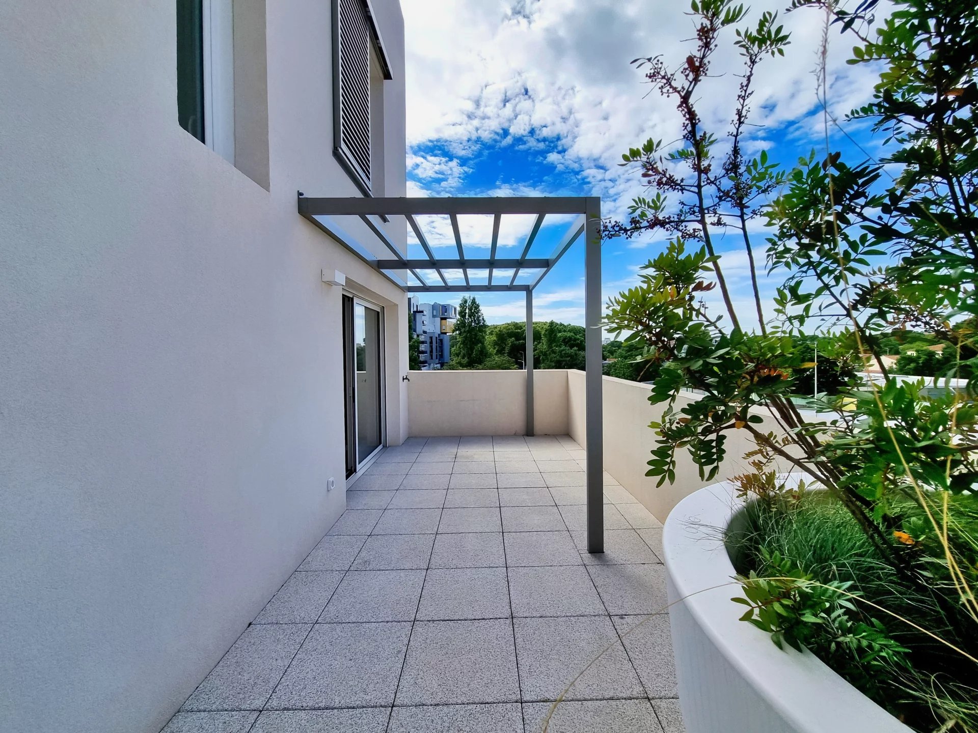 Grande pièce lumineuse, sol en lames façon bois gris, mur prune sur un côté. Canapé cuir beige, table en verre, tv fixée au mur, plantes (je les laisse si ça vs arrange). Grande fenêtre plein jour. Ambiance cosy mais pas étouffante. Pas de perte d'espace.