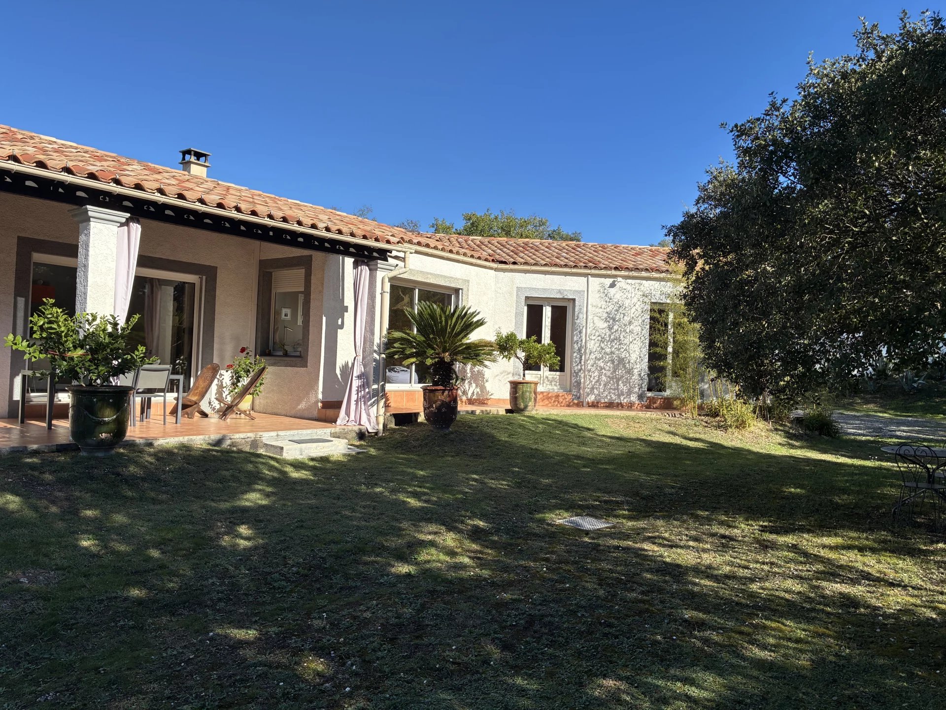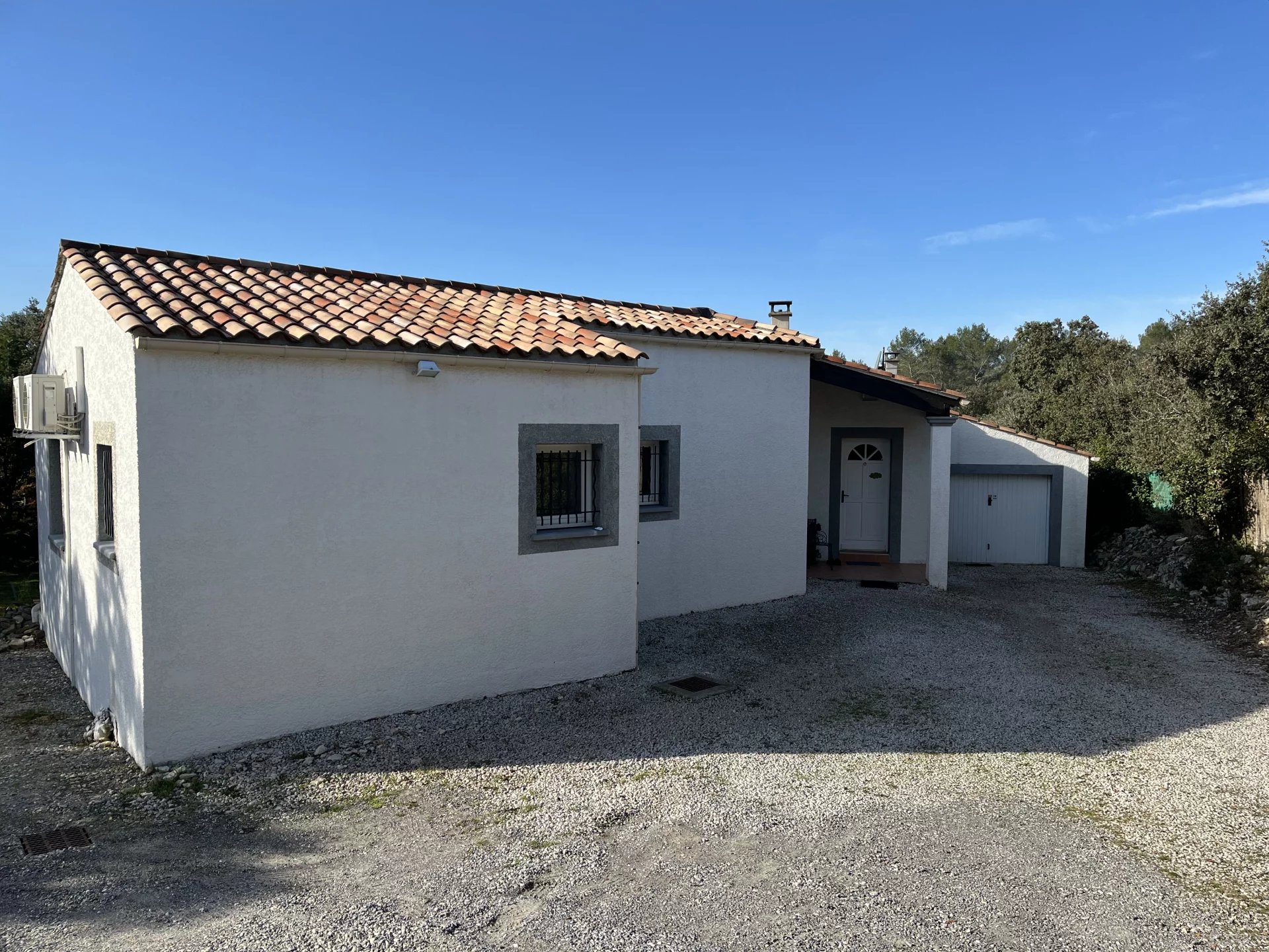 Between the sea and the Cevennes mountains, in the center of the Ales-Nîmes-Montpellier triangle, 123 m2 villa on 1800 m2 of land, in the village of Orthoux-Sérignac-Quilhan. Comprising four rooms, a practical entrance hall with cupboard, two bedrooms with ample storage space, and a 76m2 living area with kitchen and living room.