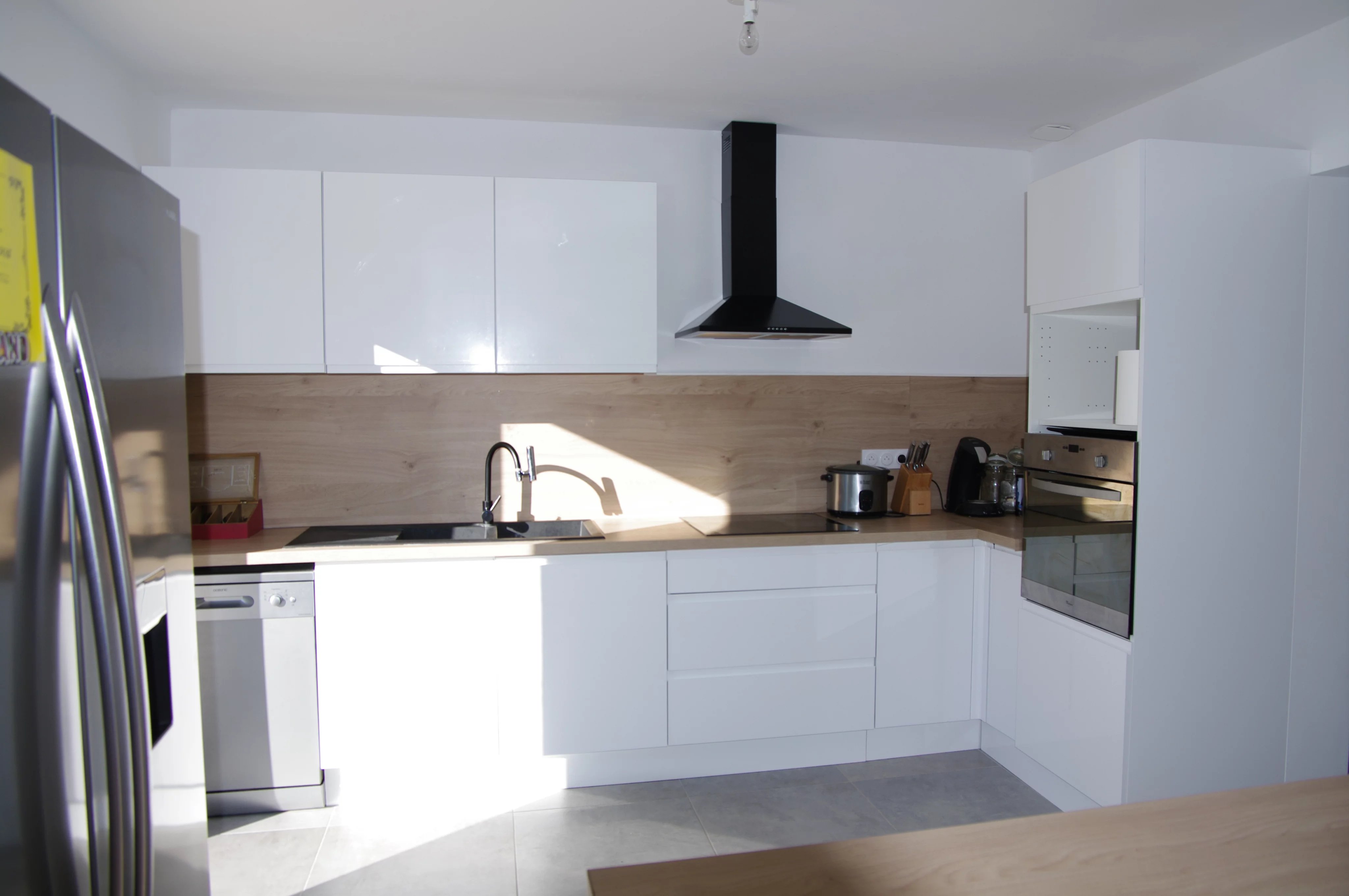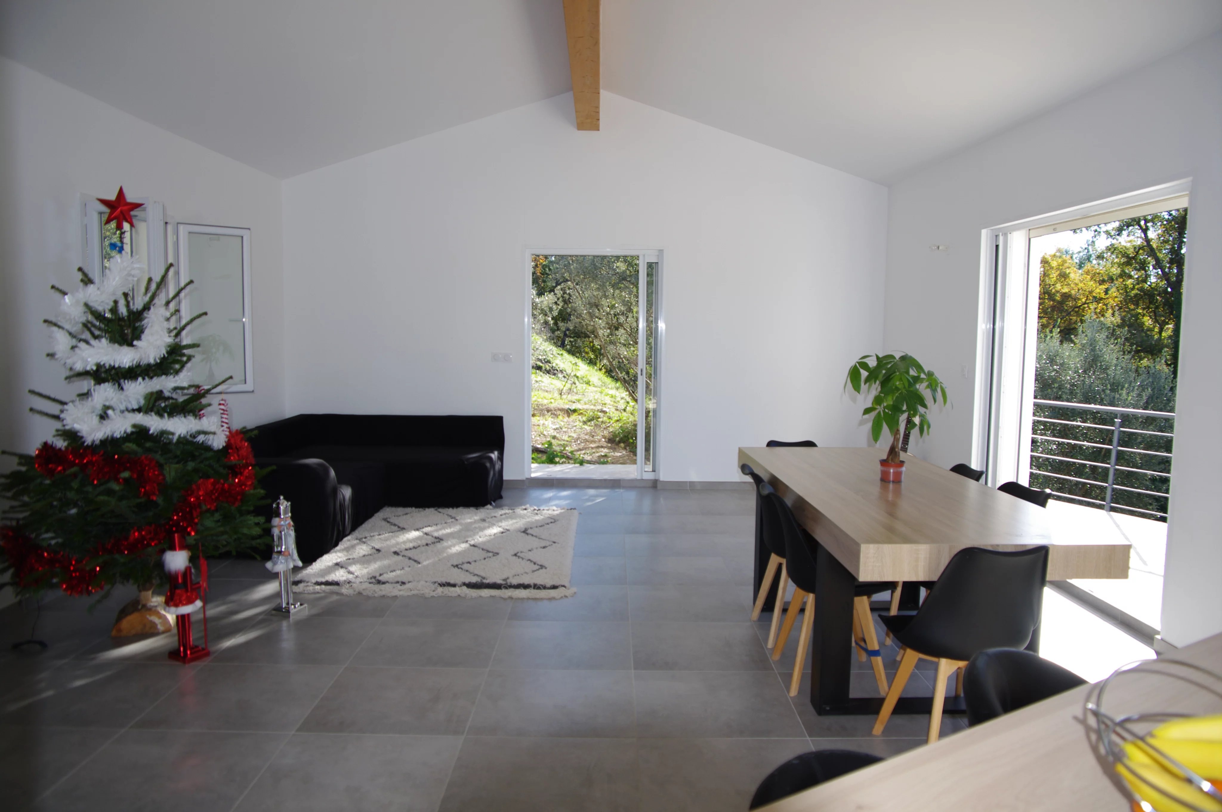 Un grand séjour avec une cuisine ouverte, baigné de lumière grâce à une baie à galandage ouvrant sur une vaste terrasse carrelée exposée plein sud, offrant une vue dégagée.