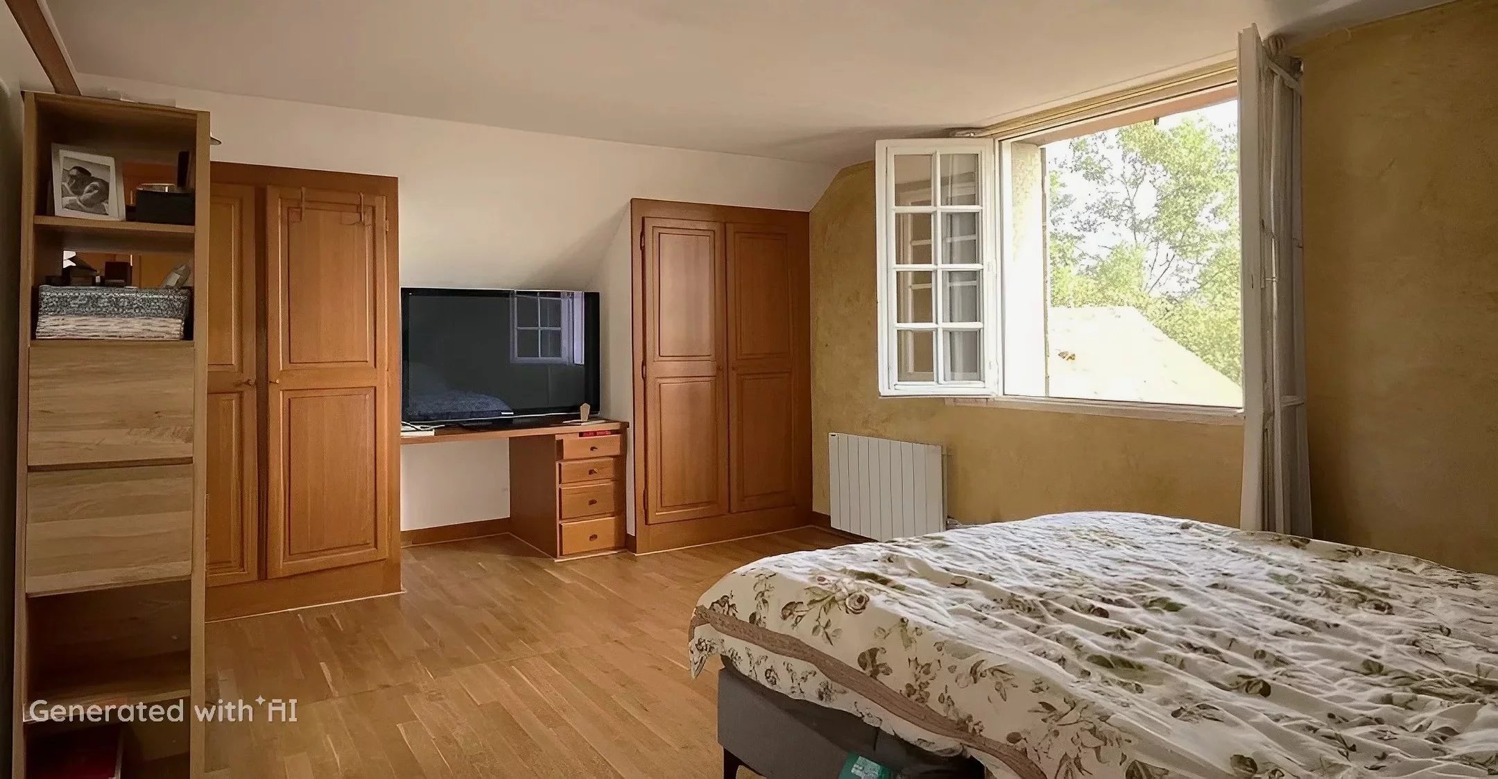 Ce double séjour se prolonge par une vaste véranda d’environ 35 m², de belle construction, offrant un espace atypique avec vue dégagée.