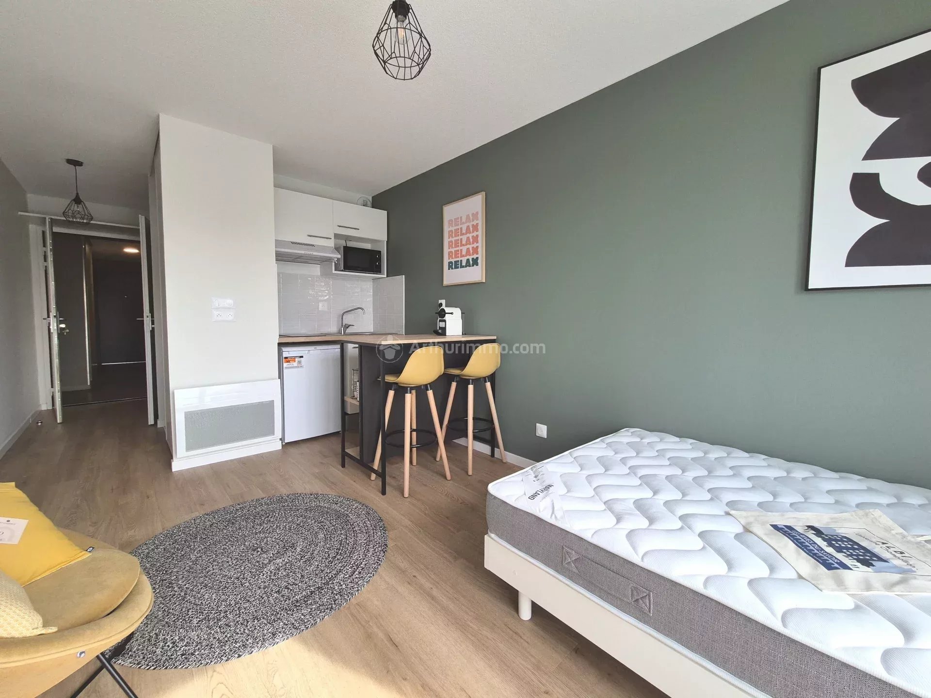 Studio meublé d'environ 21m² situé au deuxième étage d'une résidence neuve et sécurisée. Il se compose d'une entrée avec placard intégré, une pièce de vie avec cuisine ouverte et équipée (hotte, plaque vitrocéramique, frigo-top, micro-ondes, cafetière) et d'une salle d'eau avec toilette.