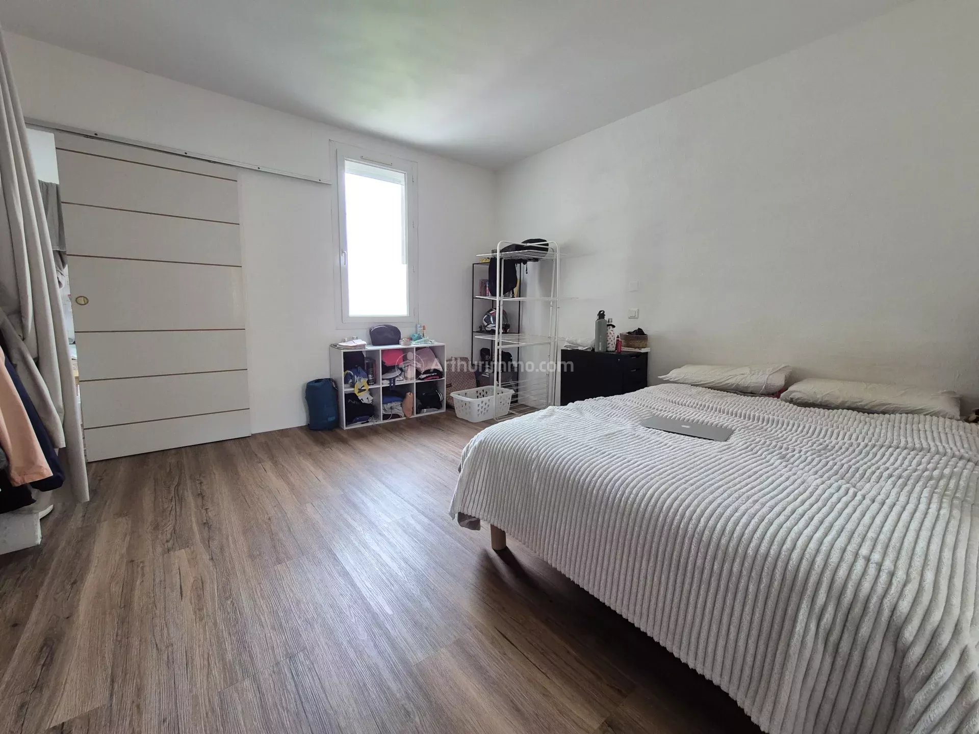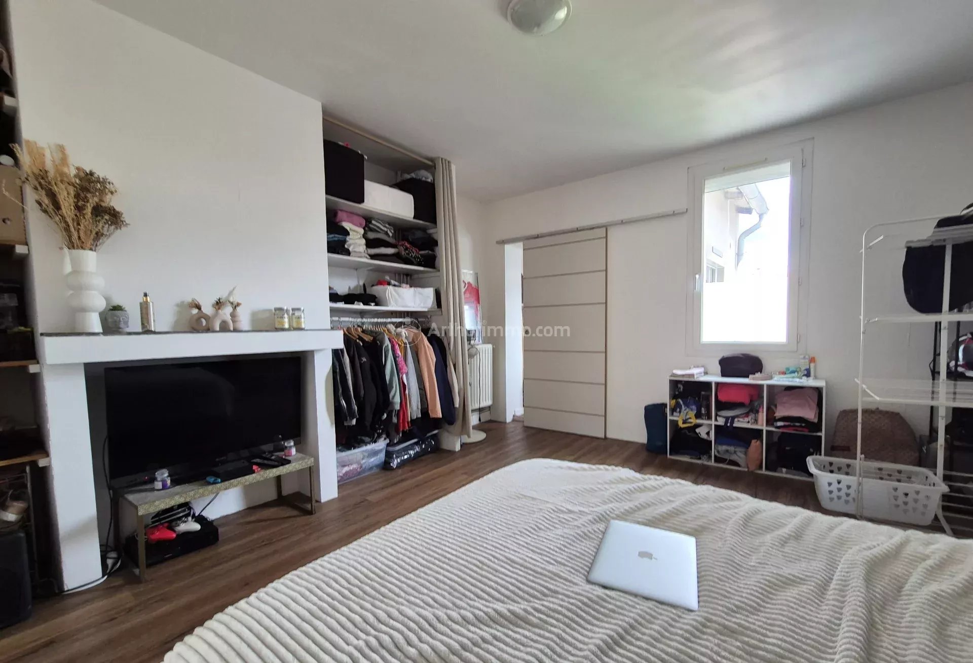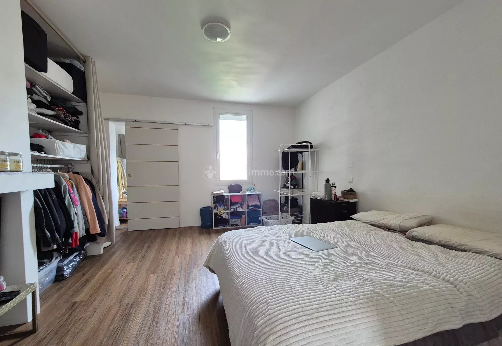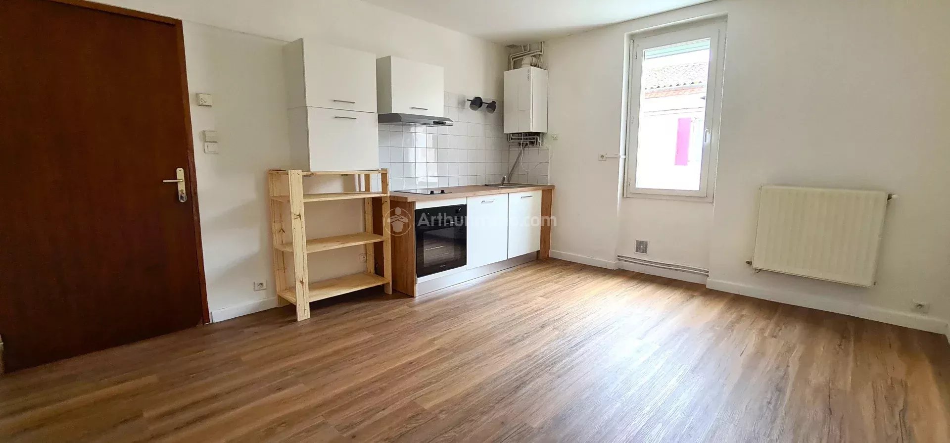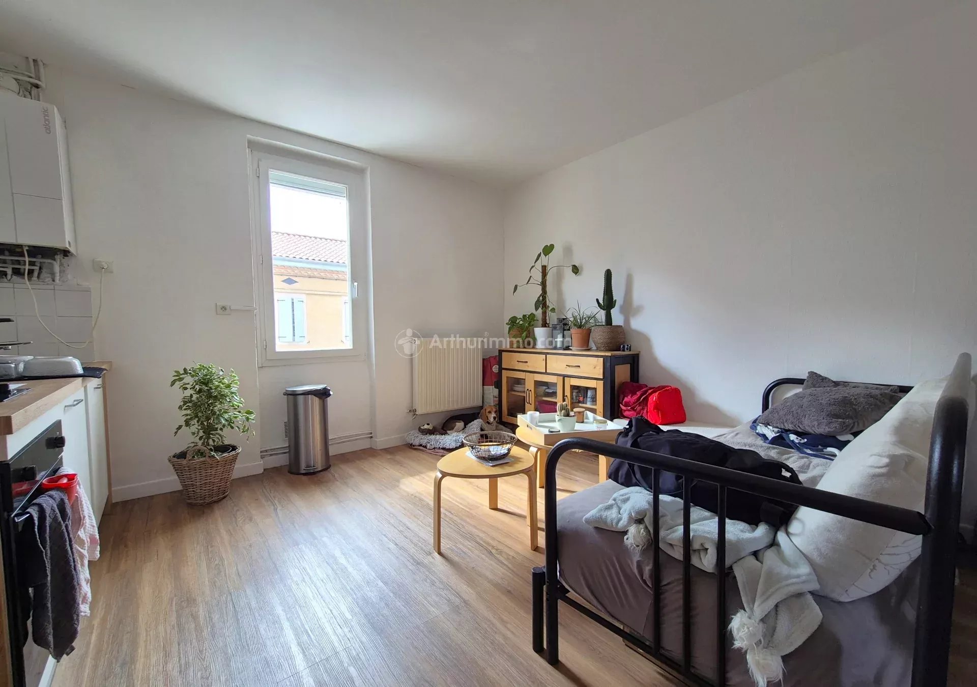 Une pièce de vie avec cuisine ouverte aménagée et équipée (plaque vitro, hotte, frigo top et four), une grande chambre avec des rangements, une salle de bains avec WC. Une parcelle de jardin.