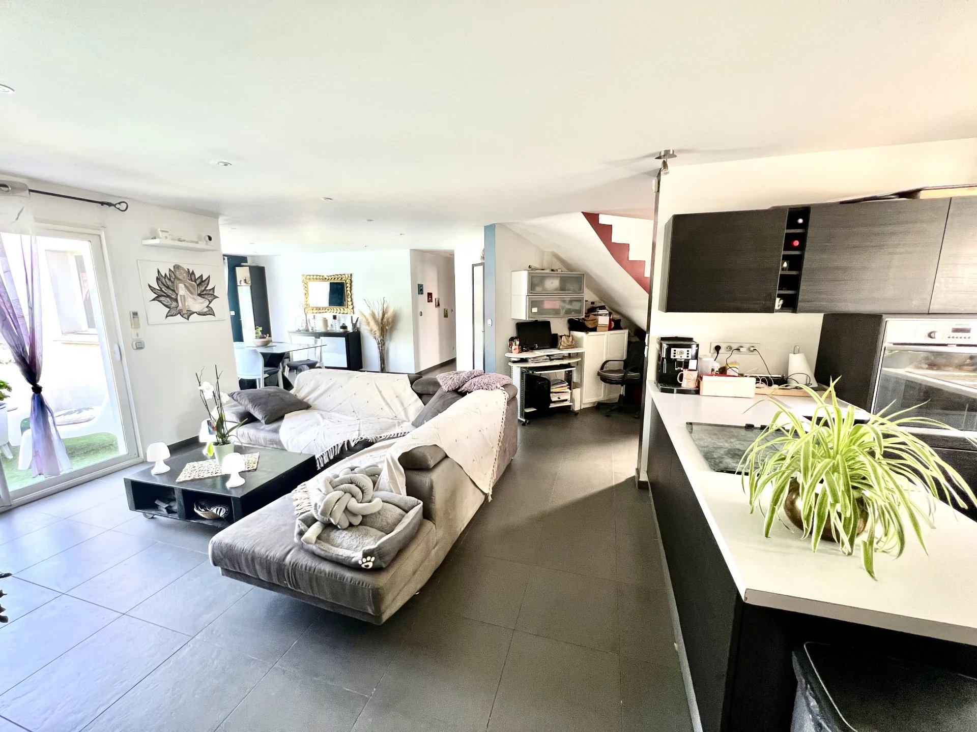 Dès l’entrée, vous découvrez une ambiance chaleureuse et soignée. Le vaste séjour et le salon s’ouvrent sur une belle terrasse plein sud, baignée de lumière naturelle. La cuisine équipée, invite à la convivialité au quotidien. Toujours au rez-de-chaussée, deux chambres confortables, une salle de bains, un WC indépendant, de nombreux rangements ainsi qu’une grande buanderie facilitent la vie de famille.