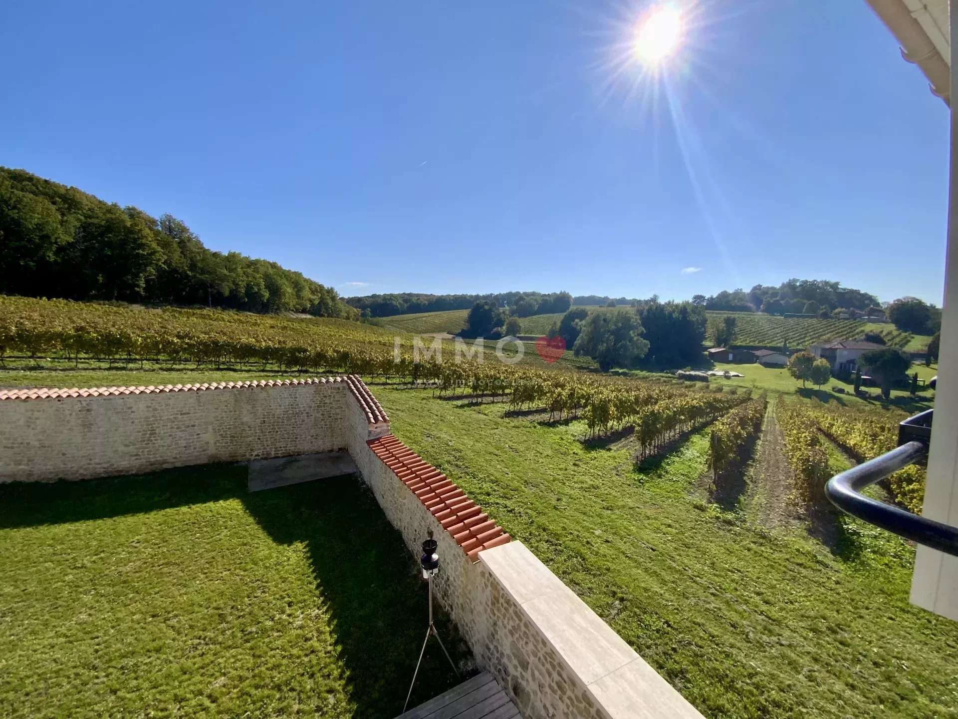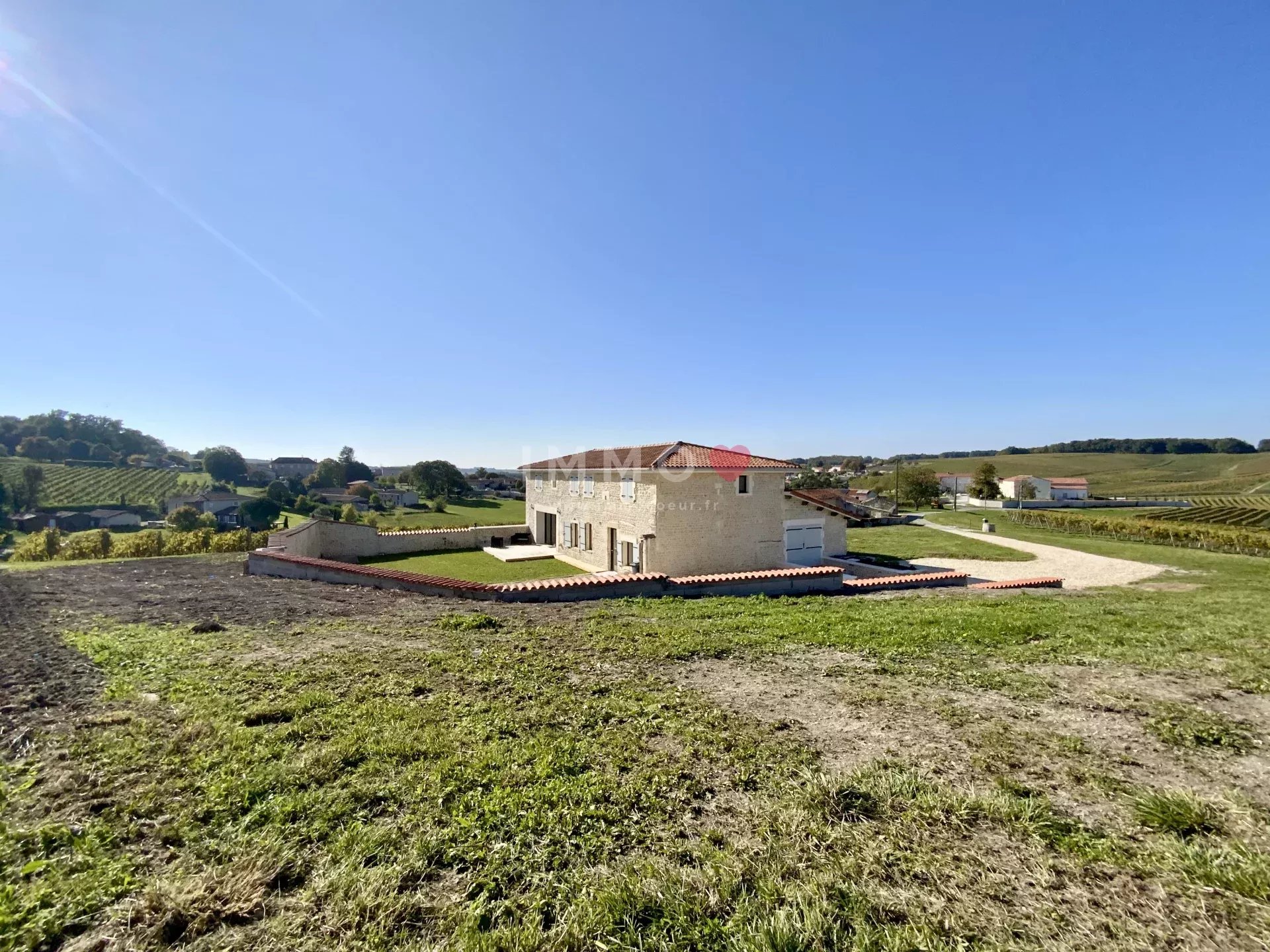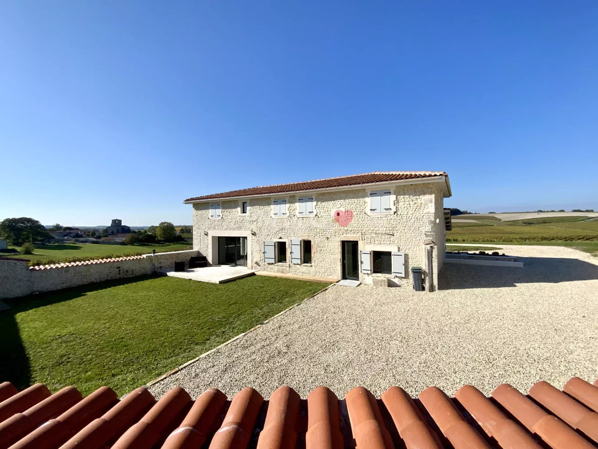 Nestled high up in the heart of the noble lands of Grande Champagne, this authentic 270 m² Charentaise offers a 360° panoramic view of the surrounding vineyards and a rare, quiet, unoverlooked living environment.