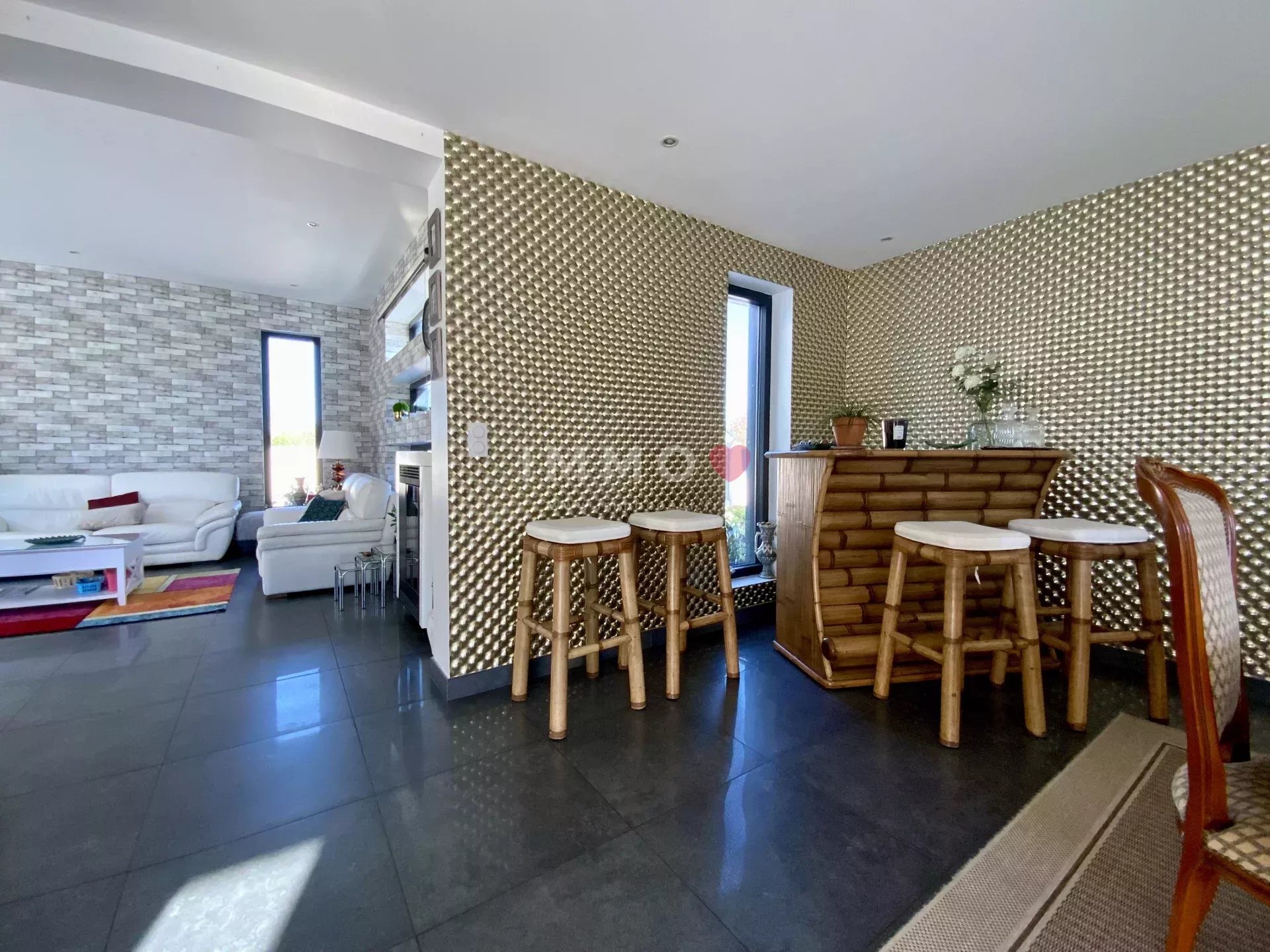 Just 10 minutes from the beaches Royan Right from the start, this contemporary property captivates with its pure architecture and bold lines. Entirely light-filled, it offers a warm, refined atmosphere, where every space has been designed to enhance everyday life. ⟢ Living spaces At the heart of the house, a vast living room bathed in sunlight thanks to large south-facing windows. The modern, perfectly integrated kitchen flows harmoniously into the dining room and living room. Further back, a second living room creates an intimate space for relaxation. The openings disappear to create a natural continuity between the interior and the wooden terrace, offering a true indoor/outdoor experience all year round. ⟢ Night space & comfort The night space comprises 3 bedrooms and an office that can double as a 4ᵉ bedroom. A bathroom with shower, a shower room, and a large dressing room complete the ensemble perfectly. The house benefits from a wealth of cleverly distributed storage space, guaranteeing everyday comfort. ⟢ Landscaped exteriors The 1,249 m² fully landscaped grounds feature a superb swimming pool secured by a curtain, a large wooden terrace and a petanque court ideal for convivial moments. ⟢ Features & equipment Laundry room, 40 m² garage with storage platform, carport, pellet stove heating, south-facing bay windows, excellent energy performance (DPE B / A). Modern construction, perfectly maintained, designed with quality materials. ⟢ Environment Located in a quiet, sought-after neighborhood, this property offers a true haven of peace, while remaining close to beaches and amenities.