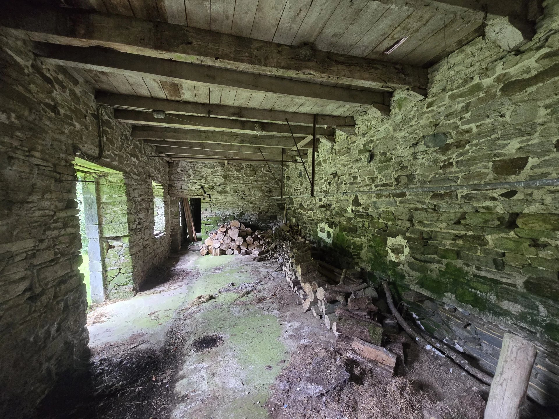 The interior boasts a spacious open-plan living and dining area with beautiful exposed beams and rustic stonework. Natural light floods the space, highlighting the home's character and charm. The adjoining kitchen is well-equipped and designed for both functionality and style, making it a perfect space for culinary creations and social gatherings.