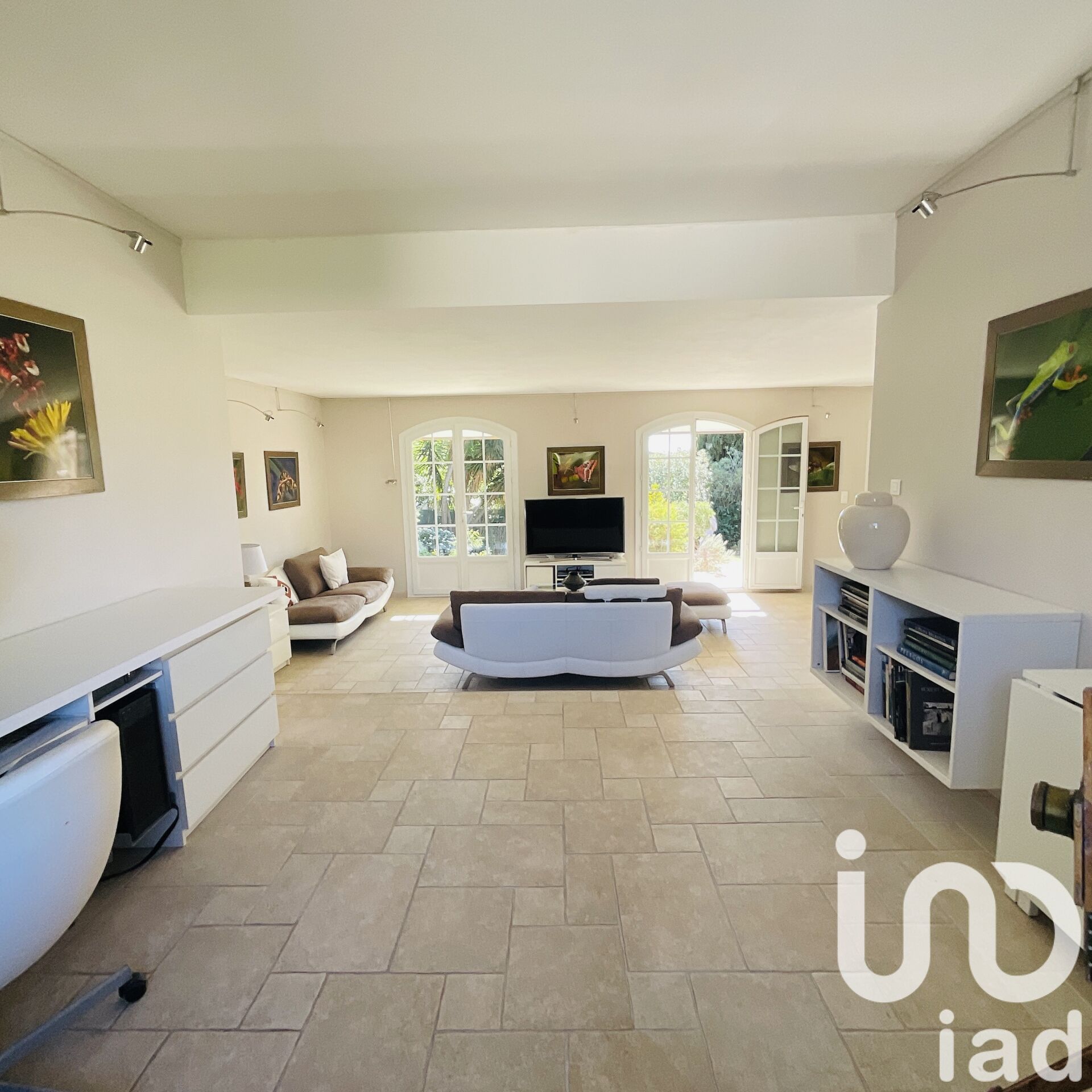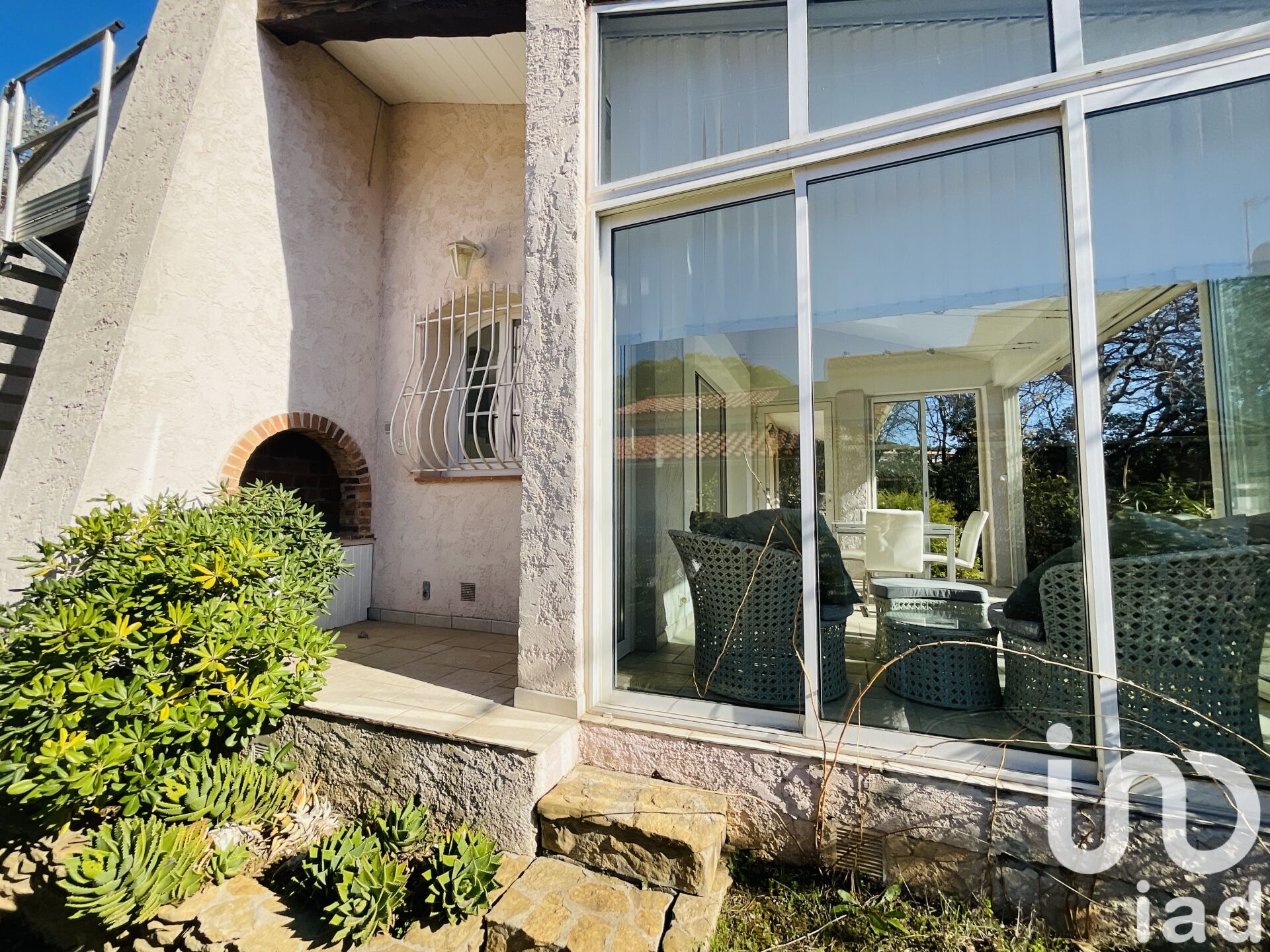 L’entrée s’ouvre sur un salon lumineux, qui dessert d’un côté une cuisine équipée et de l’autre de larges baies vitrées s’ouvrant sur l’extérieur. L’espace extérieur offre une grande terrasse, une piscine, un terrain de boules, le tout dans un cadre calme et ensoleillé, avec une vue dominante et dégagée sur la mer.