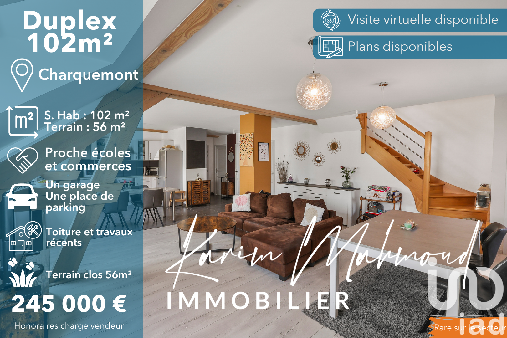 Iad France - Karim Mahmoud vous propose : À VENDRE – Superbe appartement en duplex avec jardin privatif à Charquemont (25) Vous rêvez de la tranquillité d’une maison avec les avantages d’un appartement ? Cet appartement est fait pour vous ! Situé dans un quartier calme et recherché de Charquemont, à seulement 20 minutes de la frontière suisse, ce bien rare est niché dans une petite copropriété récemment rénovée, à deux pas des commerces. Une localisation idéale pour allier vie pratique et qualité de vie. Au 2e et dernier étage, cet appartement de 102 m² orienté sud-est offre une pièce de vie lumineuse ouverte sur une cuisine conviviale, deux belles chambres, une grande salle de bain, un WC séparé ainsi que de nombreux rangements. À l’étage, vous découvrirez une troisième pièce et un espace de jeux spacieux, parfait pour une salle TV, un bureau ou même une autre chambre selon vos besoins. Deux places de stationnement (dont une privative) et un grand garage viennent compléter ce bien. Le vrai coup de cOEur ? Son jardin privatif de 56 m² – une perle rare pour un appartement ! Profitez des beaux jours dans cet espace extérieur, comme dans une maison… sans les contraintes. Chauffage et chauffe-eau électriques. Idéal pour un premier achat ou pour un investissement locatif pérenne. Ne laissez pas passer cette opportunité unique ! Contactez-nous pour organiser une visite et laissez-vous séduire par ce lieu de vie chaleureux et fonctionnel. Honoraires d'agence à la charge du vendeur. La presente annonce immobiliere vise 5 lots situés dans une copropriété de 15 lots au total et ne faisant l'objet d'aucune procédure en cours citée à l'article L. 721-1 du code de la construction et de l'habitation. Montant moyen mensuel de charges déclaré par le vendeur : 66.67€ par mois (soit 800 € annuel). Honoraires d'agence à la charge du vendeur. Information d'affichage énergétique sur ce bien : classe ENERGIE C indice 163 et classe CLIMAT B indice 6. Les informations sur les risques auxquels ce bien est exposé, y compris l'obligation légale de débroussaillement, sont disponibles sur le site Géorisques : http://www.georisques.gouv.fr. La présente annonce immobilière a été rédigée sous la responsabilité éditoriale de M Karim Mahmoud mandataire indépendant en immobilier (sans détention de fonds), agent commercial de la SAS I@D France immatriculé au RSAC de BELFORT sous le numéro 915077481, titulaire de la carte de démarchage immobilier pour le compte de la société I@D France SAS.