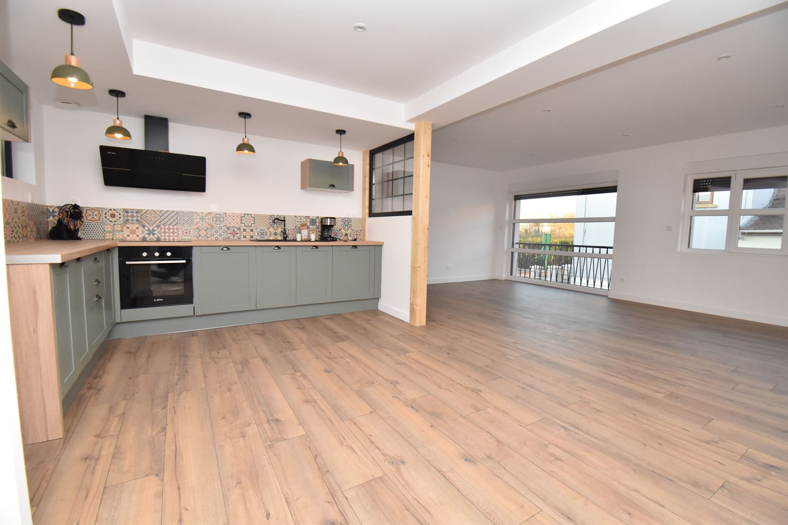 - Entrée, cuisine équipée ouverte sur un séjour d'environ 45m2, 3 chambres de 10m2, salle de douche italienne, lingerie, wc .