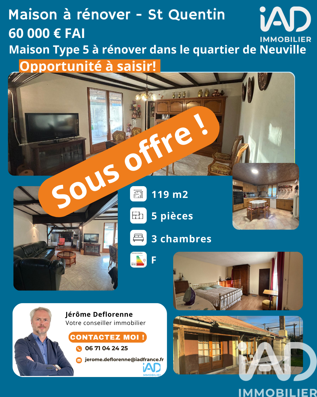 Iad France - Jérôme Deflorenne vous propose : Maison individuelle avec potentiel – Terrain 600 m² – Saint-Quentin Située à Saint-Quentin, dans un quartier calme et recherché, cette maison individuelle de plein pieds en retrait de la rue offre un véritable potentiel pour un projet de rénovation. Une opportunité rare pour les acquéreurs souhaitant personnaliser leur futur lieu de vie. Points forts du bien : Terrain de 600 m², idéal pour profiter d’un bel espace extérieur Grand portail et garage, avec la possibilité de garer plusieurs véhicules Toiture récente sur la maison Maison saine, parfaite pour un projet de rénovation selon vos envies Quartier tranquille, idéal pour une famille Composition de la maison : 3 chambres lumineuses Salon avec insert, chaleureux et économique Salle à manger attenante Cuisine séparée Salle d’eau Un beau potentiel à exploiter Cette maison offre une base solide pour créer un intérieur moderne et confortable. Grâce à son terrain généreux, son retrait de la rue et son quartier paisible, elle conviendra parfaitement à ceux qui recherchent calme, sécurité et qualité de vie. Beau projet de rénovation pour remodeler ce bien à votre image. Honoraires d'agence à la charge du vendeur. Information d'affichage énergétique sur ce bien : classe ENERGIE F indice 366 et classe CLIMAT F indice 85. Les informations sur les risques auxquels ce bien est exposé, y compris l'obligation légale de débroussaillement, sont disponibles sur le site Géorisques : http://www.georisques.gouv.fr. La présente annonce immobilière a été rédigée sous la responsabilité éditoriale de M Jérôme Deflorenne mandataire indépendant en immobilier (sans détention de fonds), agent commercial de la SAS I@D France immatriculé au RSAC de SAINT QUENTIN sous le numéro 914337670, titulaire de la carte de démarchage immobilier pour le compte de la société I@D France SAS.