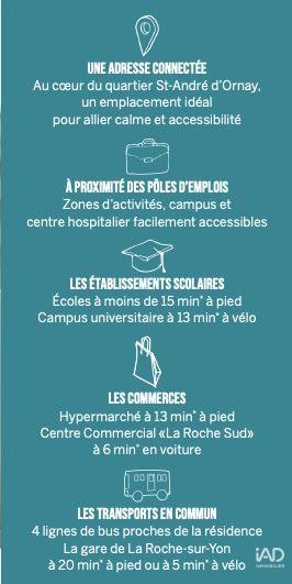 Iad France - Emilie Milcent (06 14 01 59 18) vous propose : Voici l'opportunité pour investir dans une résidence neuve à la ROCHE SUR YON. Ce T3 de 59 m² environ situé au 1er étage bénéficie d'une belle orientation dont vous pourrez profiter grâce au balcon terrasse de 11 m² environ. Un séjour, 2 chambres, salle d'eau et wc, parfait pour s'y installer seul ou en colocation ! Pour garantir un confort optimal, la résidence propose une salle commune, un service conciergerie, une laverie ainsi que la possibilité d’un service ménage. Profitez d’un bien totalement pris en charge, incluant mobilier, gestion, services et comptabilité, pour un investissement en toute tranquillité. Honoraires d’agence à la charge du vendeur. Bien non soumis au DPE. Les informations sur les risques auxquels ce bien est exposé sont disponibles sur le site Géorisques : www.georisques.gouv.fr. La présente annonce immobilière a été rédigée sous la responsabilité éditoriale de Mme Emilie Milcent EI (ID 79559), mandataire indépendant en immobilier (sans détention de fonds), agent commercial de la SAS I@D France immatriculé au RSAC de LA ROCHE SUR YON sous le numéro 909731820, titulaire de la carte de démarchage immobilier pour le compte de la société I@D France SAS. Retrouvez tous nos biens sur notre site internet. www.iadfrance.fr.