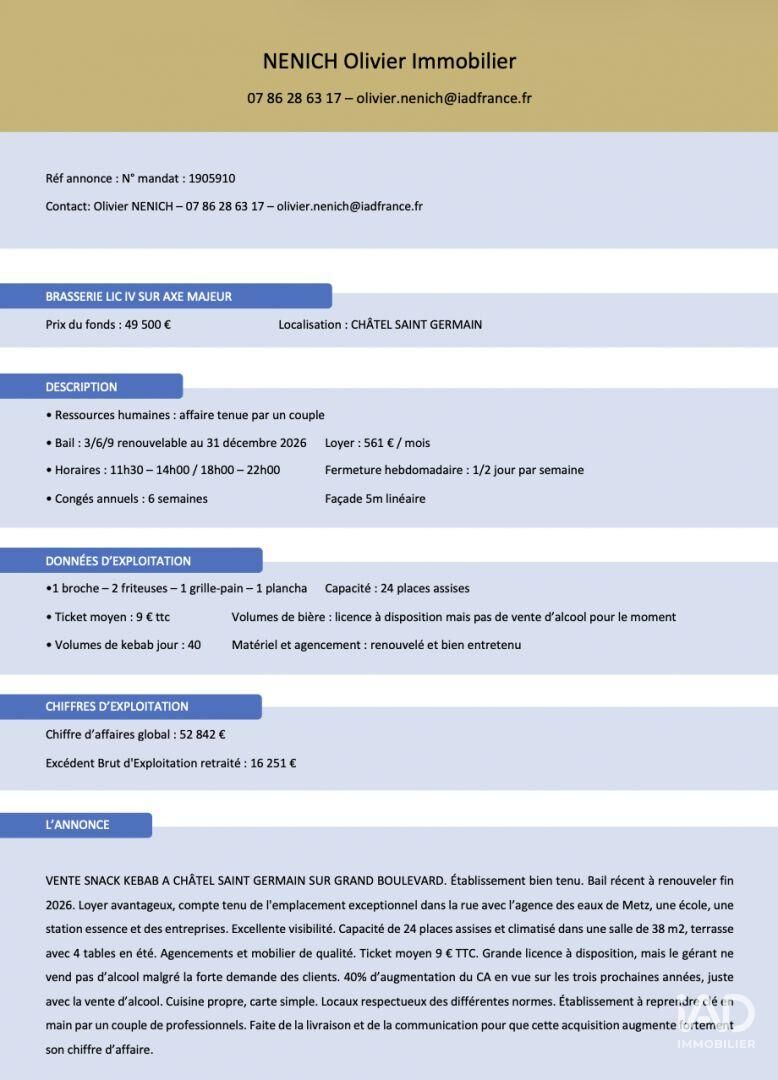 Iad France - Olivier Nenich (07 86 28 63 17) vous propose : VENTE SNACK KEBAB A CHÂTEL SAINT GERMAIN SUR GRAND BOULEVARD. Établissement bien tenu. Bail récent à renouveler fin 2026. Loyer avantageux, compte tenu de l'emplacement exceptionnel dans la rue avec l’agence des eaux de Metz, une école, une station essence et des entreprises. Excellente visibilité. Capacité de 24 places assises et climatisé dans une salle de 38 m² environ, terrasse avec 4 tables en été. Agencements et mobilier de qualité. Ticket moyen 9 € TTC. Grande licence à disposition, mais le gérant ne vend pas d’alcool malgré la forte demande des clients. 40% d’augmentation du CA en vue sur les trois prochaines années, juste avec la vente d’alcool. Cuisine propre, carte simple. Locaux respectueux des différentes normes. Établissement à reprendre clé en main par un couple de professionnels. Faite de la livraison et de la communication pour que cette acquisition augmente fortement son chiffre d’affaire. Information d'affichage énergétique sur le bien associé à cette annonce : DPE NS indice 0 et GES NS indice 0. La présente annonce immobilière a été rédigée sous la responsabilité éditoriale de M. Olivier Nenich (ID 72193), Agent Commercial mandataire en immobilier immatriculé au Registre Spécial des Agents Commerciaux (RSAC) du Tribunal de Commerce de Val de Briey sous le numéro 919552117 Retrouvez tous nos biens sur notre site internet. www.iadfrance.fr.