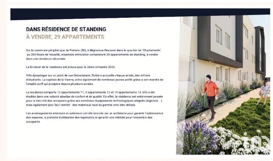 Iad France - Nacer Embouazza (06 51 53 07 86) vous propose : Construction d'une résidence Neuve sur le campus universitaire de proche du CHU de POITIERS avec une livraison prévue pour le 2ème trimestre 2025. Cette résidence avec ascenseur se compose de 29 appartements dont 12 T1,3 T2 et 14 T3 avec un stationnement privatif pour chacun. La résidence est sécurisée par un portail automatique. Description des appartements T3 : Chauffage individuel au sol avec chaudière Gaz, isolation aux dernières normes donc faibles charges d'énergie, huisserie double vitrage isolant, volets roulants électriques, peinture blanche lisse sur les murs, WC suspendu de la marque 'Grohé', cuisine aménagée et équipée (réfrigérateur, four, plaque de cuisson et hotte), placards aménagés, salle d'eau équipée (séche serviette, double vasque avec miroir panoramique). Les logements sont vendus 'clés en mains', à vous de choisir comment meubler le mieux possible, 3 choix de couleur possible concernant le sol. Les avantages de l'achat dans le Neuf : Frais de notaire réduits, éxonératon taxe foncière les premières années, aucun travaux à prévoir pendant de nombreuses années, Bâtiment aux dernières normes énergétiques (DPE en A), Facilité de location : aucune objection possible sur l'état du logement de la part des futurs locataires. Bâtiment sous garantie décennale (10 ans). Contactez-moi pour plus d'information ! Honoraires d’agence à la charge du vendeur. Bien non soumis au DPE. Les informations sur les risques auxquels ce bien est exposé sont disponibles sur le site Géorisques : www.georisques.gouv.fr. La présente annonce immobilière a été rédigée sous la responsabilité éditoriale de M. Nacer Embouazza EI (ID 50337), mandataire indépendant en immobilier (sans détention de fonds), agent commercial de la SAS I@D France immatriculé au RSAC de POITIERS sous le numéro 890003684, titulaire de la carte de démarchage immobilier pour le compte de la société I@D France SAS. Retrouvez tous nos biens sur notre site internet. www.iadfrance.fr.