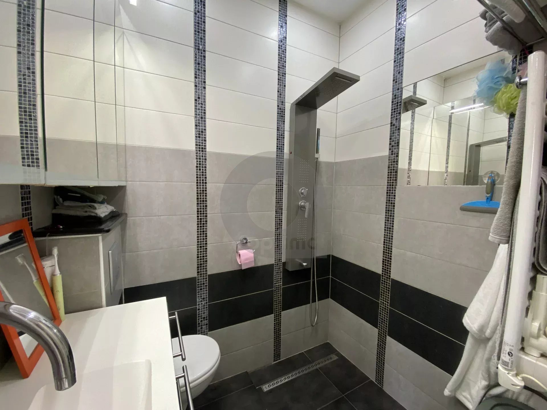 Upper level: one bedroom and a sleeping area, shower room with WC, storage area. Beautiful unobstructed view over the roofs of Menton.