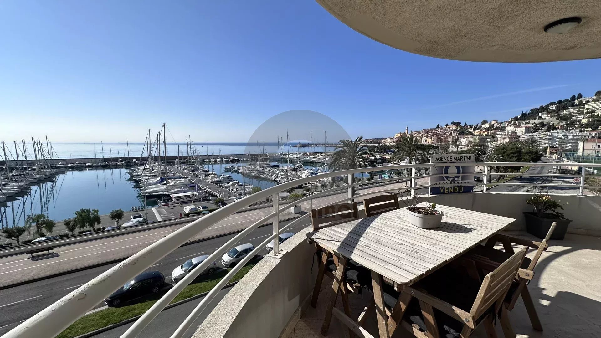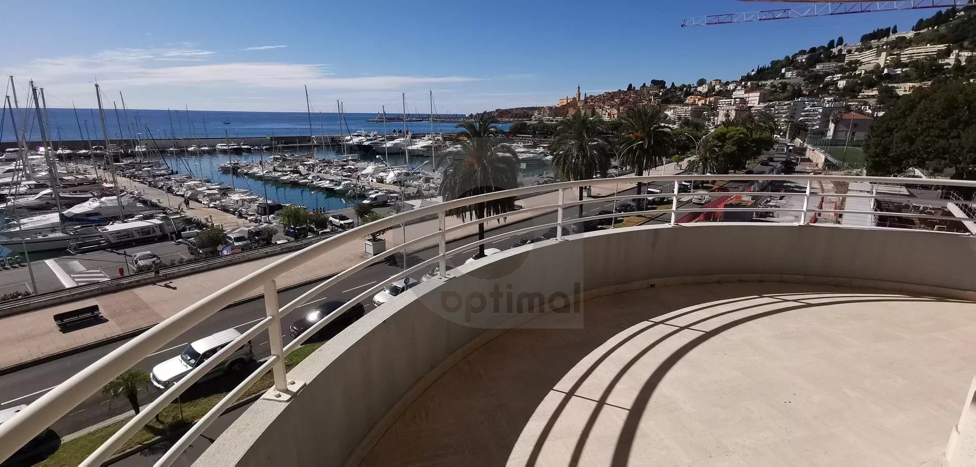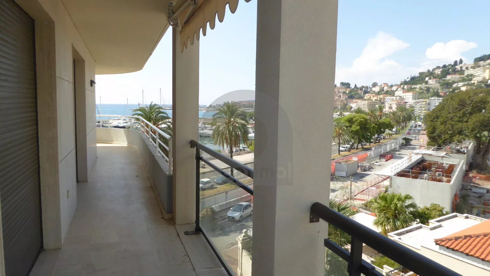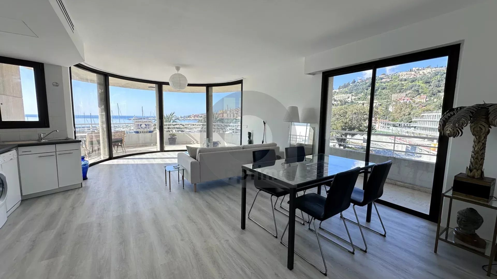 Our agency is offering a beautiful, recently renovated three-room apartment (63m²) with south and west exposure, located on the fourth floor of a modern, high-end residence facing the new port of Garavan. The apartment features integrated reversible air conditioning and includes: an entrance hall with cupboard, separate toilet, two bedrooms, hallway with wardrobe, open kitchen, and living room. There is also a magnificent circular terrace of approximately 22m² located next to the bedrooms and living room with panoramic views of the sea, the harbour, the old town and the surrounding hills.