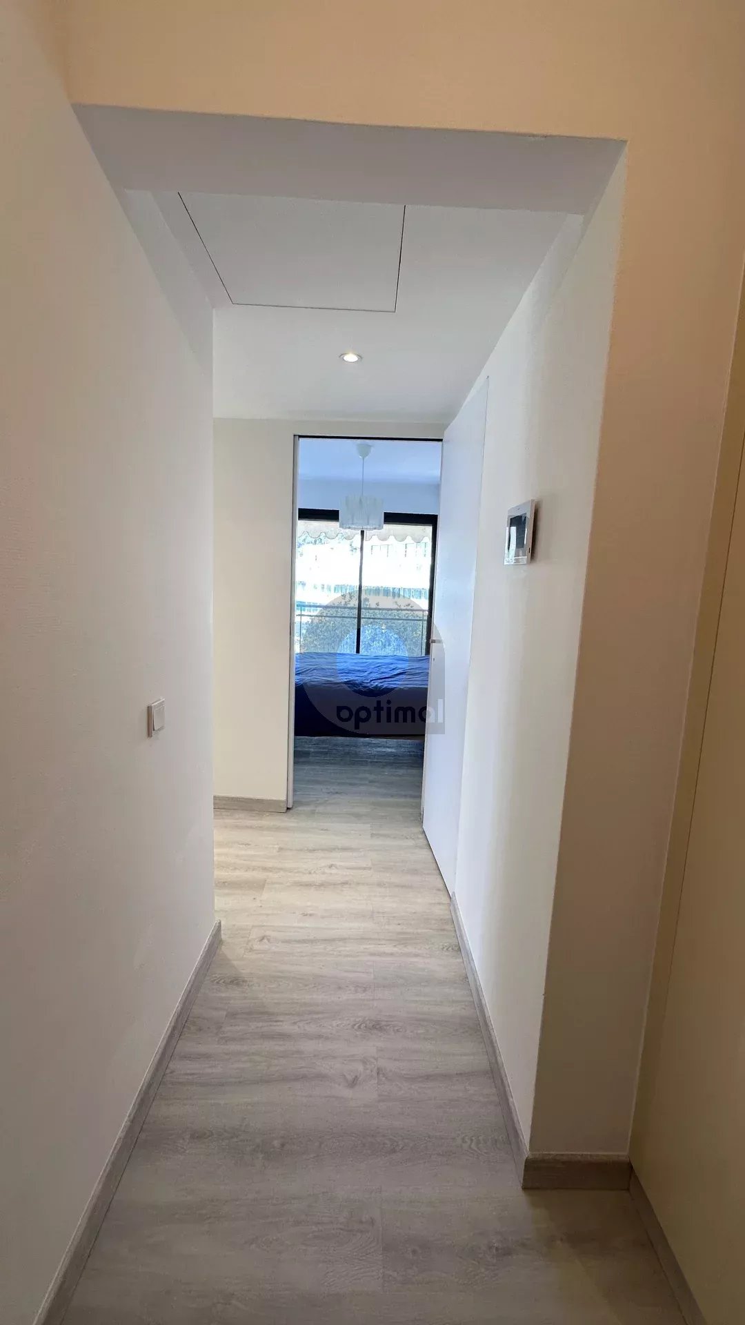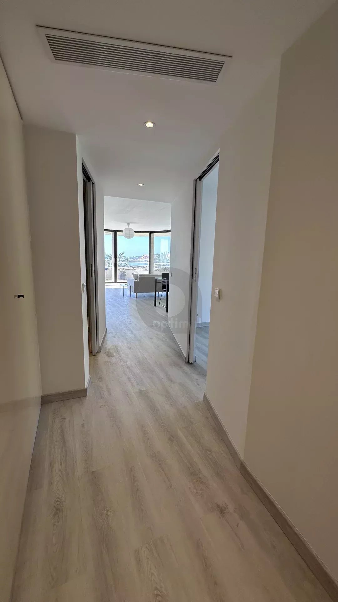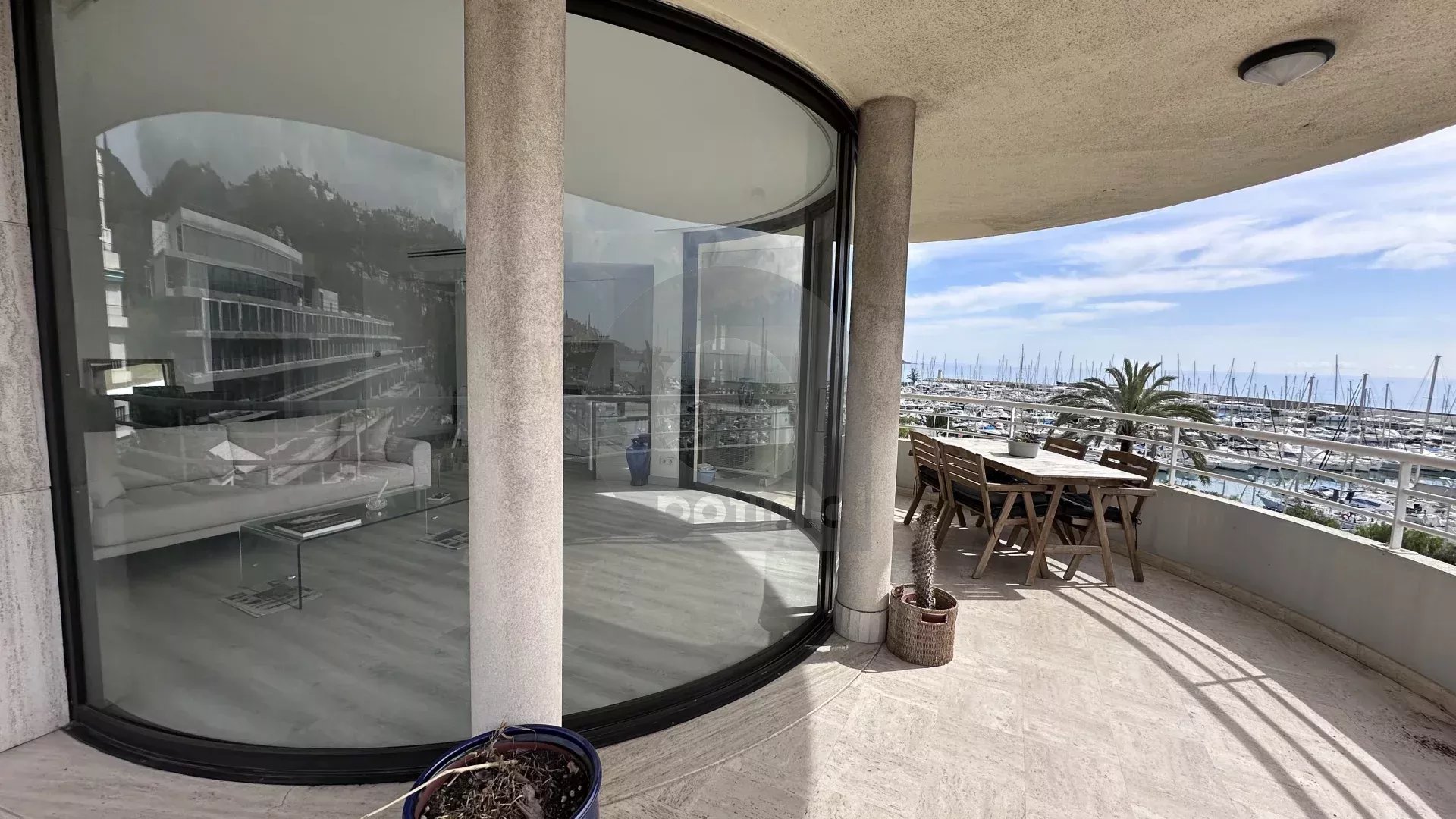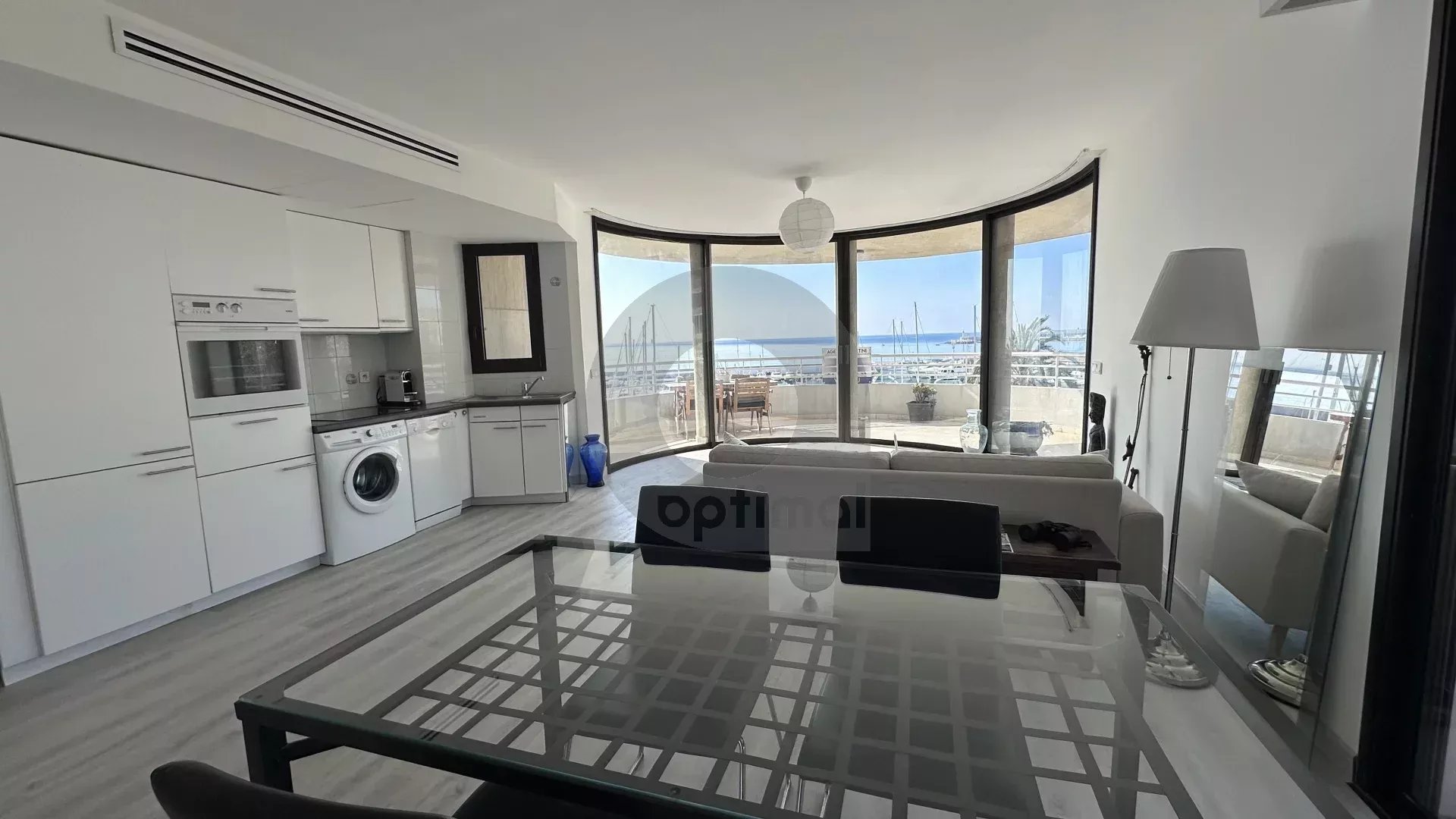 Our agency is offering a beautiful, recently renovated three-room apartment (63m²) with south and west exposure, located on the fourth floor of a modern, high-end residence facing the new port of Garavan. The apartment features integrated reversible air conditioning and includes: an entrance hall with cupboard, separate toilet, two bedrooms, hallway with wardrobe, open kitchen, and living room. There is also a magnificent circular terrace of approximately 22m² located next to the bedrooms and living room with panoramic views of the sea, the harbour, the old town and the surrounding hills.