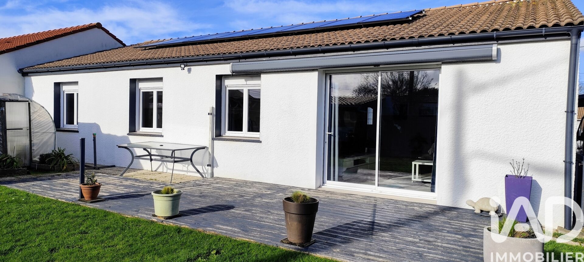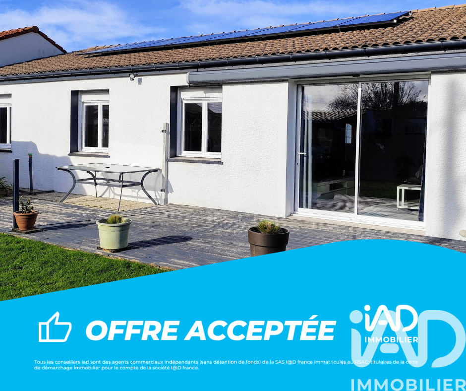 Iad France - Laurence Foucher vous propose : PLAIN PIED - 3 CHAMBRES - GARAGE - DPE C À découvrir, maison de plain-pied de 93 m², située dans un lotissement calme et agréable, à proximité immédiate du bourg et des équipements sportifs. La maison offre une belle pièce de vie traversante de 47 m², baignée de lumière, avec une cuisine ouverte conviviale. L’exposition plein sud permet à la maison de profiter d’un ensoleillement optimal, aussi bien dans le séjour que dans les trois chambres. L’espace nuit se compose en effet de trois chambres, d’une salle de bain équipée d’un sauna, et de WC indépendants. Un garage attenant de 18 m² complète l’ensemble. Côté confort et économies d’énergie, la maison est équipée de panneaux solaires sous garantie, la rendant autonome en électricité, ainsi que d’un chauffage unique aux granulés bois. Les menuiseries sont en PVC avec volets roulants électriques. À l’extérieur, le terrain de 678 m² entièrement clos accueille un préau, un carport pour abriter les véhicules, une annexe de rangement à l’arrière de la maison et un agréable espace potager. La situation est idéale : commerces à 1 km, terrains et salle de sport à seulement 400 mètres, dans un environnement calme et facile d’accès. Aucun gros travaux à prévoir. Une maison fonctionnelle, lumineuse et agréable à vivre, offrant en plus un véritable espace bien-être à domicile. Honoraires d'agence à la charge du vendeur. Information d'affichage énergétique sur ce bien : classe ENERGIE C indice 130 et classe CLIMAT A indice 4. Les informations sur les risques auxquels ce bien est exposé, y compris l'obligation légale de débroussaillement, sont disponibles sur le site Géorisques : http://www.georisques.gouv.fr. La présente annonce immobilière a été rédigée sous la responsabilité éditoriale de Mme Laurence Foucher mandataire indépendant en immobilier (sans détention de fonds), agent commercial de la SAS I@D France immatriculé au RSAC de NANTES sous le numéro 948679923, titulaire de la carte de démarchage immobilier pour le compte de la société I@D France SAS.