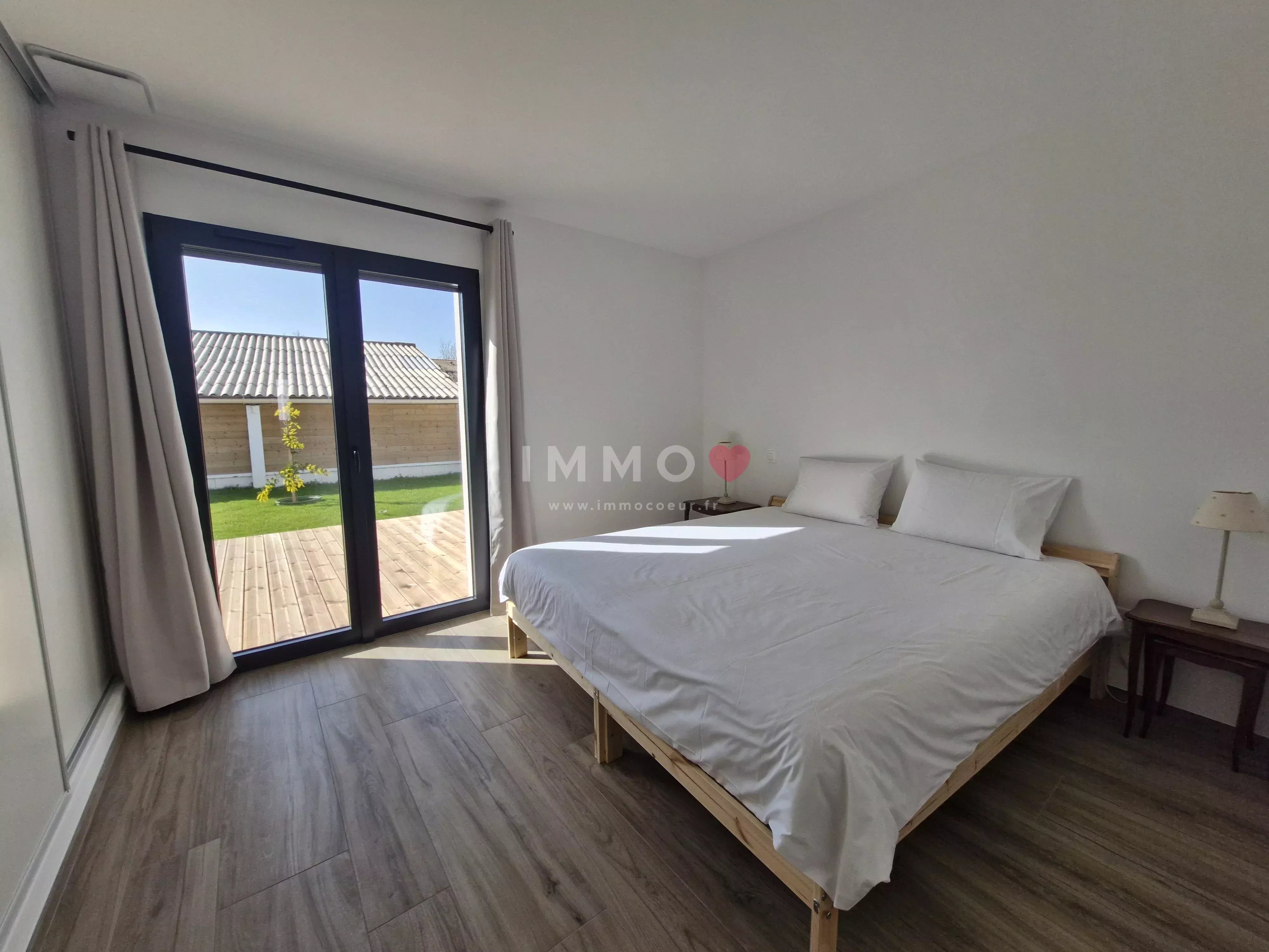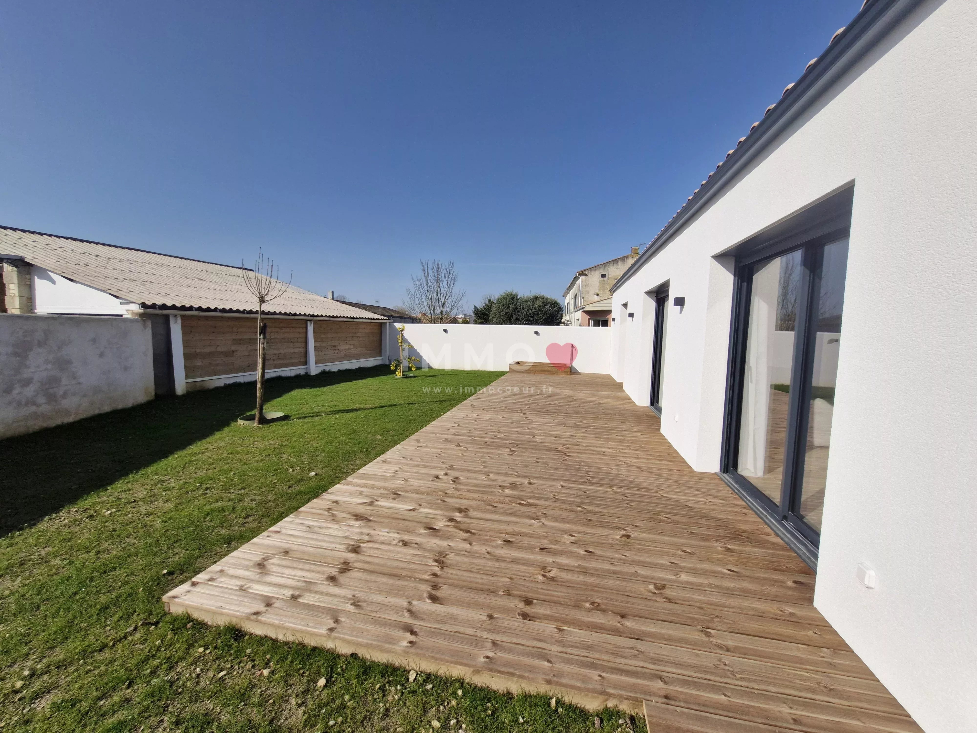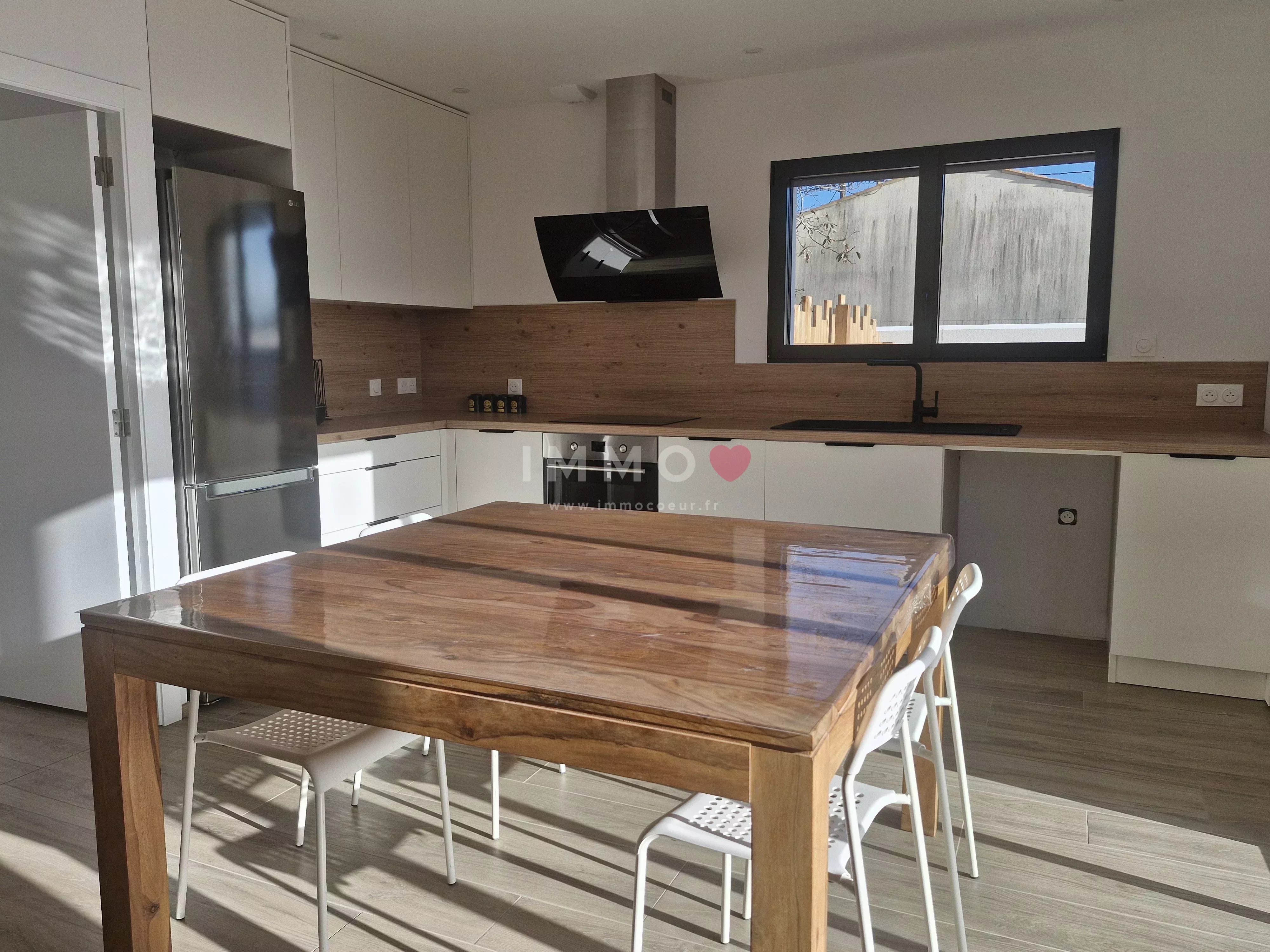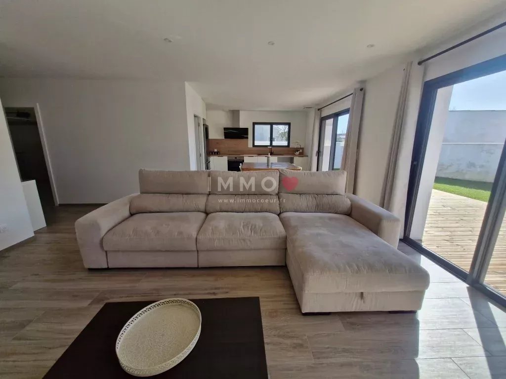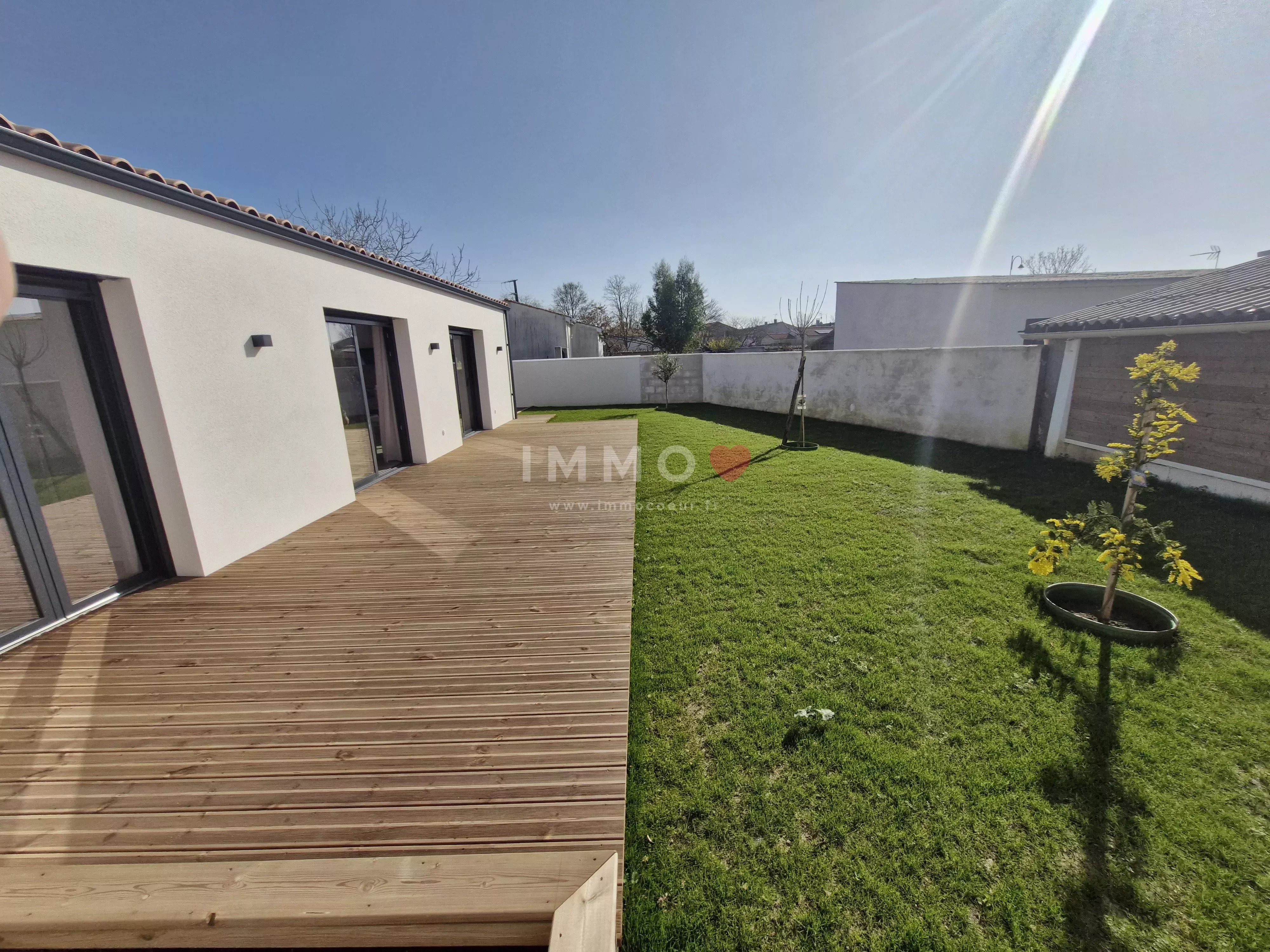Entre LA ROCHELLE et NIORT, à FERRIERES, plain-pied neuf, meublé, offrant une belle pièce de vie exposée plein sud, cuisine ouverte aménagée et équipée, cellier, 3 chambres, salle d'eau, toilettes, garage, 2 emplacements de stationnement, terrasse bois et jardin clos.