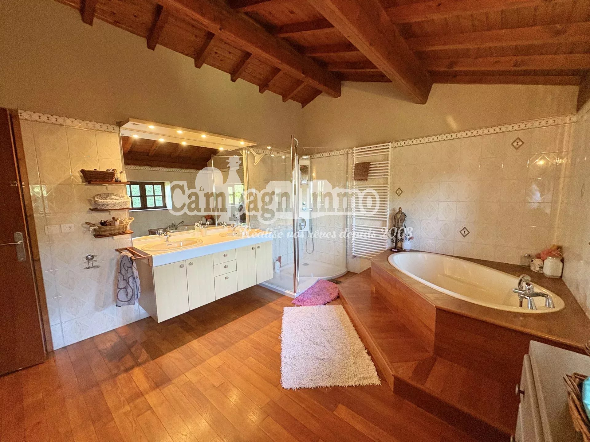 A l'étage se situe le coin nuit avec trois chambres dont une avec un spacieux dressing ainsi qu'une grande salle de bains avec douche et baignoire.