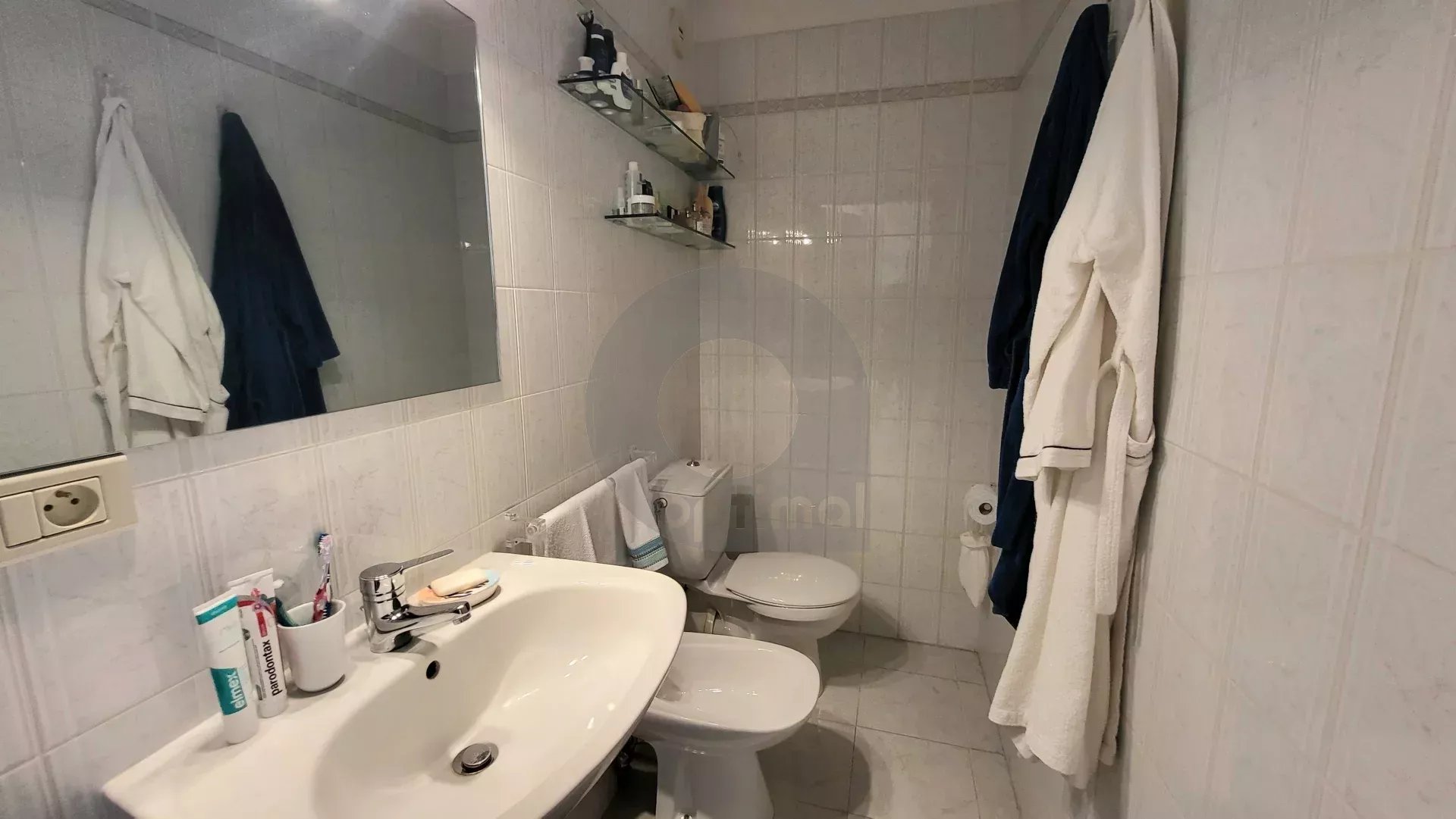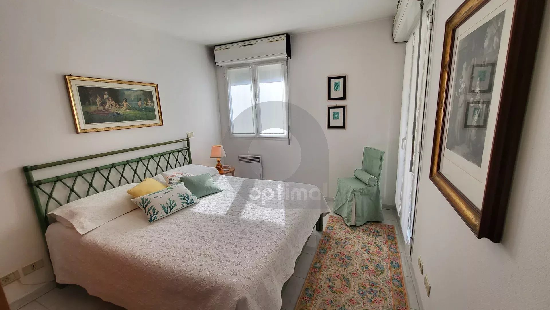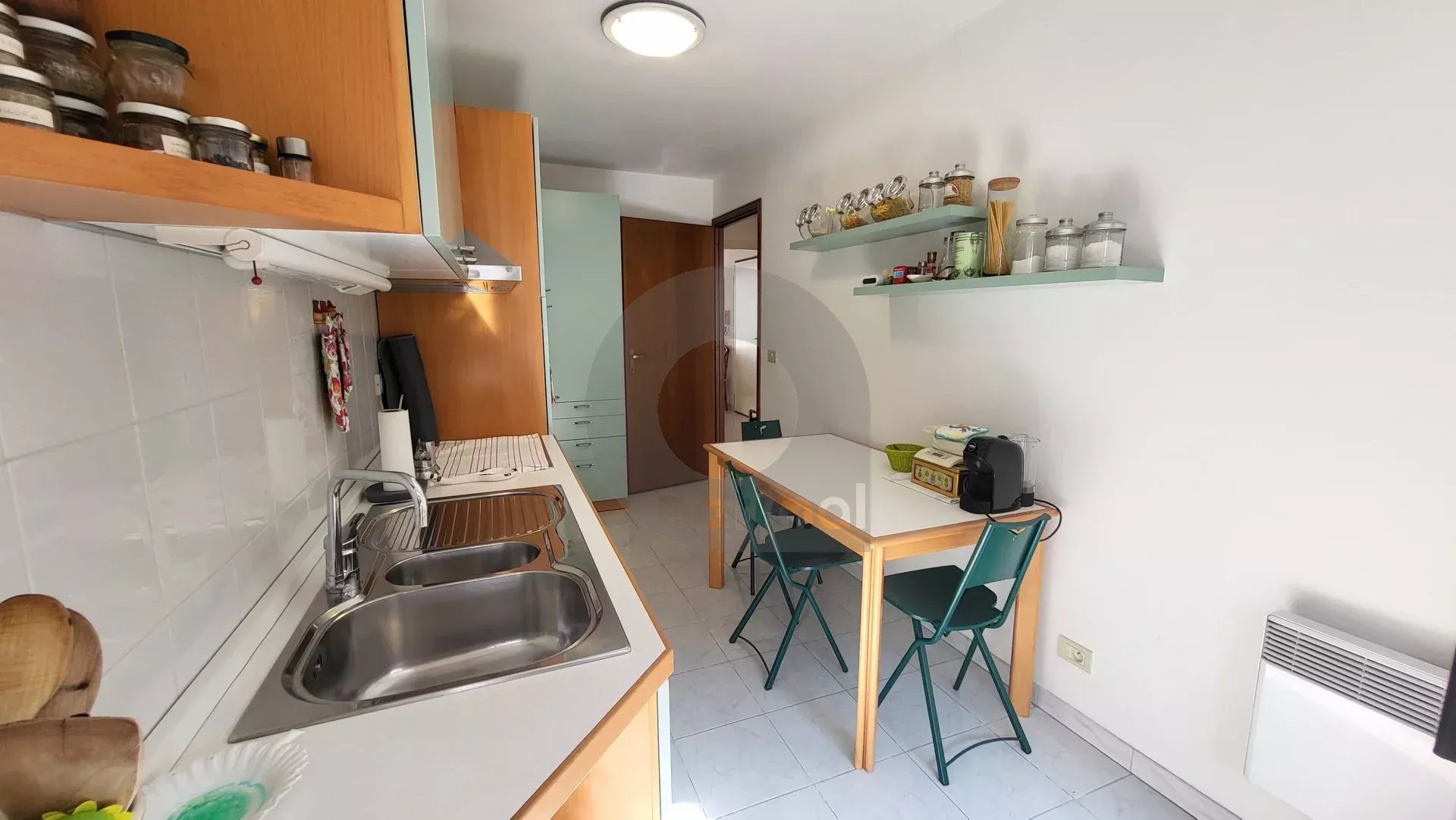 The apartment consists of a bright living room opening onto a east-facing terrace, a fully equipped kitchen opening onto a second south-west facing terrace, two quiet bedrooms, a bathroom with toilet, and a separate WC with a bidet and washbasin.