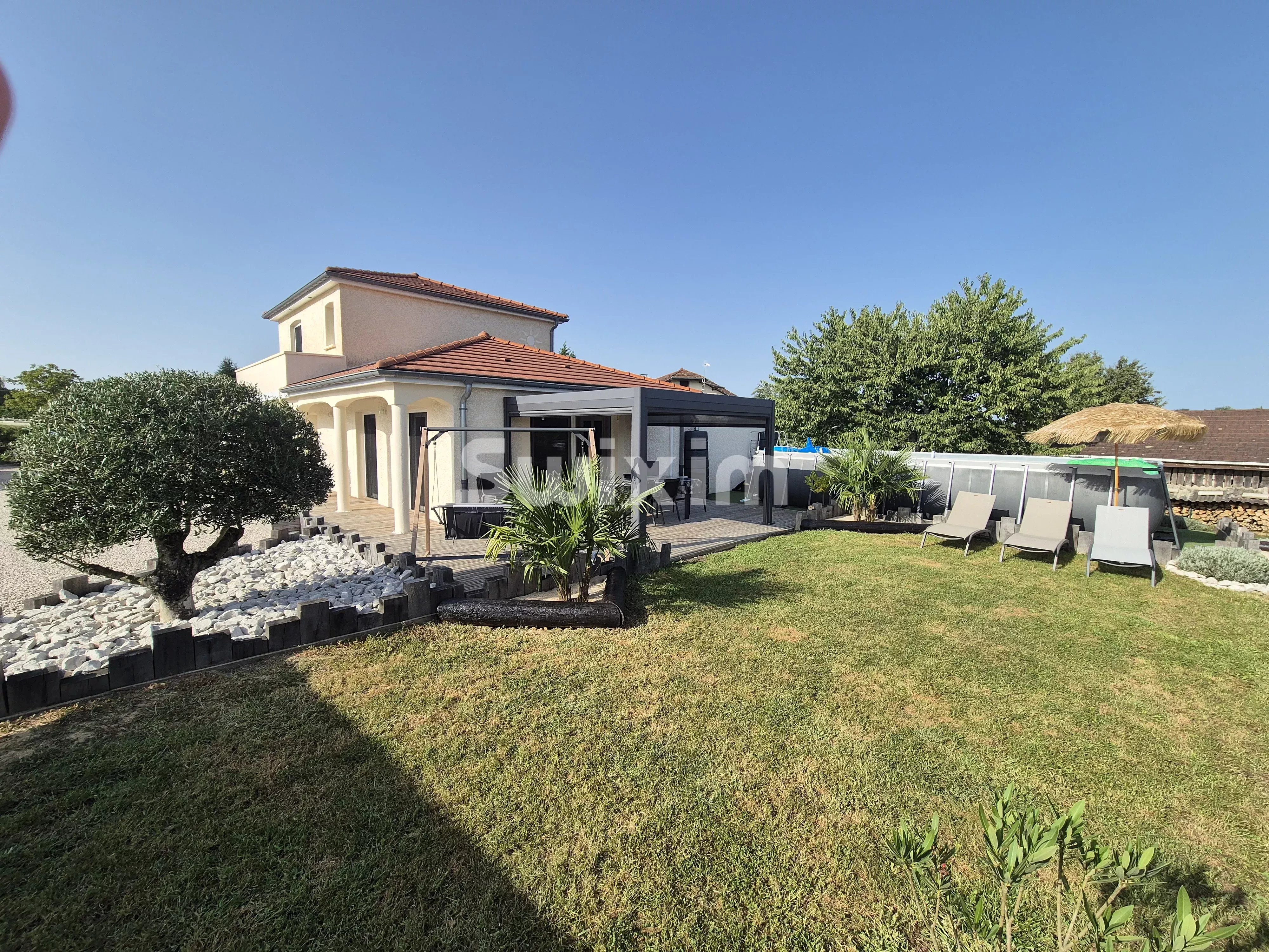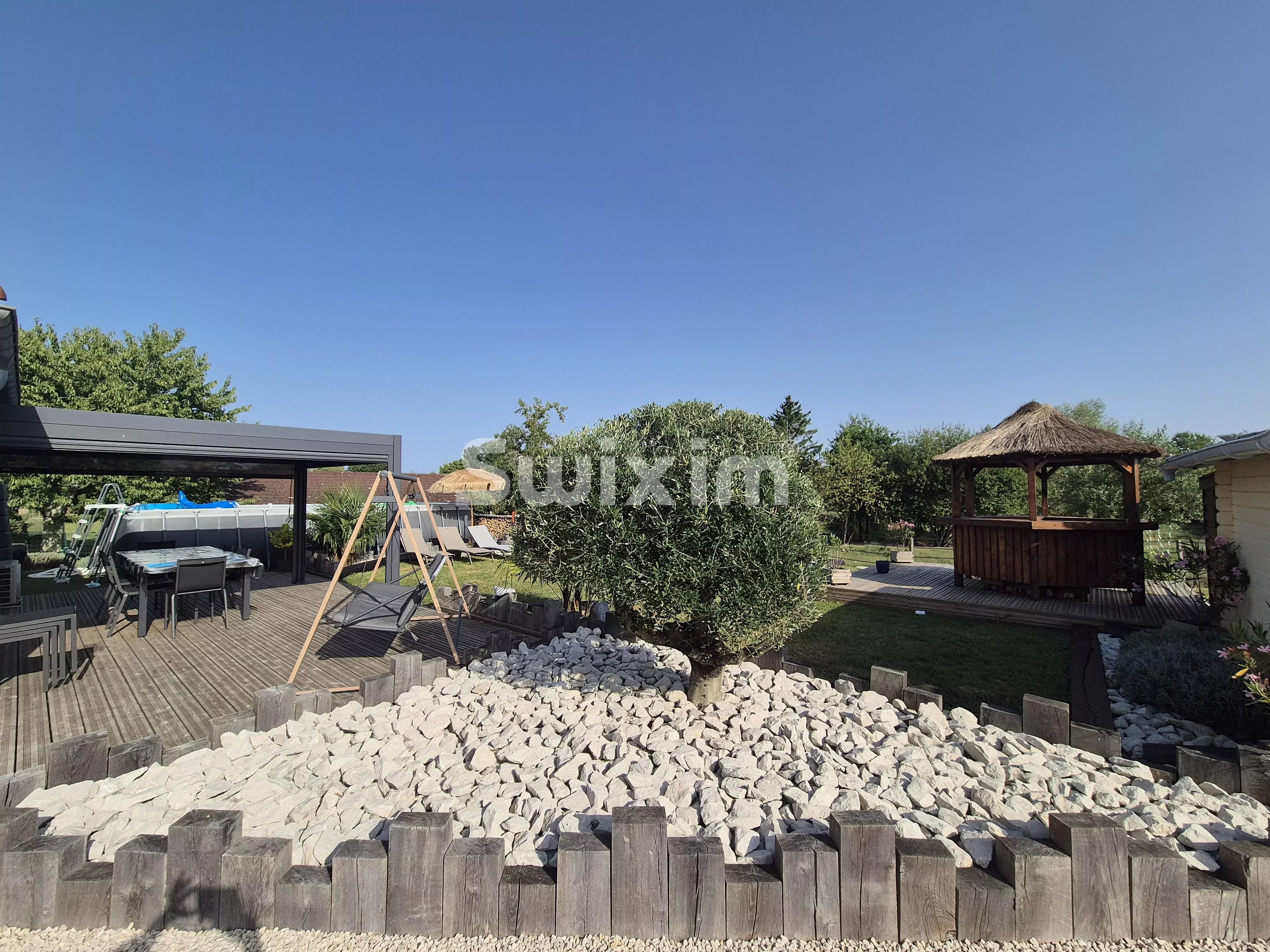 Réf 19280AA : Dans un cadre bucolique, maison pleine de charme d'un style provençal, nichée sur 5 500 m² de terrain arboré avec petite mare. Des espaces intérieurs modernes et épurés. Elle se compose au rdc: Une grande pièce de vie, deux chambres, une salle de bain, toilettes, buanderie, cellier. A l'étage: Trois chambres, dont une chambre d'enfant, une salle de douche avec toilettes intégrées. Pergola. Piscine. Garages de 20 et 85 m², possibilité de 2 hectares supplémentaires Chalet avec eau, électricité, toilettes, etc.....