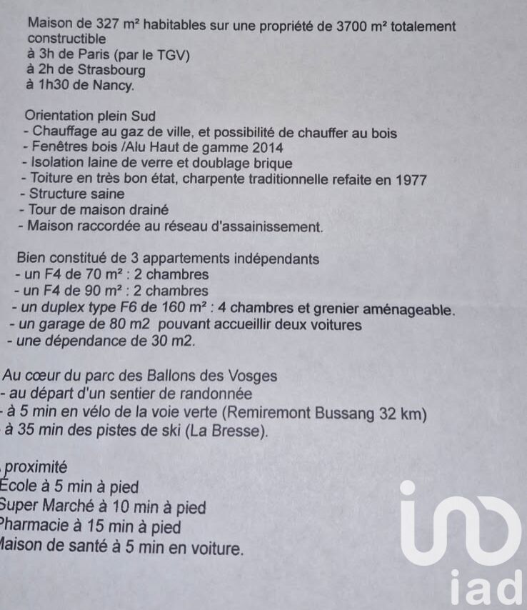 Iad France - Bernard Gamel vous propose : Honoraires d'agence à la charge du vendeur. Information d'affichage énergétique sur ce bien : classe ENERGIE G indice 493 et classe CLIMAT F indice 98. Les informations sur les risques auxquels ce bien est exposé, y compris l'obligation légale de débroussaillement, sont disponibles sur le site Géorisques : http://www.georisques.gouv.fr. La présente annonce immobilière a été rédigée sous la responsabilité éditoriale de M Bernard Gamel mandataire indépendant en immobilier (sans détention de fonds), agent commercial de la SAS I@D France immatriculé au RSAC de EPINAL sous le numéro 334108875, titulaire de la carte de démarchage immobilier pour le compte de la société I@D France SAS.