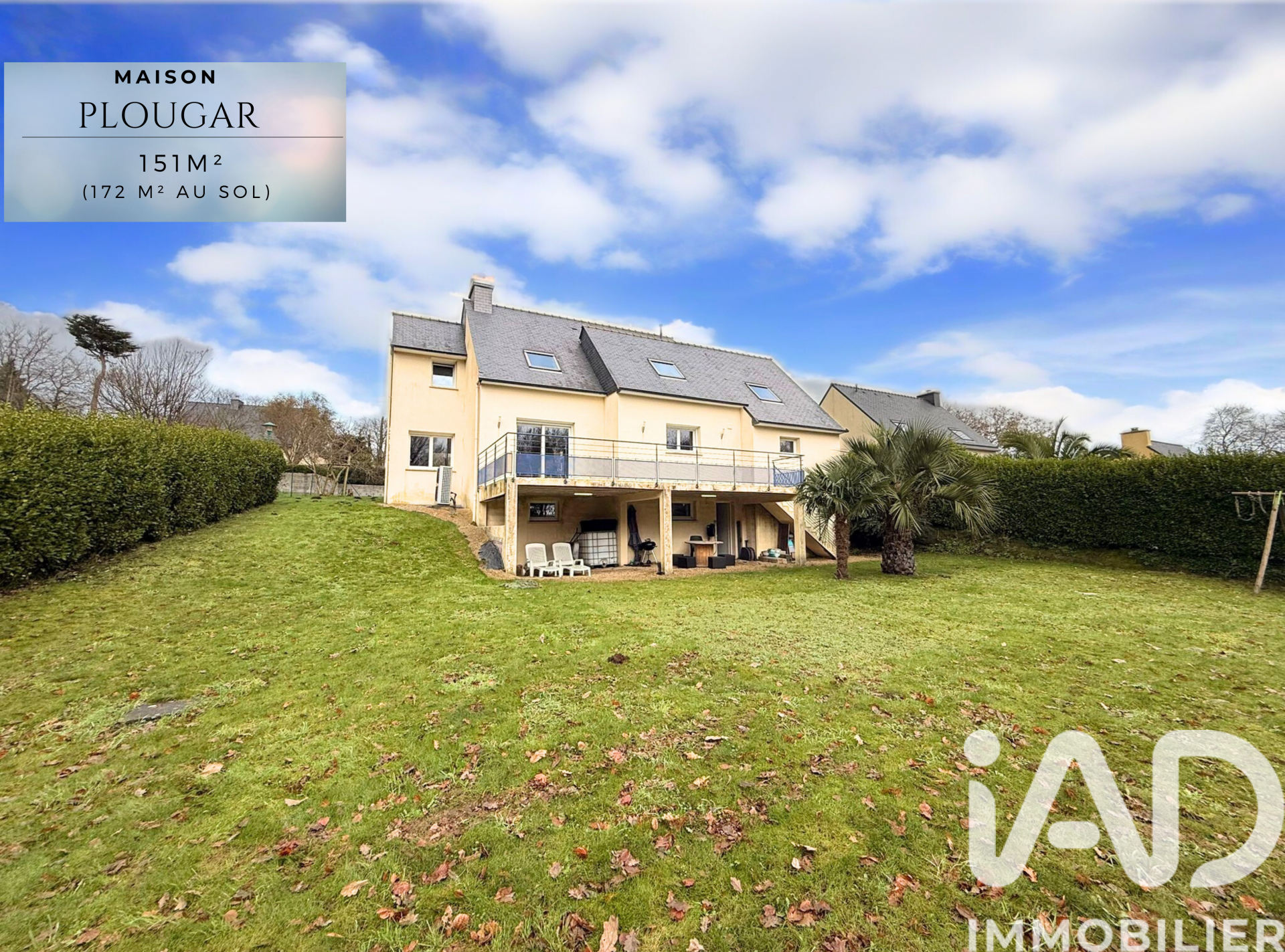 Iad France - Marta Person vous propose : Maison familiale contemporaine – 5 chambres– VIE DE PLAIN PIED-GARAGE-SOUS-SOL TOTAL A visiter sans tarder ! Nichée au cOEur d’une impasse boisée, cette maison offre un cadre de vie paisible et naturel, tout en restant proche des commodités. Avec ses 151 m² habitables (171 m² utiles ), elle séduit par ses volumes généreux, sa luminosité et son environnement privilégié. Le terrain de 1 400 m² s’ouvre sur un paysage verdoyant, avec des chemins de randonnée en contrebas, parfaits pour les amoureux de la nature. Dès l’entrée, la maison dévoile une belle pièce de vie composée d’un salon et d’une salle à manger lumineux. La salle à manger est ouverte directement sur une terrasse sur pilotis de 30 m², offrant une superbe vue dégagée sur la verdure et les arbres, sans vis-à-vis, idéale pour profiter du calme et des beaux jours. La cuisine ouverte, aménagée et équipée s’intègre parfaitement à l’espace de vie et dispose d’un accès direct au garage, apportant un réel confort au quotidien. Le rez-de-chaussée comprend également une chambre spacieuse avec placard, une salle d’eau avec douche à l’italienne ainsi qu’un WC séparé. À l’étage, une mezzanine ouverte offre un espace polyvalent pouvant servir de bureau ou de coin détente. Les QUATRE chambres, toutes équipées de placards intégrés et mesurant entre 10 et 13 m², permettent d’accueillir confortablement toute la famille. Une grande salle de bains ainsi qu’un WC séparé complètent cet espace nuit. Le jardin est un véritable lieu de vie, pensé pour petits et grands, avec une cabane de jardin pour les enfants, un espace de grillades et de vastes espaces verts propices à la détente, le tout dans un environnement calme et naturel. Points forts & confort : Pompe à chaleur air / eau avec plancher chauffant Volets roulants électriques Possibilité d’installer un poêle à bois ou à granulés Garage avec porte motorisé Borne de recharge pour véhicule électrique Sous-sol de 73 m² avec aspirateur centralisé La commune de Plougar offre un cadre de vie recherché, alliant tranquillité, nature et proximité des commodités. Idéale pour les familles, elle séduit par son environnement verdoyant, ses infrastructures de proximité et son accès facilité aux axes routiers. Une maison rare, idéale pour les amoureux de la nature et du calme, à découvrir sans tarder. Honoraires d'agence à la charge du vendeur. Information d'affichage énergétique sur ce bien : classe ENERGIE C indice 117 et classe CLIMAT A indice 3. Les informations sur les risques auxquels ce bien est exposé, y compris l'obligation légale de débroussaillement, sont disponibles sur le site Géorisques : http://www.georisques.gouv.fr. La présente annonce immobilière a été rédigée sous la responsabilité éditoriale de Mme Marta Person mandataire indépendant en immobilier (sans détention de fonds), agent commercial de la SAS I@D France immatriculé au RSAC de Brest sous le numéro 904767589, titulaire de la carte de démarchage immobilier pour le compte de la société I@D France SAS.