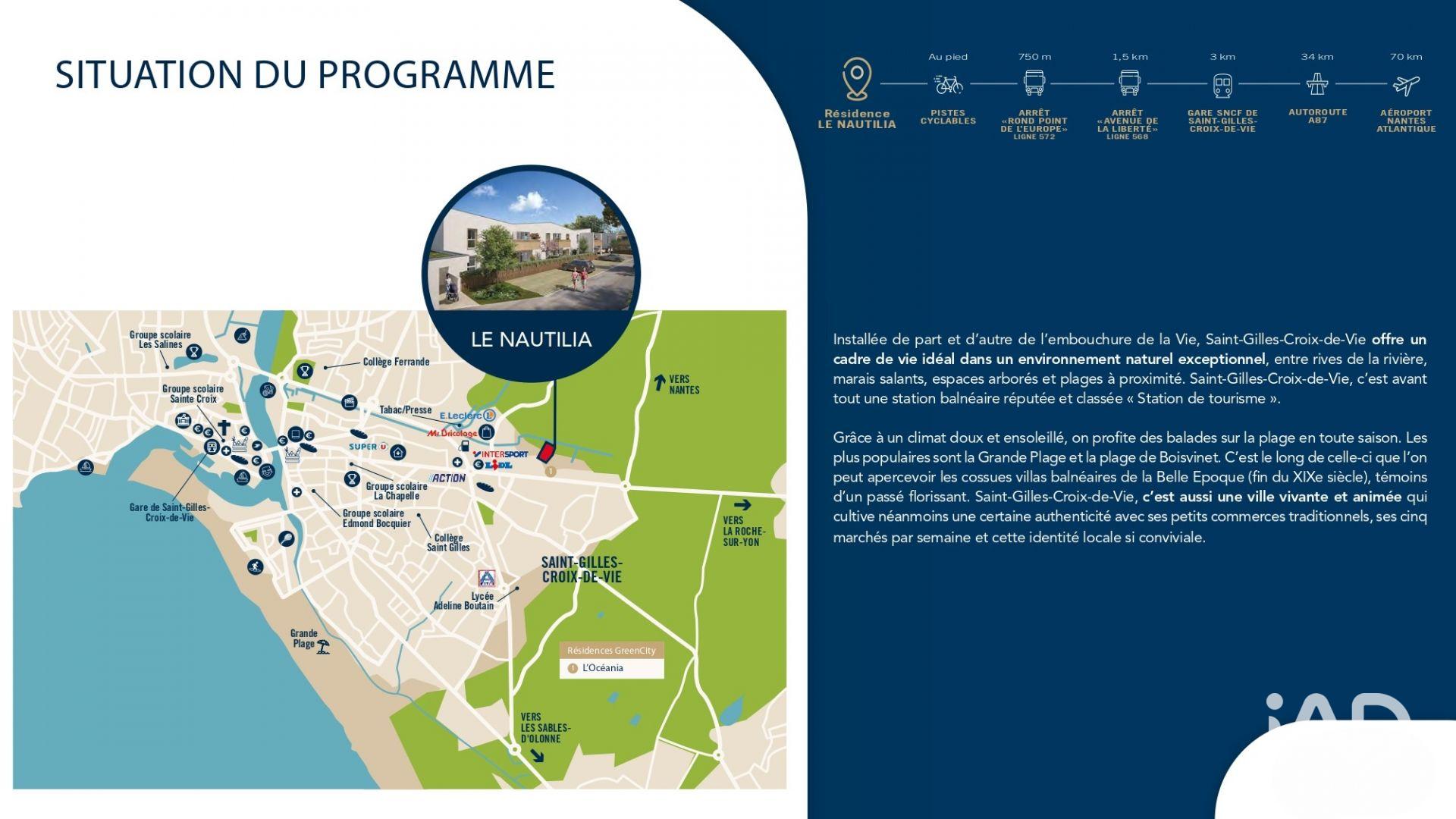 Iad France - Céline Blot (06 18 52 43 24) vous propose : Appartements neufs T3 – SEULEMENT 3 LOTS DISPONIBLES – Idéal investissement locatif – Résidence Le Nautilia – Saint-Gilles-Croix-de-Vie Éligible au dispositif LLI (Location à Loyer Intermédiaire), le programme neuf Le Nautilia représente une belle opportunité d’investissement sur la côte vendéenne. Idéalement située route de la Roche, à proximité du centre-ville, des commerces et à seulement 2,5 km des plages, la résidence offre un environnement à la fois calme, verdoyant et recherché. Les appartements neufs T3, d’environ 57 m² environ, sont situés au 1er étage uniquement et disposent de belles terrasses avec vues dégagées. Chaque logement séduit par ses volumes généreux, sa luminosité naturelle et ses prestations haut de gamme, avec isolation renforcée, certification NF Habitat et conformité à la RE2020, assurant confort durable et maîtrise énergétique. SEULEMENT 3 appartements sont encore disponibles ! Une belle opportunité pour un investissement locatif pérenne, alliant valorisation patrimoniale, fiscalité avantageuse et forte demande locative grâce au dispositif LLI. La résidence à taille humaine offre un parking privatif, un local vélos et des espaces verts arborés, gages de qualité de vie pour vos futurs locataires. À partir de 235 900 € Contactez-moi dès aujourd’hui pour obtenir plus d’informations sur le dispositif LLI et réserver votre appartement T3 au sein de la résidence Le Nautilia. Honoraires d’agence à la charge du vendeur. Bien non soumis au DPE. Les informations sur les risques auxquels ce bien est exposé sont disponibles sur le site Géorisques : www.georisques.gouv.fr. La présente annonce immobilière a été rédigée sous la responsabilité éditoriale de Mme Céline Blot EI (ID 65634), mandataire indépendant en immobilier (sans détention de fonds), agent commercial de la SAS I@D France immatriculé au RSAC de LA ROCHE SUR YON sous le numéro 909275216, titulaire de la carte de démarchage immobilier pour le compte de la société I@D France SAS. Retrouvez tous nos biens sur notre site internet. www.iadfrance.fr.