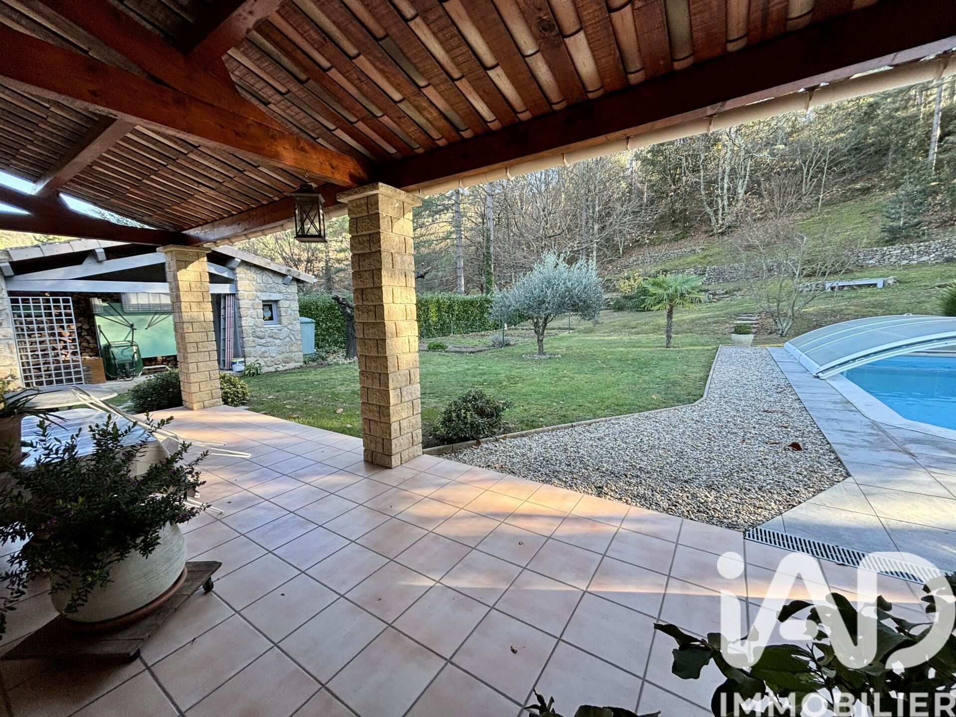 Iad France - Pascaline BONNETON vous propose : Située sur la commune de Fabras, à moins de deux minutes du village de Jaujac, cette charmante maison de plain-pied construite en 1997 vous séduira par son excellent état d’entretien et son environnement calme et agréable. Elle est implantée sur une parcelle entièrement aménagée de 2 300 m², joliment arborée, avec une piscine couverte, un abri de jardin, ainsi qu'une réserve d'eau de 3000 litres. L’intérieur se compose d’une entrée, d’un séjour-salon avec une cuisine aménagée, le tout ouvert sur une agréable terrasse couverte idéale pour les beaux jours. L’espace nuit offre deux chambres ainsi qu’un bureau pouvant faire office de petite chambre supplémentaire, une salle d'eau et un toilette séparé. Un garage complète l’ensemble. À l’étage, une petite chambre indépendante sous les toits permet d’accueillir ponctuellement famille ou amis, ou d’aménager un espace supplémentaire selon vos besoins. Côté confort, la maison est équipée d’un chauffage électrique ainsi que d’un poêle à bois Godin, apportant chaleur et convivialité. Une maison très bien entretenue, fonctionnelle et agréable à vivre, idéale en résidence principale comme en résidence secondaire, dans un secteur recherché à proximité immédiate de Jaujac. Honoraires d'agence à la charge du vendeur. Information d'affichage énergétique sur ce bien : classe ENERGIE D indice 223 et classe CLIMAT B indice 7. Les informations sur les risques auxquels ce bien est exposé, y compris l'obligation légale de débroussaillement, sont disponibles sur le site Géorisques : http://www.georisques.gouv.fr. La présente annonce immobilière a été rédigée sous la responsabilité éditoriale de Mme Pascaline BONNETON mandataire indépendant en immobilier (sans détention de fonds), agent commercial de la SAS I@D France immatriculé au RSAC de AUBENAS sous le numéro 840110407, titulaire de la carte de démarchage immobilier pour le compte de la société I@D France SAS.
