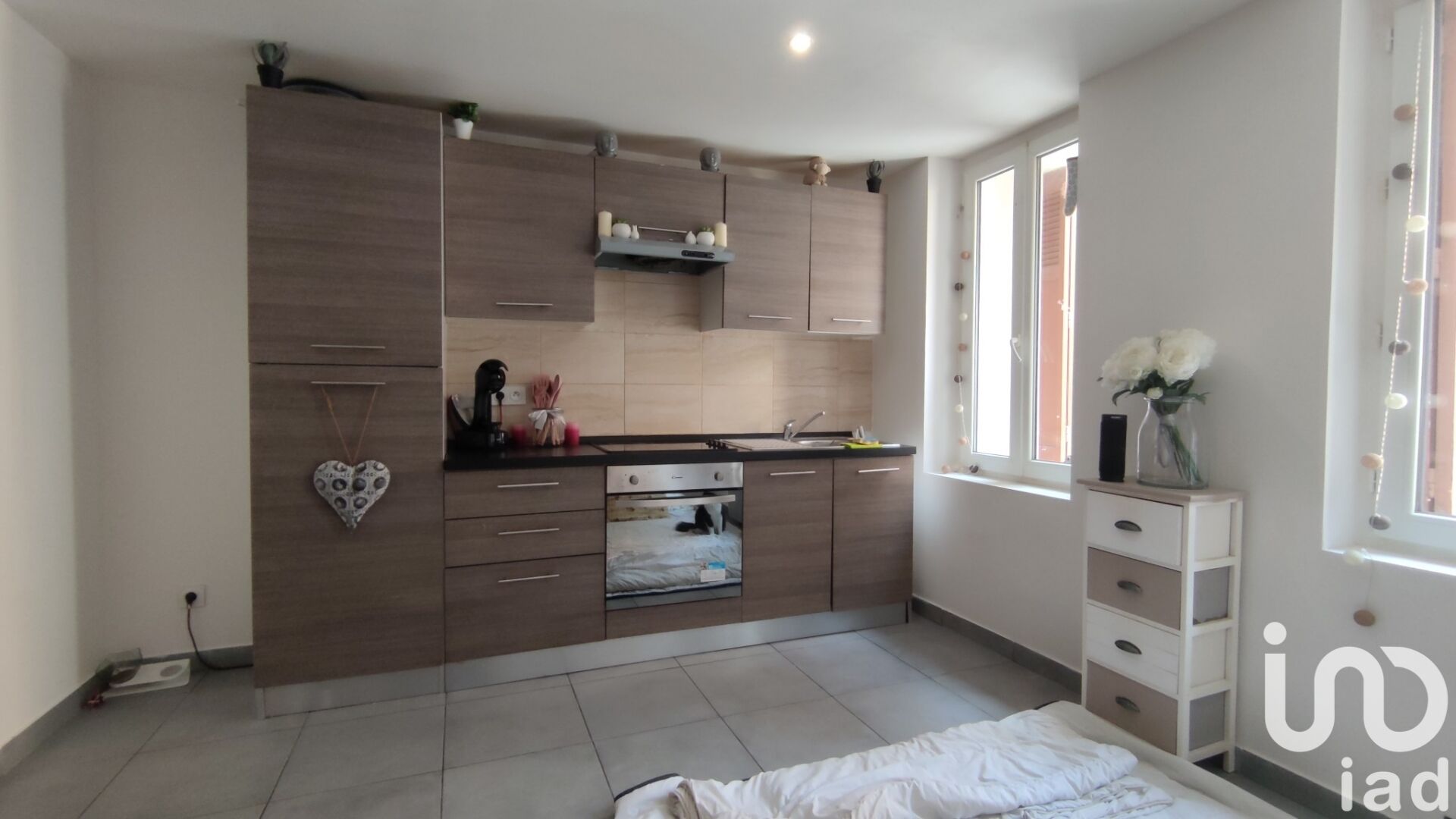 D'une cuisine équipée d'un évier, meuble de rangement haut et bas, une plaque vitrocéramique à 2 feux, branchement lave-linge, bandeau leds.
