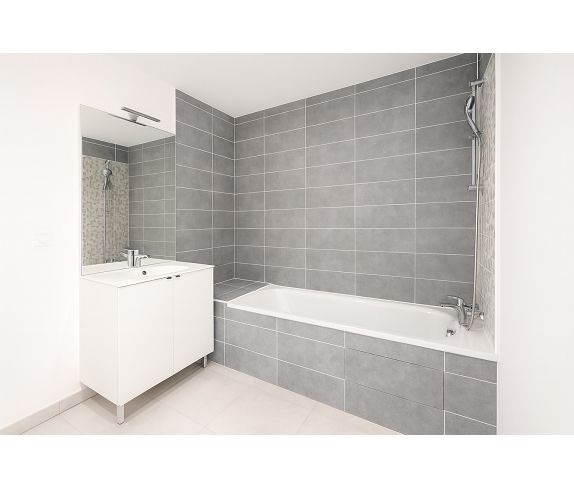 Ce T2 de 37m2, neuf et déjà disponible, dispose d'un séjour/cuisine ouvrant sur la terrasse, la cuisine est meublée et équipée.
