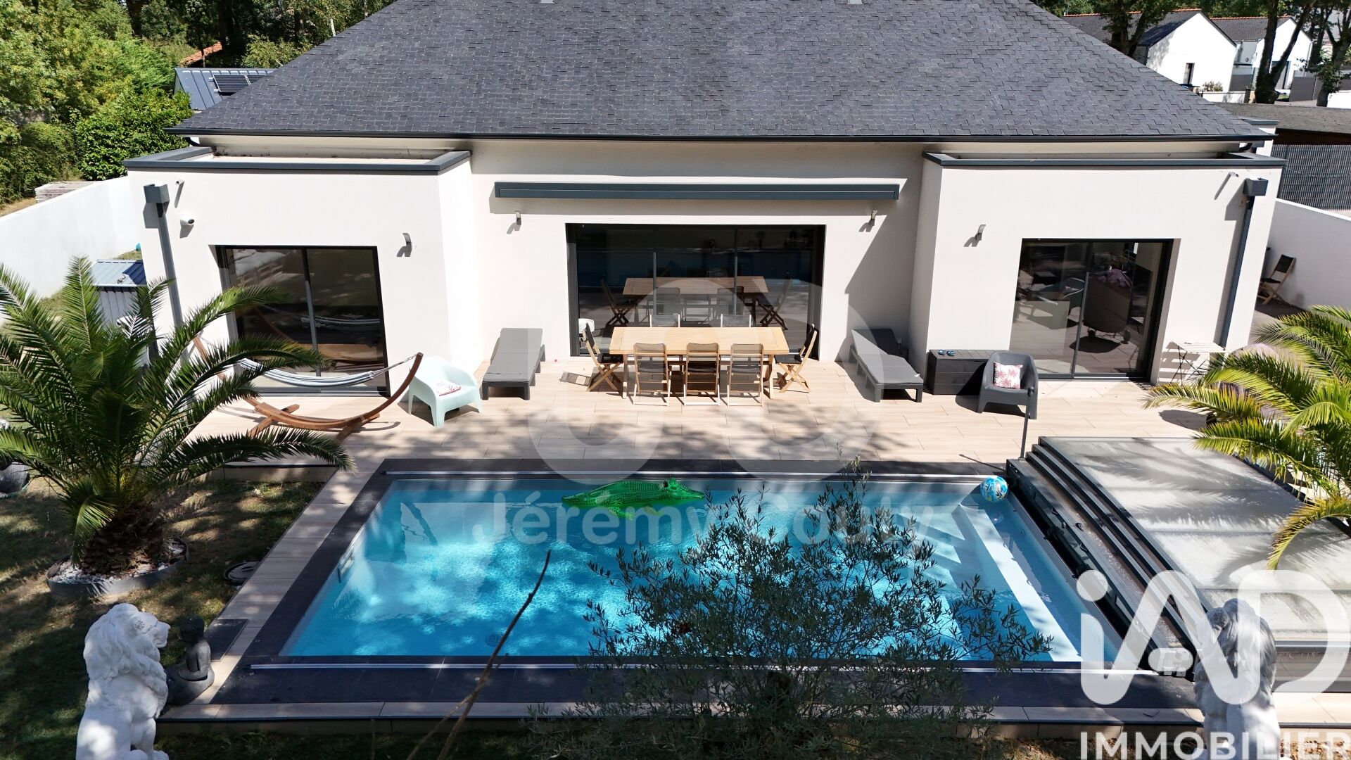 Iad France - Jeremy Couty vous propose : Exclusivité – Opportunité rare à Savenay - Offre en cours ! Maison contemporaine récente – Plain-pied – 5 chambres – Piscine chauffée – Clé en main Vous recherchez une maison récente, sans travaux, performante énergétiquement, où il suffit de poser ses valises ? Cette maison contemporaine de 2021, située à seulement 3 km du centre-ville de Savenay et des commerces de proximité, offre un cadre de vie idéal, alliant calme et accessibilité. Implantée dans un environnement paisible et verdoyant, à proximité du lac, elle permet de profiter d’un cadre naturel tout en restant à quelques minutes des commodités essentielles. Un intérieur lumineux et parfaitement agencé : Développant 152 m² habitables, la maison séduit par ses volumes généreux et sa luminosité. Le séjour de 60 m², largement ouvert par de grandes baies vitrées, donne accès à une terrasse exposée sud-ouest, équipée d’une banne électrique avec éclairage, idéale pour profiter pleinement des extérieurs. La cuisine contemporaine, entièrement aménagée et équipée, dispose de nombreux rangements et d’une arrière-cuisine fonctionnelle, avec accès direct au garage attenant. Un espace nuit adapté à la vie de famille. La maison propose cinq chambres, toutes avec rangements, dont une suite parentale avec dressing sur mesure et salle d’eau privative. Une salle de bains soignée, comprenant baignoire, douche à l’italienne et double vasque, ainsi qu’un WC indépendant, complète l’espace nuit. Un extérieur pensé pour le plaisir et la simplicité : Le terrain clos de 650 m², soigneusement aménagé, accueille une piscine chauffée et sécurisée par un dôme, permettant d’en profiter sur une grande partie de l’année. Terrasse carrelée, moustiquaires, store-banne avec éclairage LED, jardin facile d’entretien, murs de clôture et portail motorisé composent un extérieur fonctionnel et agréable. Confort moderne et sérénité : Construite selon les normes RE 2020, la maison bénéficie d’un DPE classé A, d’un chauffage au sol par aérothermie, de la fibre et d’un assainissement individuel conforme. Un bien récent offrant confort, économies d’énergie et tranquillité d’esprit, sans travaux à prévoir. Localisation maîtrisée, pas de surprise : Située à 3 km du centre-ville de Savenay, des commerces, des écoles et des services médicaux, la maison profite également de la proximité immédiate du ramassage scolaire, un véritable atout pour une vie de famille organisée. Cette maison représente aujourd’hui une opportunité rare sur le secteur pour un bien aussi complet : plain-pied récent, cinq chambres, piscine chauffée et performance énergétique optimale. Contactez-moi dès maintenant pour organiser une visite. Honoraires d'agence à la charge du vendeur. Information d'affichage énergétique sur ce bien : classe ENERGIE A indice 32 et classe CLIMAT A indice 1. Les informations sur les risques auxquels ce bien est exposé, y compris l'obligation légale de débroussaillement, sont disponibles sur le site Géorisques : http://www.georisques.gouv.fr. La présente annonce immobilière a été rédigée sous la responsabilité éditoriale de M Jeremy Couty mandataire indépendant en immobilier (sans détention de fonds), agent commercial de la SAS I@D France immatriculé au RSAC de SAINT-NAZAIRE sous le numéro 890110471, titulaire de la carte de démarchage immobilier pour le compte de la société I@D France SAS.