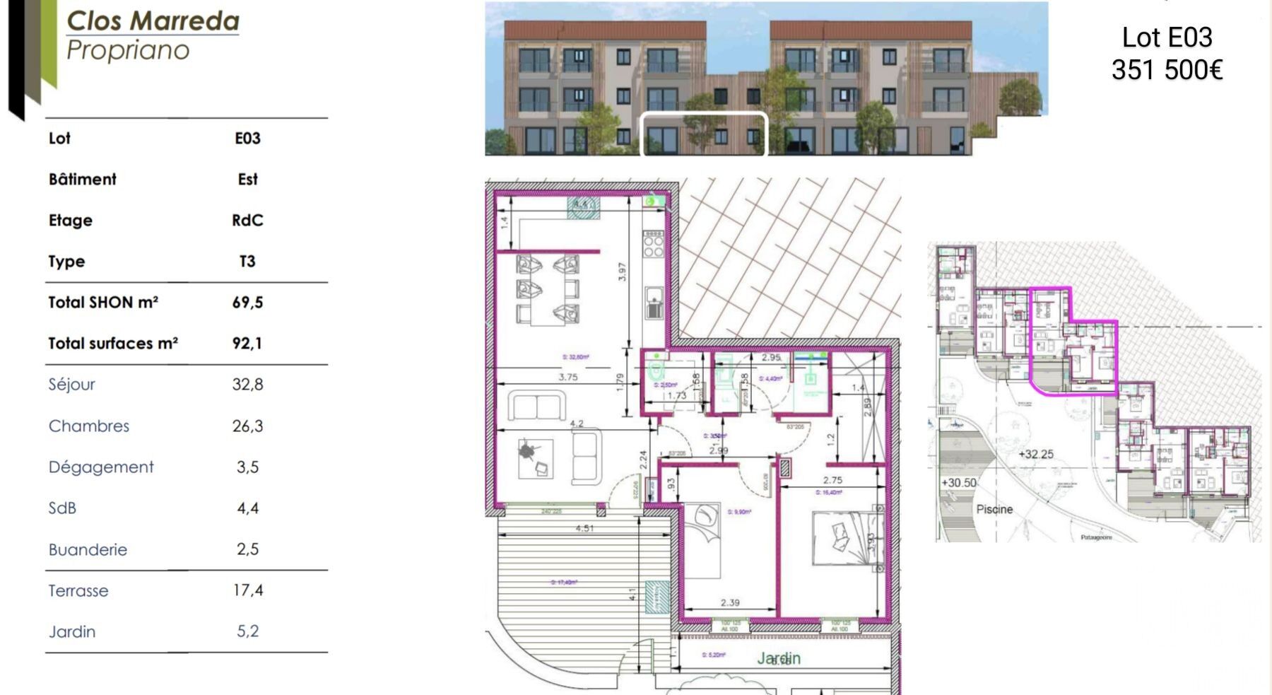 Iad France - Eloïse Ojea (06 24 77 57 73) vous propose : Découvrez ce magnifique appartement T3 de 69,5 m² environ en rez-de-chaussée, doté d'une terrasse de 17 m² environ et d'un jardin de 5 m² environ, orienté à l'ouest. Au sein de cette charmante Résidence “Le Clos Maredda”, disposant de 30 lots répartis dans 3 bâtiments, agencés autour d’un jardin et d’une piscine. Vue mer pour la plupart des appartements qui sont tous traversants et disposant d’une pergola ombragée. La résidence est située à Propriano, une ville idéalement positionnée à mi-chemin entre l'aéroport d'Ajaccio et de Porto Vecchio, accessible en moins d'une heure. Édifiée sur les hauteurs du centre historique, dans un environnement calme et à seulement 1km du port, cet appartement T3 que nous vous proposons est une véritable opportunité pour profiter de la vie en bord de mer, tout en bénéficiant des commodités et des richesses naturelles de la région. C'est une occasion à ne pas manquer pour vivre ou investir dans un cadre enchanteur, entre mer et montagnes. Les bâtiments sont implantés sur le terrain, de façon à favoriser le rapport au sol naturel et offrir de beaux jardins. Cet étagement offre de magnifiques vues sur le golfe et minimise les vis-à-vis. Les stationnements sont en grande partie couverts et fermés afin de minimiser l’impact des voiries et stationnements extérieurs. Ainsi les espaces verts sont majoritairement présents. Les aménagements paysagés sont soignés afin de donner le sentiment de vivre dans un jardin. Au centre du projet, un parc arboré est conservé et amélioré, autour duquel la vie de la communauté s’organise avec espaces de rencontre et de repos. Cette résidence s'inscrit pleinement dans une démarche de qualité environnementale. Le chauffage et la ventilation sont assurés par des pompes à chaleur couplées à des ballons d'eau chaude thermodynamiques, offrant un système peu énergivore et pilotable individuellement par chaque occupant. L'accessibilité a été soigneusement étudiée, avec un portillon piéton séparant les flux de circulation. Les clôtures en grillage sur murets enduits assurent la sécurité tout en préservant l'esthétisme. Box, place de parking et cave en option. Livraison pour le 1er trimestre 2025 N'hésitez pas à nous contacter pour obtenir plus d'informations et organiser une visite. Honoraires d’agence à la charge du vendeur. Bien non soumis au DPE. Les informations sur les risques auxquels ce bien est exposé sont disponibles sur le site Géorisques : www.georisques.gouv.fr. La présente annonce immobilière a été rédigée sous la responsabilité éditoriale de Mlle Eloïse Ojea EI (ID 7204), mandataire indépendant en immobilier (sans détention de fonds), agent commercial de la SAS I@D France immatriculé au RSAC de CRETEIL sous le numéro 909 600 330, titulaire de la carte de démarchage immobilier pour le compte de la société I@D France SAS. Retrouvez tous nos biens sur notre site internet. www.iadfrance.fr.