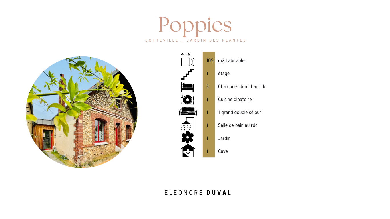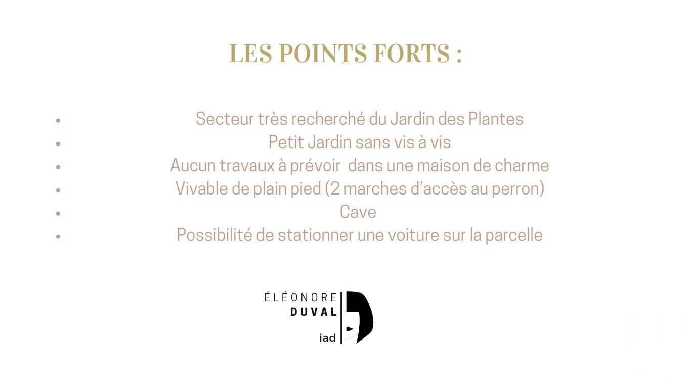 Iad France - Eléonore Duval vous propose : 'POPPIES' : Une MAISON NEUVE dans une jolie MAISON EN BRIQUE et SILEX au pied du Jardin des Plantes ! Situées dans une rue très calme au coeur d'un secteur très recherché, vous pourrez tout simplement poser vos meubles dans cette maison fraîchement rénovée ! Au rdc vous trouverez : - un grand séjour double orienté Sud avec une cheminée - un palier confortable distribuant : - une chambre donnant sur le jardin - une salle de bain avec wc - et une cuisine avec coin repas, ouverte en angle sur le petit jardin. - Une entrée autonome est possible directement vers la cuisine. Au 1er étage, le palier dessert : - 2 belles chambres mansardées avec rangements - 1 wc La maison est entourée de 2 petits jardins : l'un sur l'avant et l'autre vers l'arrière à la façon d'un patio sans vis-à-vis. Une grande cave accessible depuis le jardin complète les prestations de cette maison. Vous trouverez toutes les prestations modernes et confortables dans cette jolie maison ! Je vous invite à me contacter afin de voir ensemble si cette jolie 'Poppies' correspond à votre projet, et ainsi, organiser une visite, à bientôt Eléonore Honoraires d'agence à la charge du vendeur. Information d'affichage énergétique sur ce bien : classe ENERGIE D indice 230 et classe CLIMAT B indice 7. Les informations sur les risques auxquels ce bien est exposé, y compris l'obligation légale de débroussaillement, sont disponibles sur le site Géorisques : http://www.georisques.gouv.fr. La présente annonce immobilière a été rédigée sous la responsabilité éditoriale de Mme Eléonore Duval mandataire indépendant en immobilier (sans détention de fonds), agent commercial de la SAS I@D France immatriculé au RSAC de ROUEN sous le numéro 910036334, titulaire de la carte de démarchage immobilier pour le compte de la société I@D France SAS.
