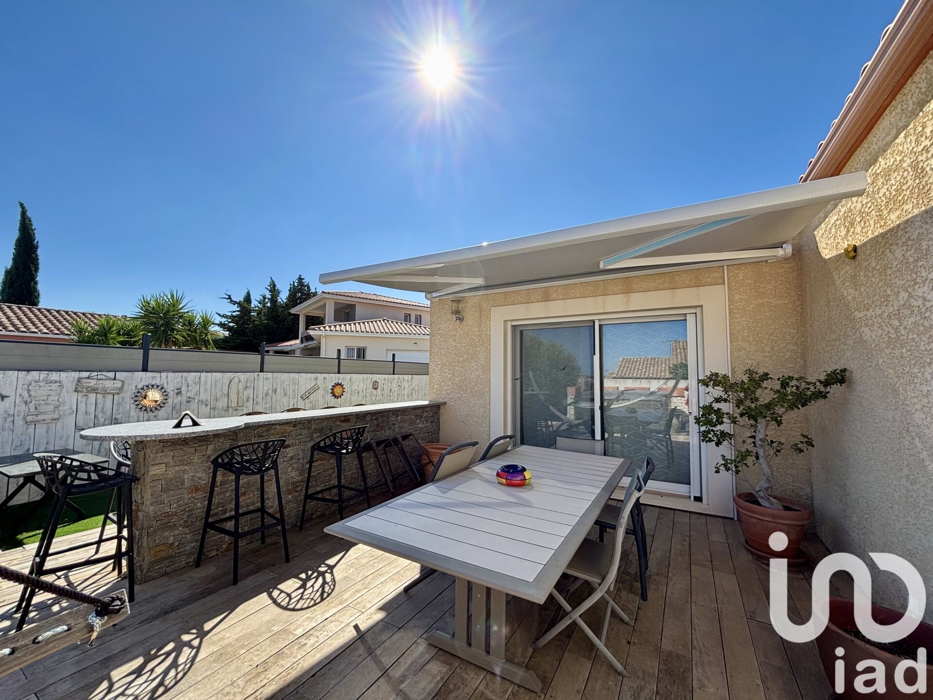 Iad France - Deborah Borie vous propose : Située à La Palme, cette magnifique maison contemporaine de plain-pied, d'une surface habitable de 100 m² environ, offre un cadre de vie enchanteur pour une famille ou des amateurs de tranquillité. Dès l'entrée, vous serez séduit par le vaste salon lumineux, idéal pour se détendre en famille ou recevoir des amis. La cuisine américaine équipée, ouverte sur le séjour, est un véritable atout pour les amateurs de convivialité et de modernité. Vous apprécierez les 3 chambres spacieuses offrant des espaces privés confortables, ainsi que le bureau idéal pour le télétravail. La salle de bain, les toilettes séparées et la buanderie avec sa douche aménagée complètent les espaces de vie de cette maison. Pour profiter des douces soirées méditerranéennes avec sa grande terrasse avec son jacuzzi donnant sur un jardin accueillera vos moments de détente en extérieur. Deux places de parking et un garage privatif viennent compléter les prestations de ce bien. Cette maison bénéficie d'une situation géographique privilégiée, à proximité de la Plage du Rouet, des Salins de La Palme et des sentiers pédestres en garrigue, offrant un cadre de vie paisible proche de la nature. Les commerces se trouvent à seulement 500m, et la ville de Leucate est accessible en 8 kms. Ne manquez pas l'opportunité d'acquérir ce véritable havre de paix alliant confort moderne et quiétude méditerranéenne. Une visite s'impose pour découvrir tous les trésors de cette maison d'exception. Honoraires d'agence à la charge du vendeur. Information d'affichage énergétique sur ce bien : classe ENERGIE B indice 109 et classe CLIMAT A indice 3. Les informations sur les risques auxquels ce bien est exposé, y compris l'obligation légale de débroussaillement, sont disponibles sur le site Géorisques : http://www.georisques.gouv.fr. La présente annonce immobilière a été rédigée sous la responsabilité éditoriale de Mme Deborah Borie mandataire indépendant en immobilier (sans détention de fonds), agent commercial de la SAS I@D France immatriculé au RSAC de NARBONNE sous le numéro 928043595, titulaire de la carte de démarchage immobilier pour le compte de la société I@D France SAS.