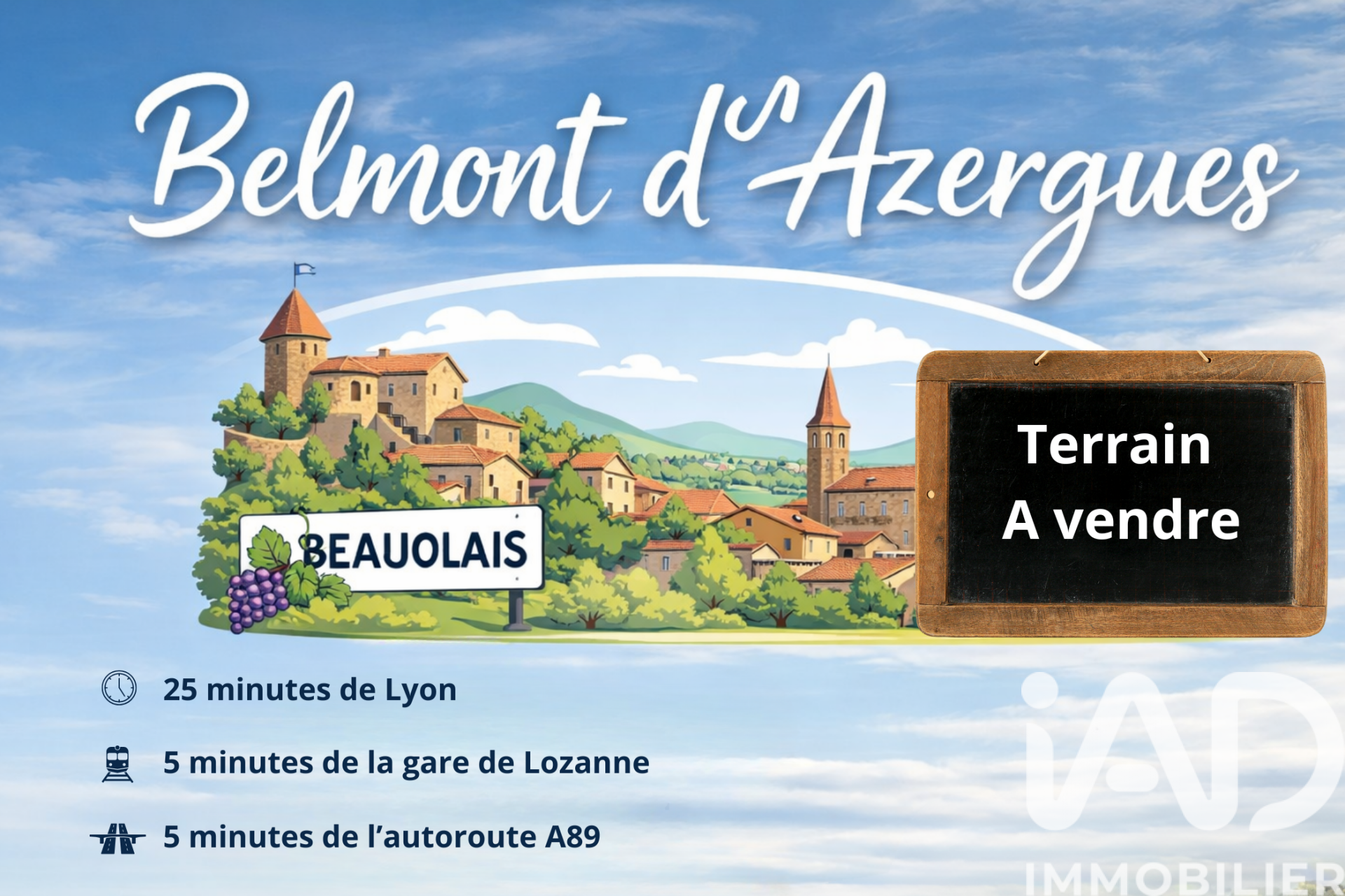 Iad France - Béatrice Lambert vous propose : Terrain Belmont – 965 m² - à viabiliser Sur la commune appréciée de Belmont-d’Azergues, à seulement quelques minutes de Lozanne, ce terrain constructible constitue une belle base pour imaginer et concrétiser un projet de maison dans un cadre agréable. Un emplacement équilibré entre calme et praticité. Situé au 281 route de Villefranche, le terrain bénéficie d’un environnement résidentiel tout en restant proche des essentiels du quotidien : •accès rapide à l’A89 •gare de Lozanne facilement accessible (20 minutes de Lyon) •commerces, école primaire et transports à proximité Un terrain propice à la construction : •terrain plat, facilitant l’implantation d’une maison •clôturé, offrant un cadre déjà structuré •surface confortable permettant différents aménagements intérieurs et extérieurs (CES 30% et Coefficient pleine terre 30%) Un secteur recherché pour sa qualité de vie et sa situation géographique. Ce terrain permet d’envisager un projet à personnaliser, un investissement,. Je me tiens à votre disposition pour vous apporter toutes les informations nécessaires et vous accompagner dans la découverte de ce terrain. Je travaille en collaboration avec une maître d’OEuvre qui pourra si besoin vous accompagner dans votre projet construction avec des artisans locaux. Pour en savoir plus ou organiser une visite, n’hésitez pas à me contacter. Honoraires d'agence à la charge du vendeur. Bien non soumis au DPE. Les informations sur les risques auxquels ce bien est exposé, y compris l'obligation légale de débroussaillement, sont disponibles sur le site Géorisques : http://www.georisques.gouv.fr. La présente annonce immobilière a été rédigée sous la responsabilité éditoriale de Mme Béatrice Lambert mandataire indépendant en immobilier (sans détention de fonds), agent commercial de la SAS I@D France immatriculé au RSAC de VILLEFRANCHE-TARARE sous le numéro 979059342, titulaire de la carte de démarchage immobilier pour le compte de la société I@D France SAS.