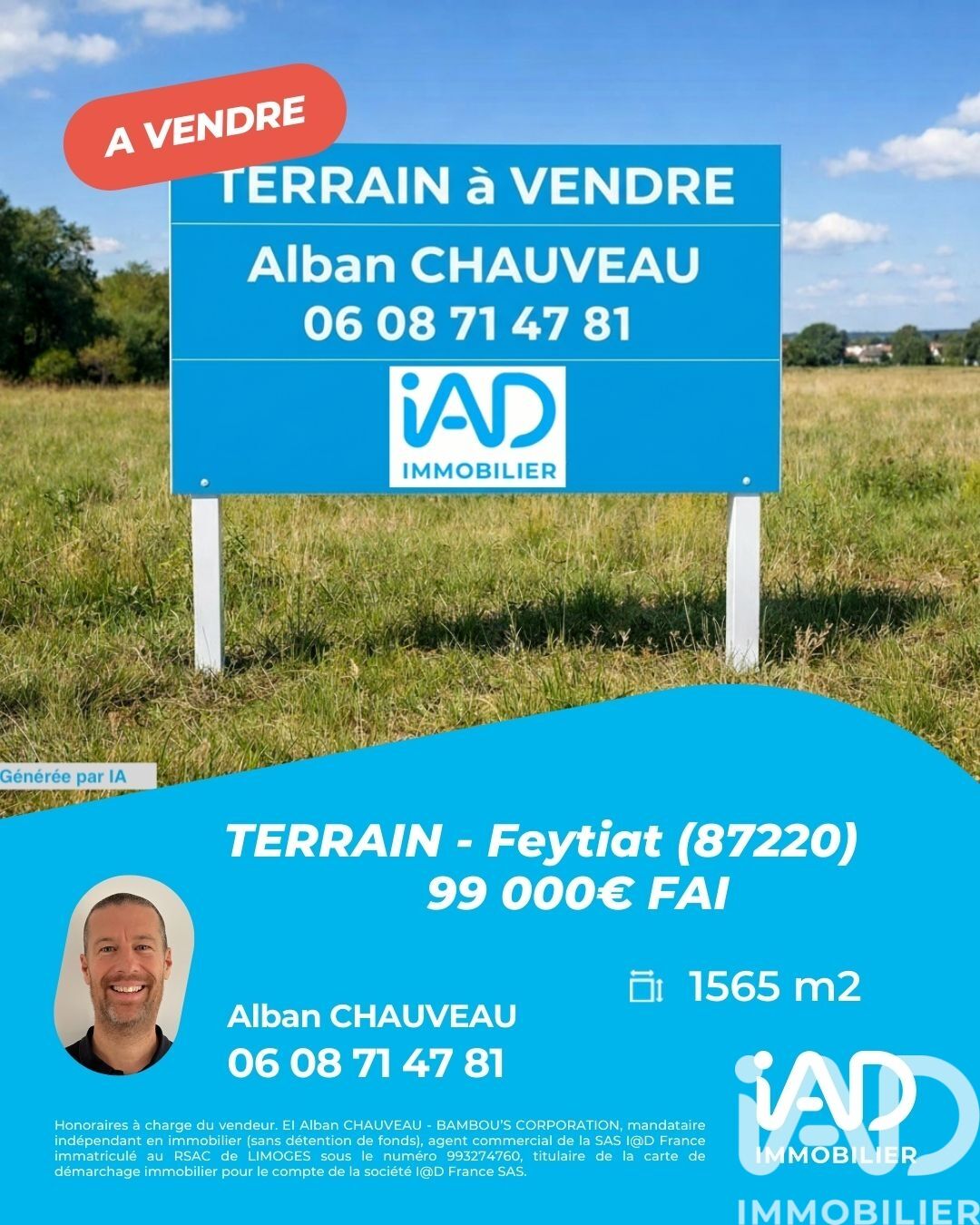 Iad France - Alban Chauveau vous propose : FEYTIAT - Opportunité rare à saisir _ Terrain à bâtir de 1184 m² Avec Surplus NON CONSTRUCTIBLE de 381 m² Les réseaux essentiels tels que l'électricité, l'eau potable, les eaux usées, les eaux pluviales, le tout à l'égout et la fibre sont déjà présents, ce qui facilitera grandement la viabilisation de votre future construction. De plus, l'accès aux réseaux existants est un avantage majeur pour garantir un confort optimal dès l'emménagement. Ce terrain est l'opportunité idéale pour concrétiser votre projet immobilier. Situé à l'extérieur du bourg, sur un emplacement stratégique, ce terrain offre un cadre de vie paisible tout en étant à proximité des commodités nécessaires au quotidien. Vous aurez la liberté de concevoir et de construire la maison qui correspond parfaitement à vos besoins et à vos envies. Avec une emprise au sol permettant la construction d'une belle maison individuelle, ce terrain offre de multiples possibilités d'aménagement pour créer un espace de vie qui vous ressemble et offre une vue dégagée et un ensoleillement optimal tout au long de la journée. Vous pourrez profiter d'un jardin spacieux pour créer un espace extérieur agréable et convivial, idéal pour les moments de détente en famille ou entre amis. Contactez-moi dès maintenant pour plus d'informations et pour organiser une visite sur place. Honoraires d'agence à la charge du vendeur. Bien non soumis au DPE. Les informations sur les risques auxquels ce bien est exposé, y compris l'obligation légale de débroussaillement, sont disponibles sur le site Géorisques : http://www.georisques.gouv.fr. La présente annonce immobilière a été rédigée sous la responsabilité éditoriale de M Alban Chauveau mandataire indépendant en immobilier (sans détention de fonds), agent commercial de la SAS I@D France immatriculé au RSAC de LIMOGES sous le numéro 993274760, titulaire de la carte de démarchage immobilier pour le compte de la société I@D France SAS.