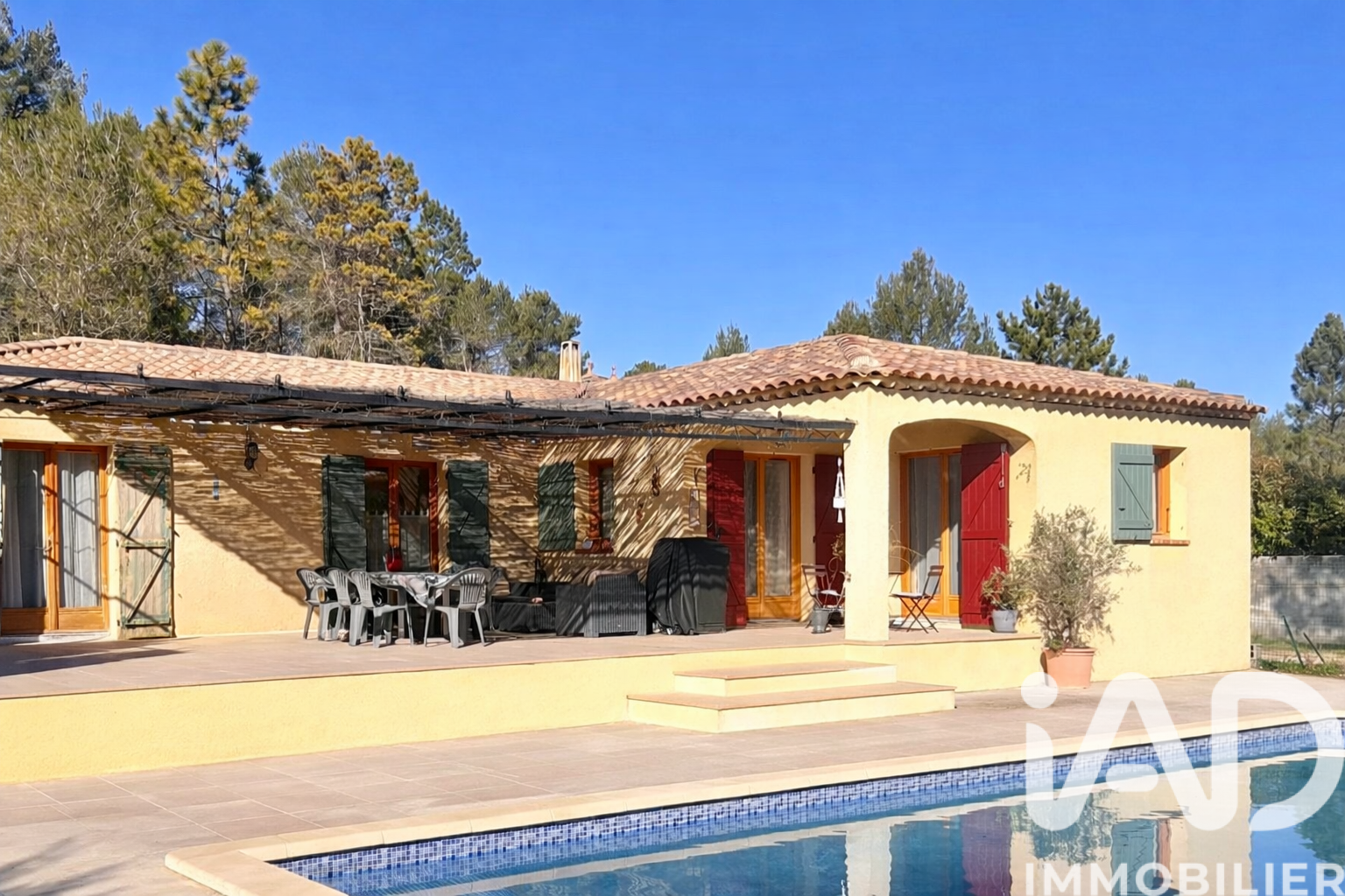 Iad France - Laurence BARON vous propose : Située sur la commune de Bras, j’ai le plaisir de vous proposer à la vente, en exclusivité, cette maison individuelle de plain-pied, construite en 2007, d’une superficie de 127 m², de type 5 (4 chambres). Dès l’entrée, un hall aménagé de son dressing, dessert une vaste pièce de vie de 50 m², faisant office de salon-salle à manger, agrémentée d’un poêle à bois et ouverte sur une cuisine entièrement équipée. Un cellier / buanderie de 7 m², attenant à la cuisine, vient compléter cet espace fonctionnel. Un WC indépendant est également présent à l’entrée. L’espace nuit se compose de quatre chambres aux surfaces confortables (10,50 m² – 11,61 m² – 11,04 m² – 12,42 m²), ainsi que d’une salle de bains équipée d’une douche et d’une baignoire. Côté extérieur, une terrasse de 50 m², attenante au salon, est aménagée d’une élégante tonnelle en fer forgé. Prestations du bien : – Huisseries bois double vitrage – Climatisation réversible – Volets bois – Sèche serviettes dans la salle d’eau – Piano de cuisson dans la cuisine – Chalet en bois de 12 m² servant de local de rangement dans le jardin Implantée sur un terrain de 8 385 m², mi-clos et arboré, la maison offre une belle diversité d’espaces : allée d’accès, aire de stationnement et de retournement, espace piscine, jardin plat ainsi qu’une partie boisée. La maison est raccordée à l’eau de ville et dispose d’un assainissement non collectif (fosse septique).Elle se situe dans un quartier résidentiel, sans vis-à-vis, et bénéficie d’un calme absolu. Ce bien rare à la vente constitue un véritable havre de paix. N’hésitez pas à me contacter, je reste à votre entière disposition. Honoraires d'agence à la charge du vendeur. Information d'affichage énergétique sur ce bien : classe ENERGIE B indice 107 et classe CLIMAT A indice 3. Les informations sur les risques auxquels ce bien est exposé, y compris l'obligation légale de débroussaillement, sont disponibles sur le site Géorisques : http://www.georisques.gouv.fr. La présente annonce immobilière a été rédigée sous la responsabilité éditoriale de Mme Laurence BARON mandataire indépendant en immobilier (sans détention de fonds), agent commercial de la SAS I@D France immatriculé au RSAC de DRAGUIGNAN sous le numéro 882366032, titulaire de la carte de démarchage immobilier pour le compte de la société I@D France SAS.