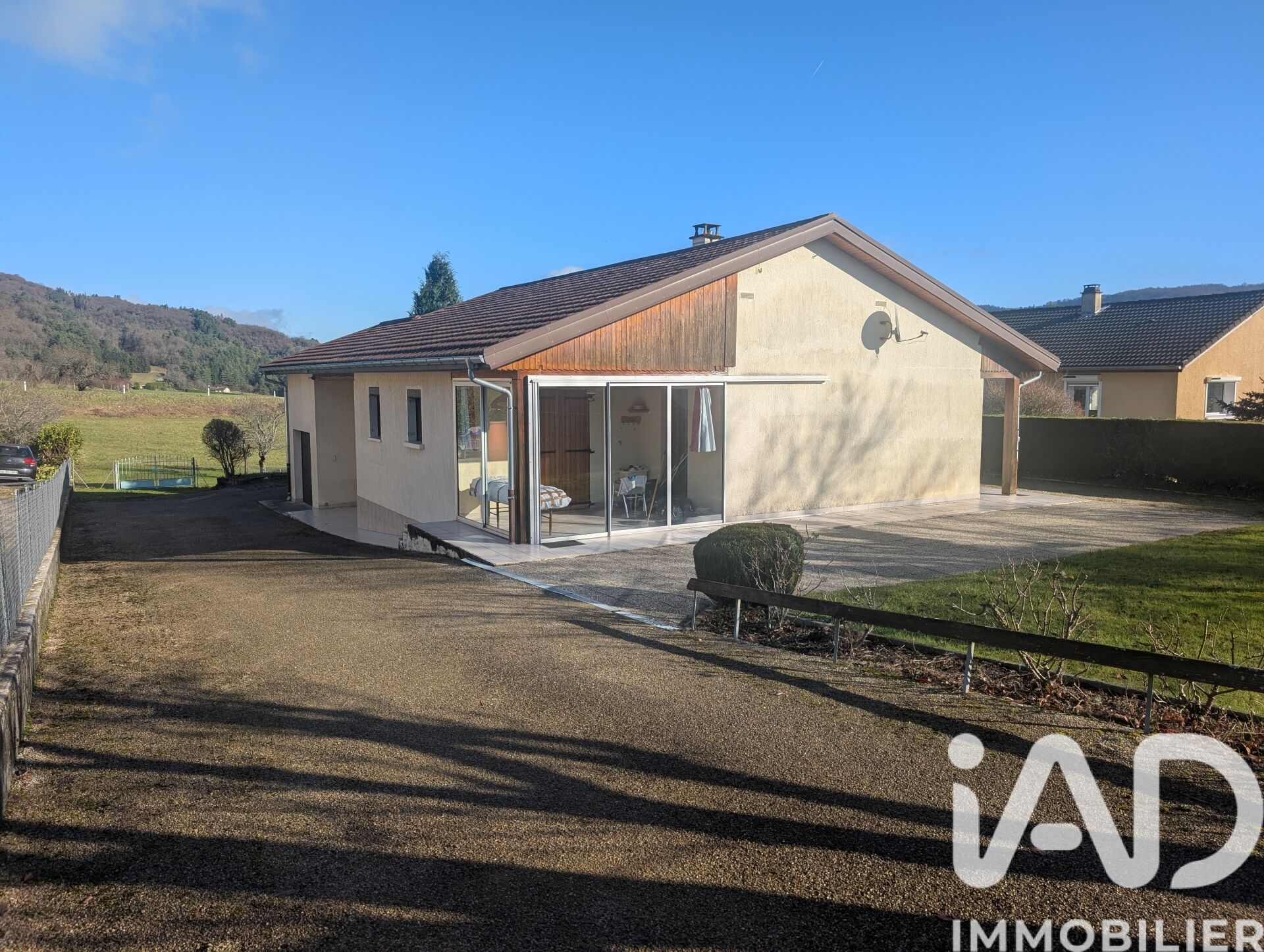 Iad France - Gauthier Courtin vous propose : Coeur de village de Matafelon, à deux pas de l'école communale. Maison individuelle de plain pied de 104 m², trois chambres de respectivement 11,12 et 18 m². Une spacieuse et lumineuse piece à vivre avec cuisine ouverte sur salon séjour, triple entrée lumineuse et accès direct vers le jardin et la terrasse. Le terrain de 1741 m² au total offre une première partie paysagée close et sécurisé communiquant avec une seconde partie de verger. La maison comporte également deux garages de 28 et 18 m² dont un motorisé, une cave, des fenêtres doubles vitrages avec volet roulant et un portail motorisé. Dans un secteur apprécié et calme cette maison de plain-pied nécessite quelques travaux de rafraichissement. Double mode de chauffage avec une cheminée bois et chauffage électrique. Honoraires d'agence à la charge du vendeur. Information d'affichage énergétique sur ce bien : classe ENERGIE F indice 357 et classe CLIMAT C indice 11. Les informations sur les risques auxquels ce bien est exposé, y compris l'obligation légale de débroussaillement, sont disponibles sur le site Géorisques : http://www.georisques.gouv.fr. La présente annonce immobilière a été rédigée sous la responsabilité éditoriale de M Gauthier Courtin mandataire indépendant en immobilier (sans détention de fonds), agent commercial de la SAS I@D France immatriculé au RSAC de BOURG EN BRESSE sous le numéro 888063583, titulaire de la carte de démarchage immobilier pour le compte de la société I@D France SAS.