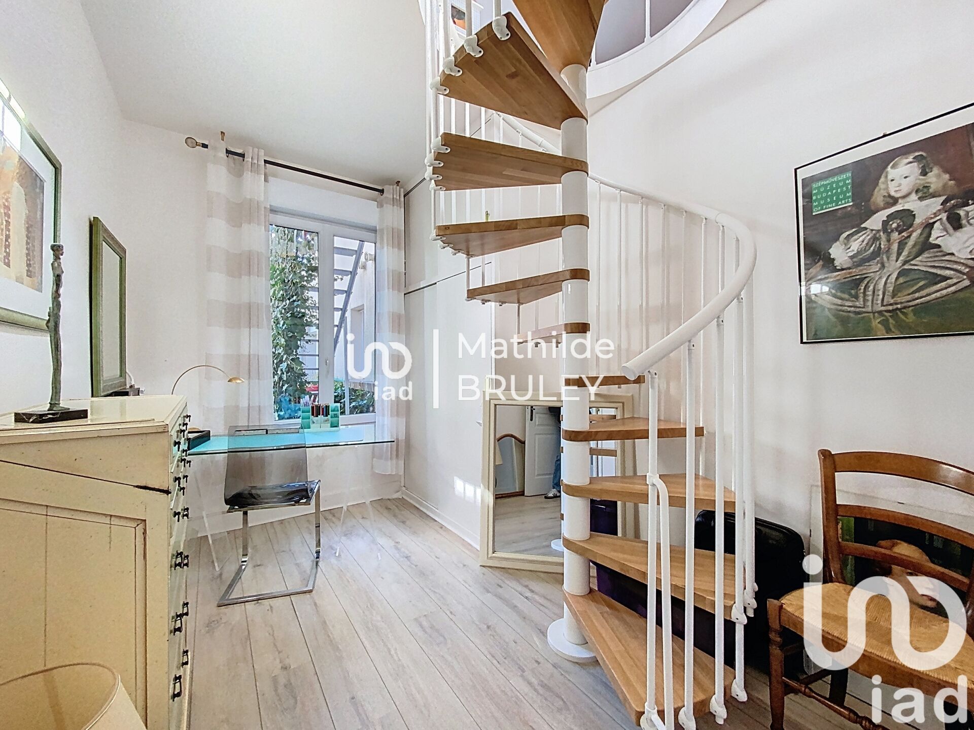 Une pièce polyvalente (bureau ou chambre d’appoint) avec escalier en colimaçon menant aux combles aménagés, parfaits pour un espace enfant ou du stockage.