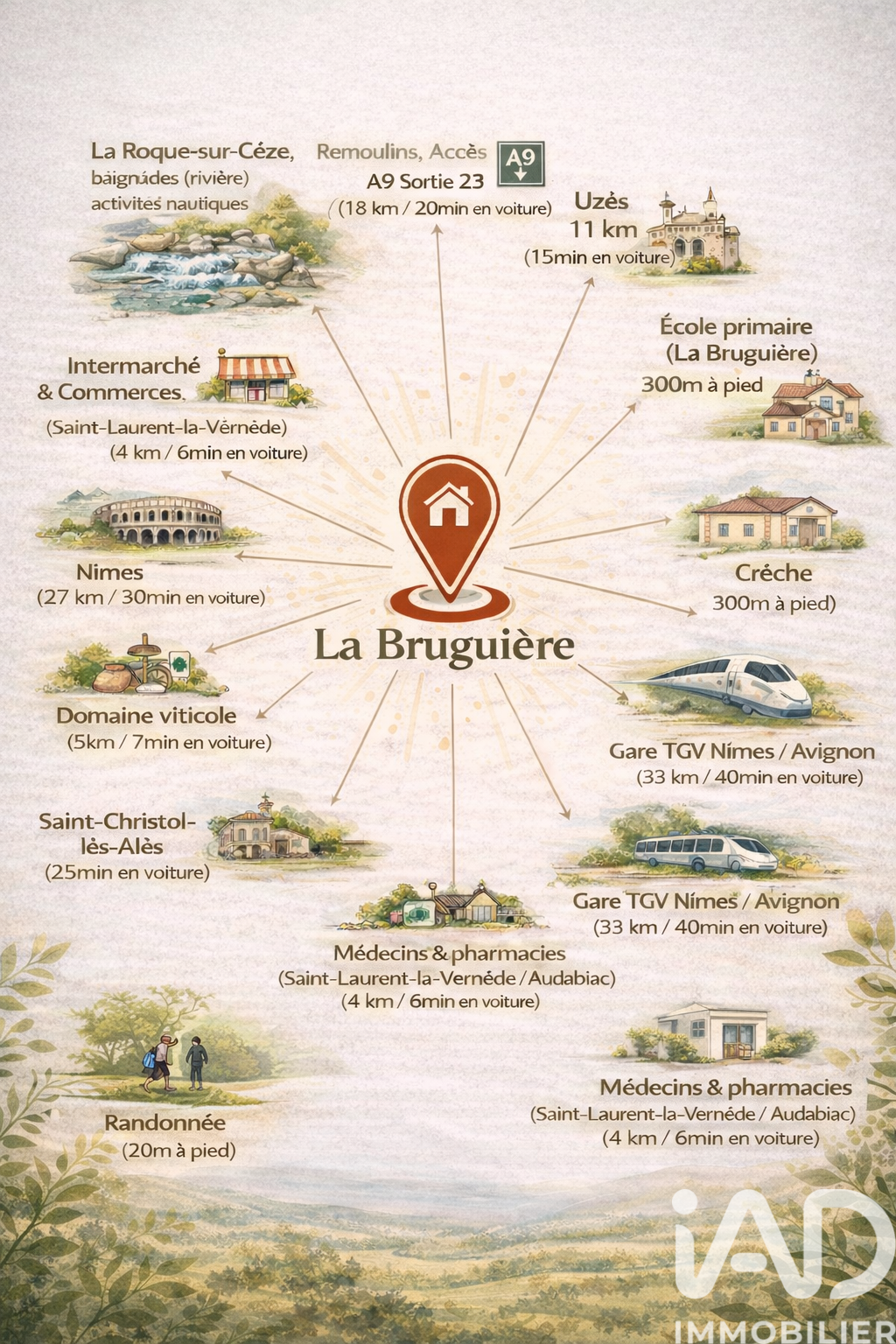 Iad France - Pauline Gueusquin Gilles vous propose : Maison de caractère 230 m² + dépendance 80 m² – 7 pièces – La Bruguière – Éco-performante, fort potentiel À La Bruguière, dans un environnement calme et privilégié, découvrez cette propriété rare offrant 230 m² habitables ainsi qu’une dépendance indépendante d’environ 80 m²… un vrai levier de valeur. Dès l’entrée, la maison principale séduit par ses volumes généreux, sa luminosité et son authenticité, idéale pour une vie de famille ou un projet mêlant habitation et activité. Caractéristiques principales : •Maison principale : 230 m² – 7 pièces •Pièces de vie spacieuses et chaleureuses •Plusieurs chambres confortables Dépendance de 80 m² : un atout rare •Idéale pour location saisonnière ou annuelle •Parfaite pour une activité professionnelle ou libérale •Peut accueillir famille, amis ou projet de gîte •Possibilité d’aménagement selon vos besoins Une maison tournée vers l’avenir : •Panneaux solaires pour une quasi-autonomie énergétique •Isolation en liège, écologique et performante •Très bonne performance énergétique •Confort thermique optimal toute l’année Extérieurs : Un cadre naturel agréable, propice à la détente, avec de nombreuses possibilités d’aménagement. Localisation : Située à La Bruguière, à proximité d’Uzès, dans un secteur recherché pour sa qualité de vie. Honoraires d'agence à la charge du vendeur. Information d'affichage énergétique sur ce bien : classe ENERGIE B indice 91 et classe CLIMAT A indice 2. Les informations sur les risques auxquels ce bien est exposé, y compris l'obligation légale de débroussaillement, sont disponibles sur le site Géorisques : http://www.georisques.gouv.fr. La présente annonce immobilière a été rédigée sous la responsabilité éditoriale de Mme Pauline Gueusquin Gilles mandataire indépendant en immobilier (sans détention de fonds), agent commercial de la SAS I@D France immatriculé au RSAC de NIMES sous le numéro 984864470, titulaire de la carte de démarchage immobilier pour le compte de la société I@D France SAS.