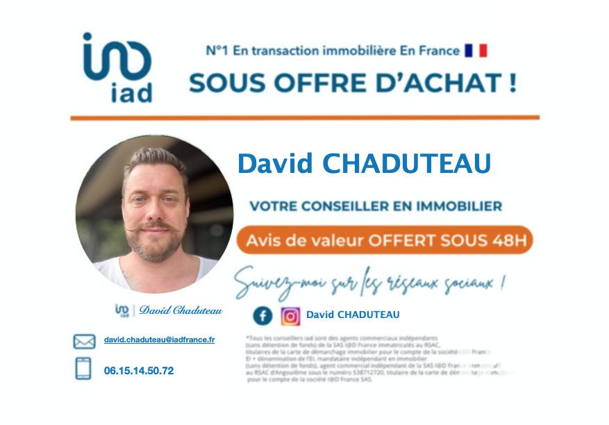 Iad France - David Chaduteau vous propose : À vendre – Superbe maison de plain-pied avec piscine – Saint-Saturnin (16290) Cette maison de plain-pied construite en 2007 offre 116 m² habitables et des prestations de qualité : - Une grande pièce de vie lumineuse ouverte sur une cuisine équipée et aménagée (11 m²), - Une salle à manger, - Trois chambres confortables (11,5 à 13 m²), - Une salle de bain avec baignoire, douche italienne et double vasque, - Un bureau de 8 m² pouvant servir de chambre d’amis, - Une buanderie fonctionnelle, - WC séparé. Côté confort : - Chauffage gaz de ville avec chaudière à condensation (changée en 2022) - Climatisation dans la pièce principale - Menuiseries PVC double vitrage - Isolation complète et entretien impeccable À l’extérieur : - Piscine chauffée 4x2 m (pompe à chaleur) - Terrasse couverte (30 m²) - Carport pour voiture - Abri de jardin - Portail électrique Terrain clos, plat et sans vis-à-vis, parfaitement entretenu. Exposition est / ouest, cadre paisible et résidentiel. Les plus : - Aucun travaux à prévoir - Chaudière récente + climatisation - Piscine chauffée - Calme et intimité - Maison lumineuse et fonctionnelle Contactez moi pour plus d'informations ou pour organiser une visite. Honoraires d'agence à la charge du vendeur. Information d'affichage énergétique sur ce bien : classe ENERGIE C indice 117 et classe CLIMAT C indice 22. Les informations sur les risques auxquels ce bien est exposé, y compris l'obligation légale de débroussaillement, sont disponibles sur le site Géorisques : http://www.georisques.gouv.fr. La présente annonce immobilière a été rédigée sous la responsabilité éditoriale de M David Chaduteau mandataire indépendant en immobilier (sans détention de fonds), agent commercial de la SAS I@D France immatriculé au RSAC de Angoulême sous le numéro 530641729, titulaire de la carte de démarchage immobilier pour le compte de la société I@D France SAS.