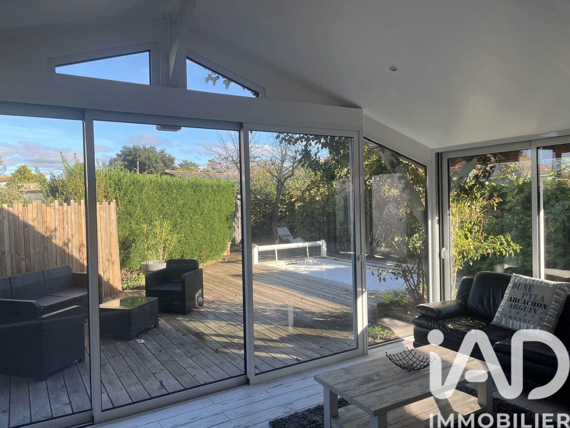 Iad France - Corinne Le Fur vous propose : Coup de coeur pour cette maison de plain-pied de 101 m² édifiée sur un terrain de 503 m². Située au calme d'une impasse elle a été rénovée dans un esprit cabane. Très lumineuse vous entrez dans une salle à manger avec cheminée, un salon vitré vous permet de profiter du jardin et de la piscine. La cuisine est actuellement fermée mais vous pouvez sans gros travaux l'ouvrir sur le séjour. 3 chambres, 1 salle d'eau, 1 WC et un bureau ou dressing complètent ce bien. À l'extérieur une piscine chauffée, une cuisine d'été et des dépendances aménageables à votre goût. Honoraires d'agence à la charge du vendeur. Information d'affichage énergétique sur ce bien : classe ENERGIE D indice 239 et classe CLIMAT B indice 7. Les informations sur les risques auxquels ce bien est exposé, y compris l'obligation légale de débroussaillement, sont disponibles sur le site Géorisques : http://www.georisques.gouv.fr. La présente annonce immobilière a été rédigée sous la responsabilité éditoriale de Mme Corinne Le Fur mandataire indépendant en immobilier (sans détention de fonds), agent commercial de la SAS I@D France immatriculé au RSAC de Bordeaux sous le numéro 509073904, titulaire de la carte de démarchage immobilier pour le compte de la société I@D France SAS.