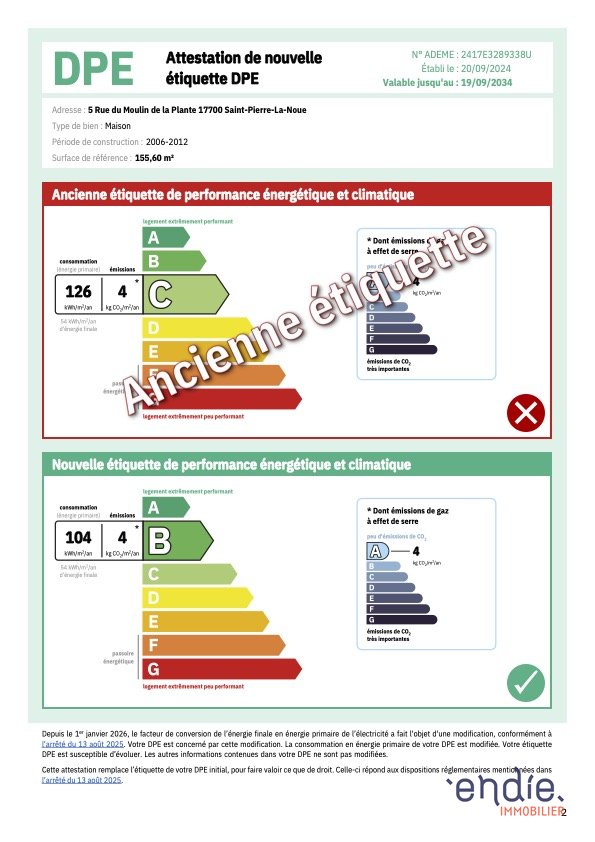 ) CARACTÉRISTIQUES : - Superficie maison (briques - 2007) : 183 m2 au sol (155,60 m2 carrez) - Superficie terrain : 728 m2 - DPE : C (NOUVEAU DPE : B (AVEC LA NOUVELLE RÉFORME 2026, VOIR ATTESTATION EN PHOTO)) - GES : A (autres diagnostics réalisés et remis après chaque visite : termites, électricité, état des risques) - taxe foncière 2024 : 1 554 euros - Huisseries double vitrage - Volets battants en aluminium isolants neufs - Chauffage : chauffage au sol (pompe à chaleur air / eau DAIKIN) . Le nécéssaire a été fait pour une potentielle installation de poêle dans le salon - Production d'eau chaude : ballon THERMOR 300 L - Adoucisseur d'eau - Révision du tableau électrique en octobre 2024 - Toiture démoussée et hydrofugée en octobre 2024 - Fibre internet raccordée - Alarme (sur demande) - Détecteur de fumée - Visite virtuelle sur demande pour une expérience immersive LES POINTS FORTS DE CETTE MAISON : - les volumes - l'emplacement géographique (proximité des commerces / écoles) - secteur calme - À seulement 30 minutes de la plage - le jardin clos et arboré - la classification énergétique (C) - Maison entretenue ECOLES ET COMMERCES A PROXIMITE : - 2 écoles maternelles publiques (Charles Perrault et Pierre de Ronsard) - 2 écoles primaires publiques (Jean Jaurès et Jules Ferry) - 1 collège public (Hélène de Fonsèque) - 2 lycées (Lycée du pays d'aunis (public) et enilia (professionnel)) - Commerces : Leclerc (hypermarché), intermarché, U express , Lidl et Aldi (supermarchés), Boulangeries, boucheries, coiffeurs, garagistes, instituts de beauté, stations services, banques - À 10 minutes de la gare N'attendez plus pour programmer votre visite et découvrir votre "futur chez vous", contactez Sylvain BROTTIER. Contactez votre conseiller Endie Immobilier : Sylvain BROTTIER - EI - 06 63 59 50 80 - Agent commercial indépendant Ville du greffe : POITIERS RSAC N° 499 358 752 - Le barème de nos honoraires est disponible sur www.endie.fr (réf. 030053154) (Les informations sur les risques auxquels ce bien est exposé sont disponibles sur le site Géorisques : http://www.georisques.gouv.fr)