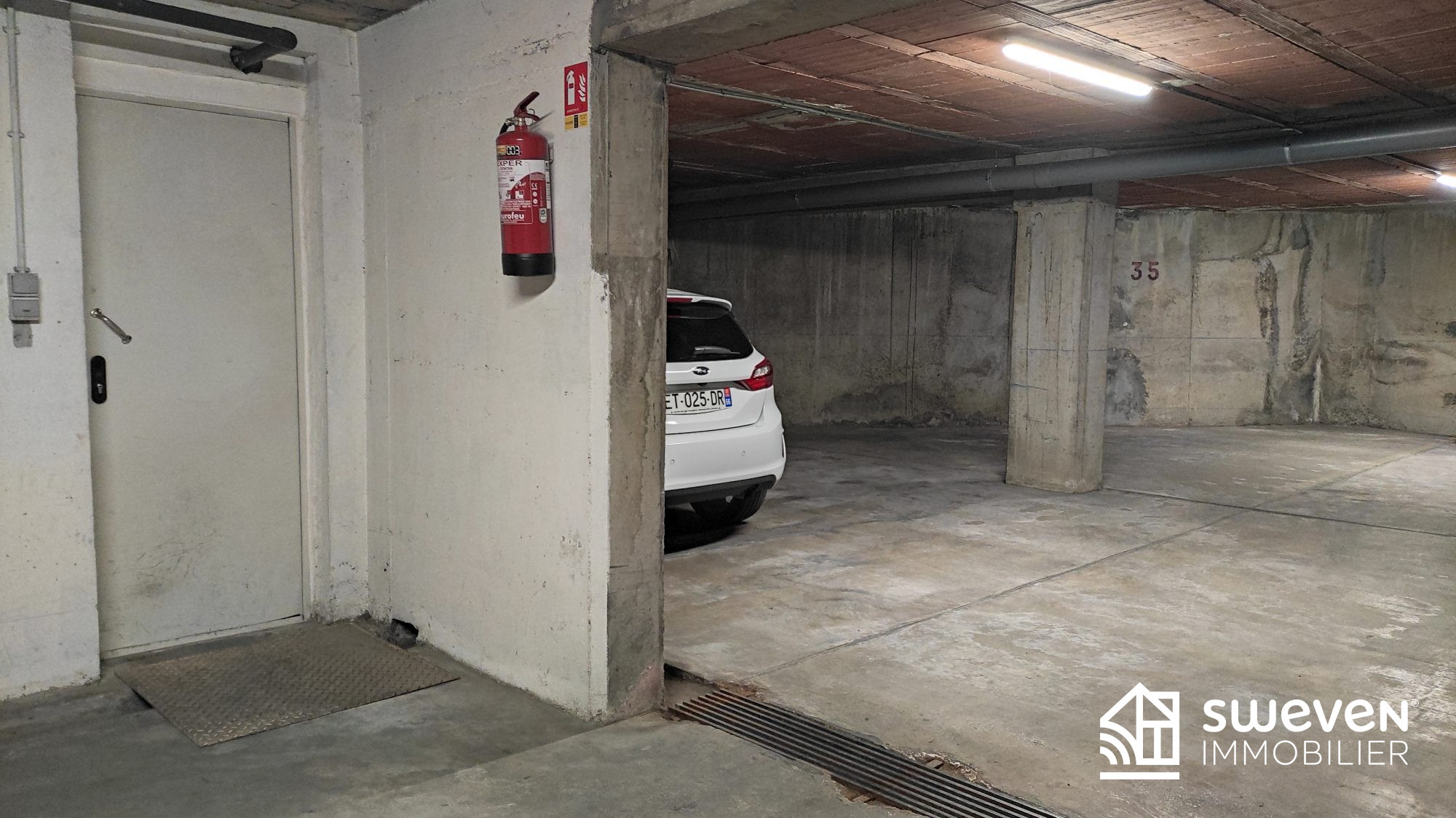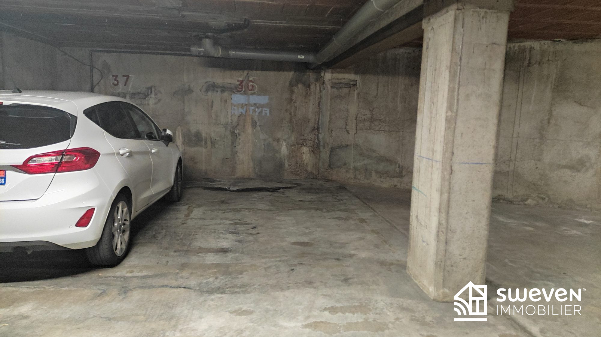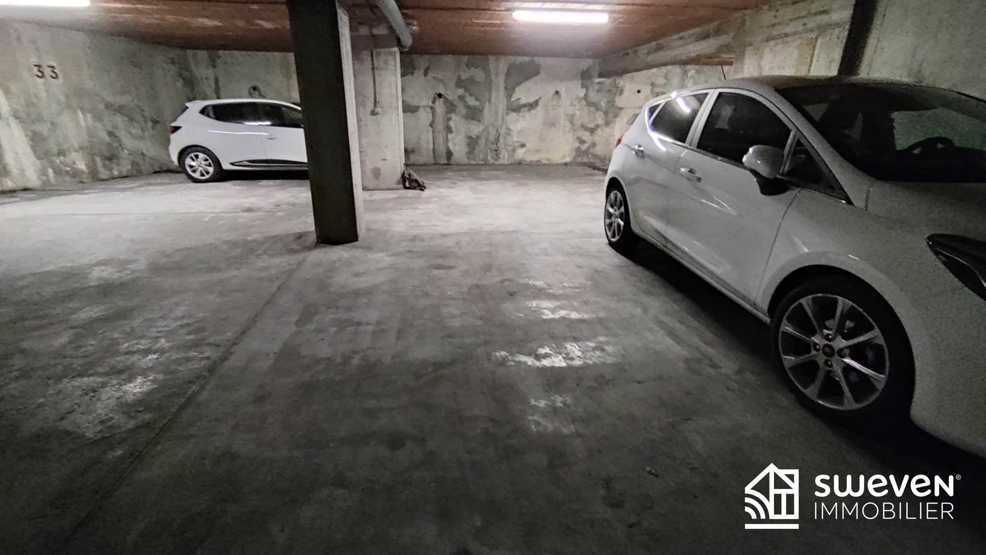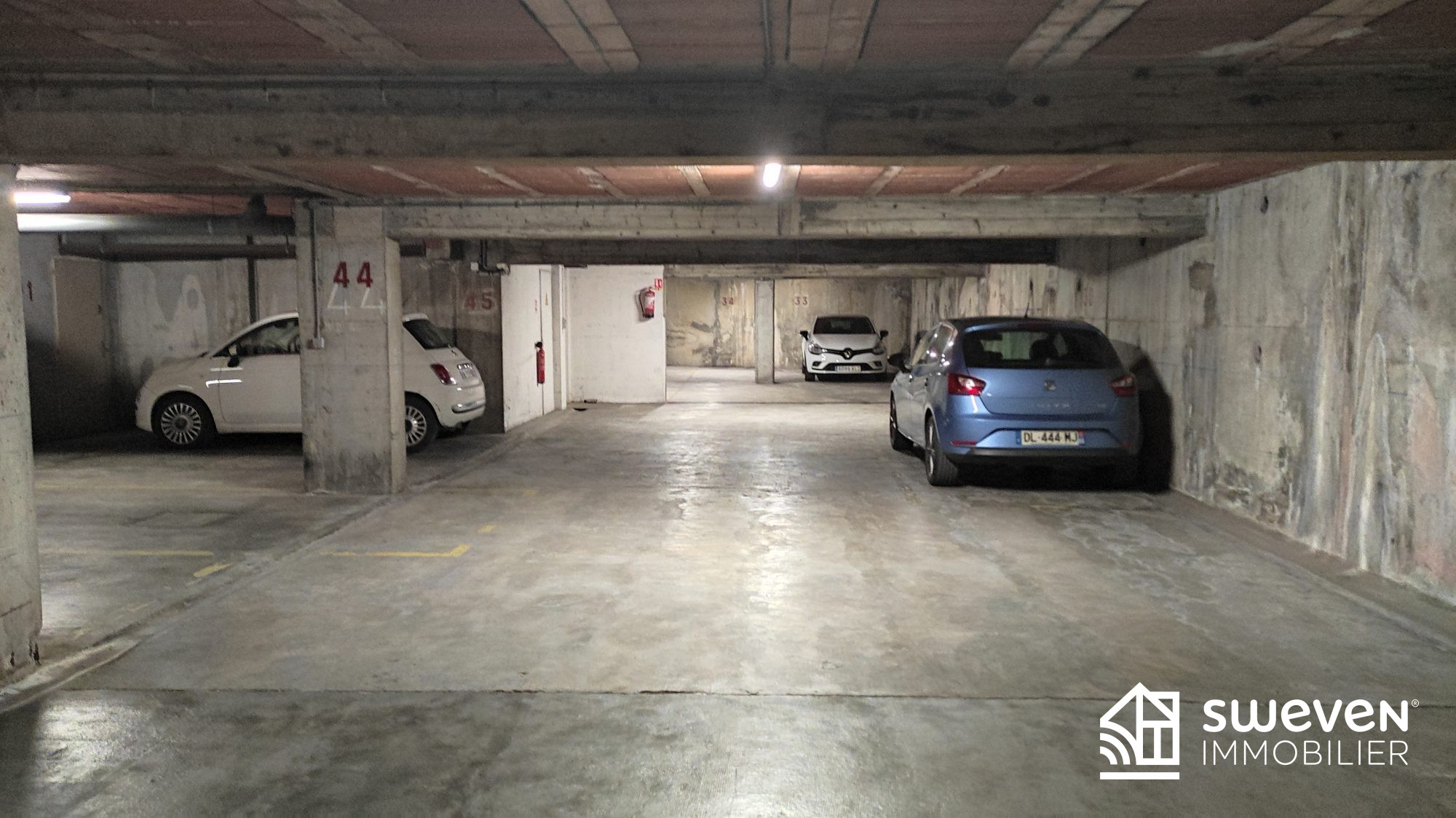 Place de stationnement ouverte dans parking souterrain d'une résidence sécurisée avec porte motorisée.