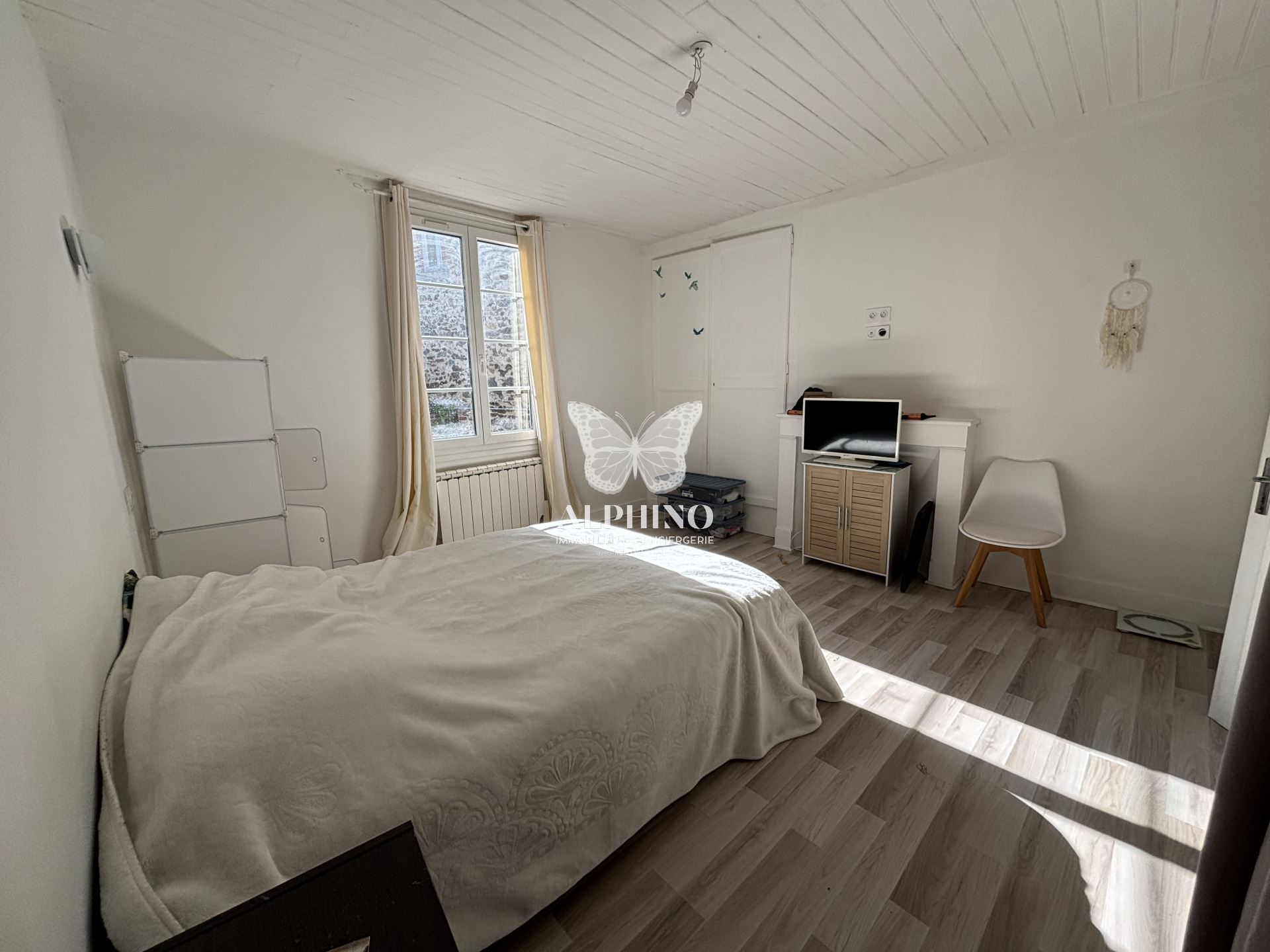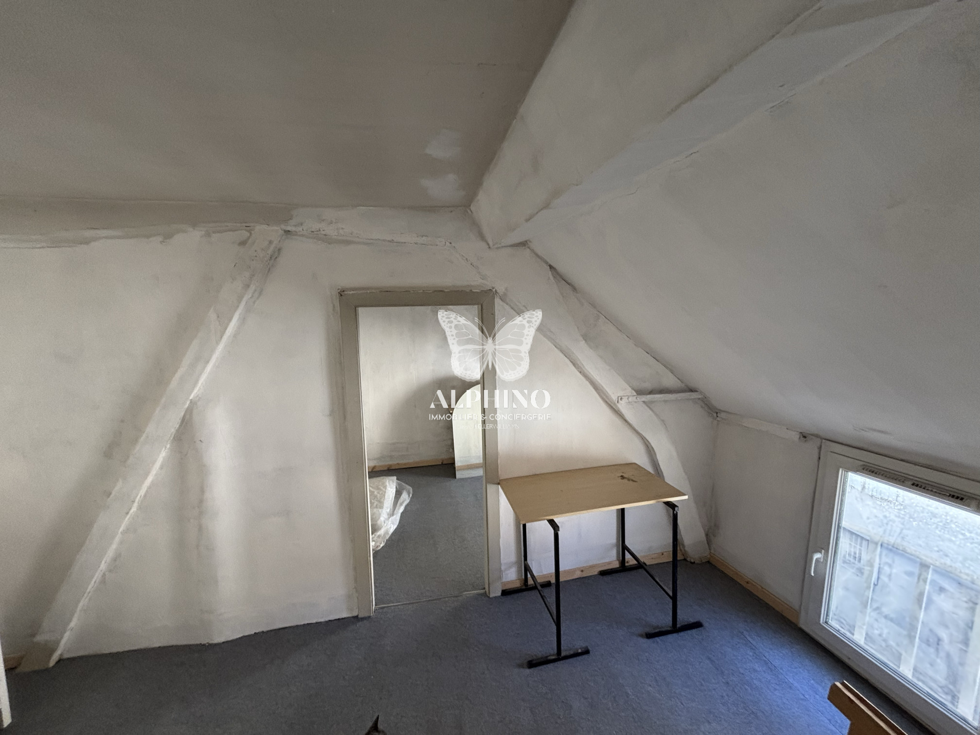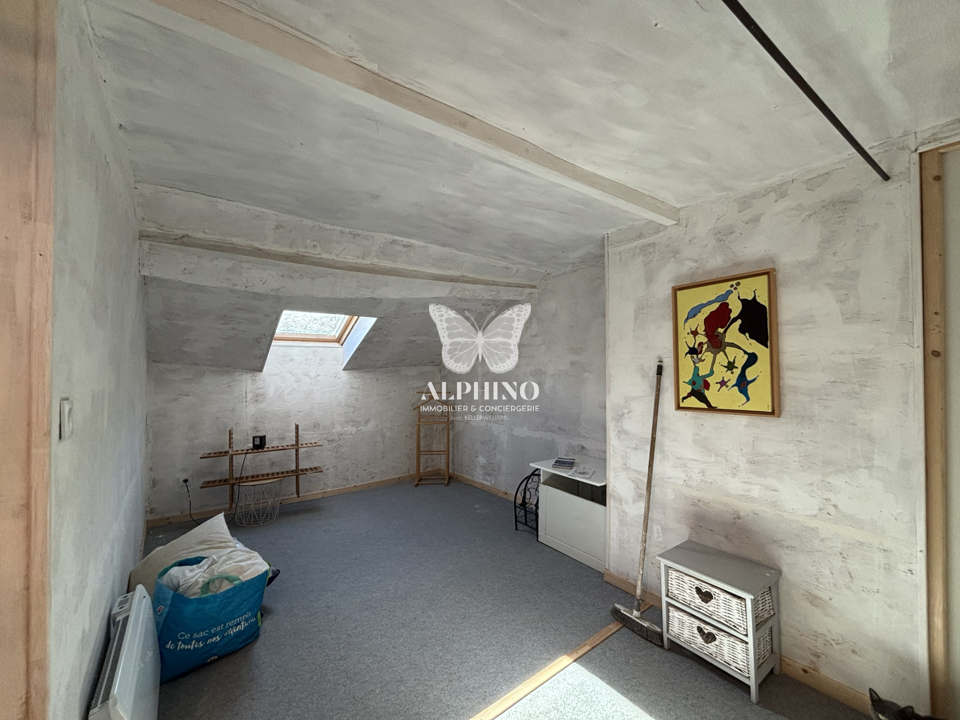 À l’étage, vous découvrirez un séjour lumineux ouvert sur la cuisine, une grande chambre et une salle d’eau fonctionnelle, offrant un espace de vie chaleureux et confortable.