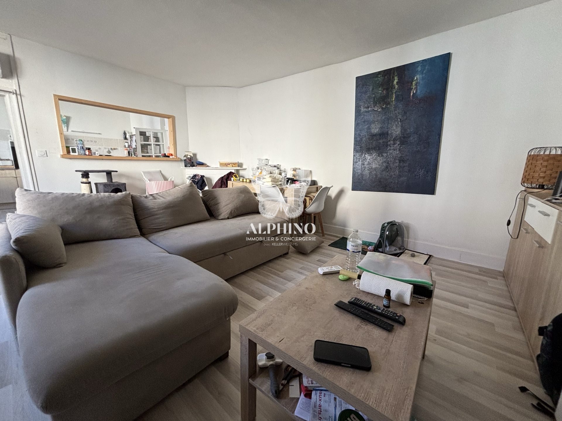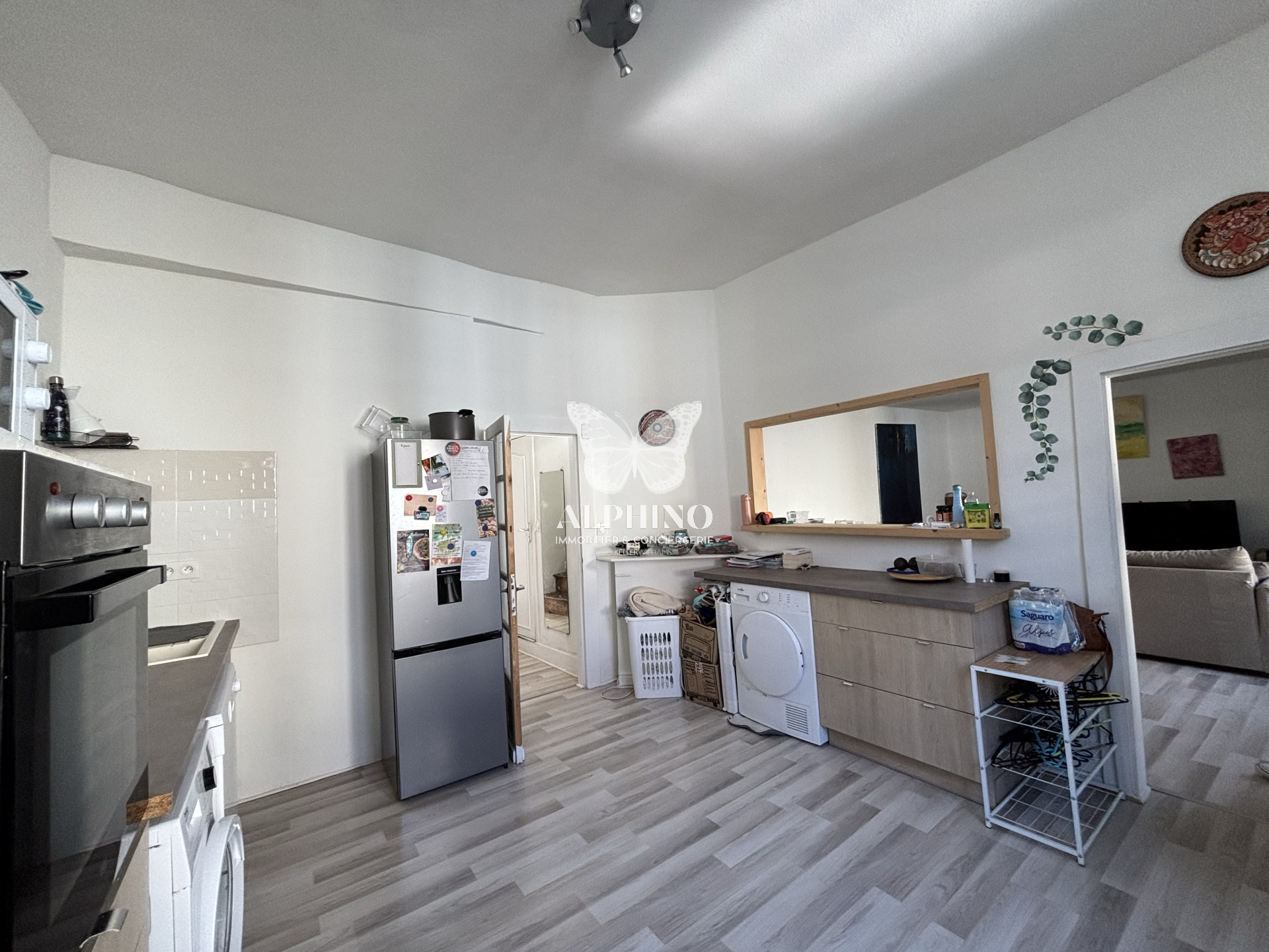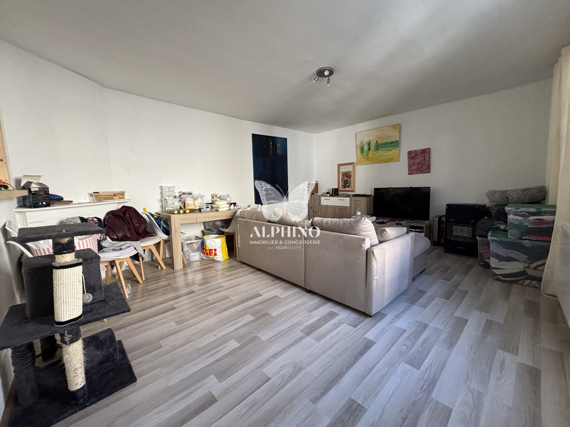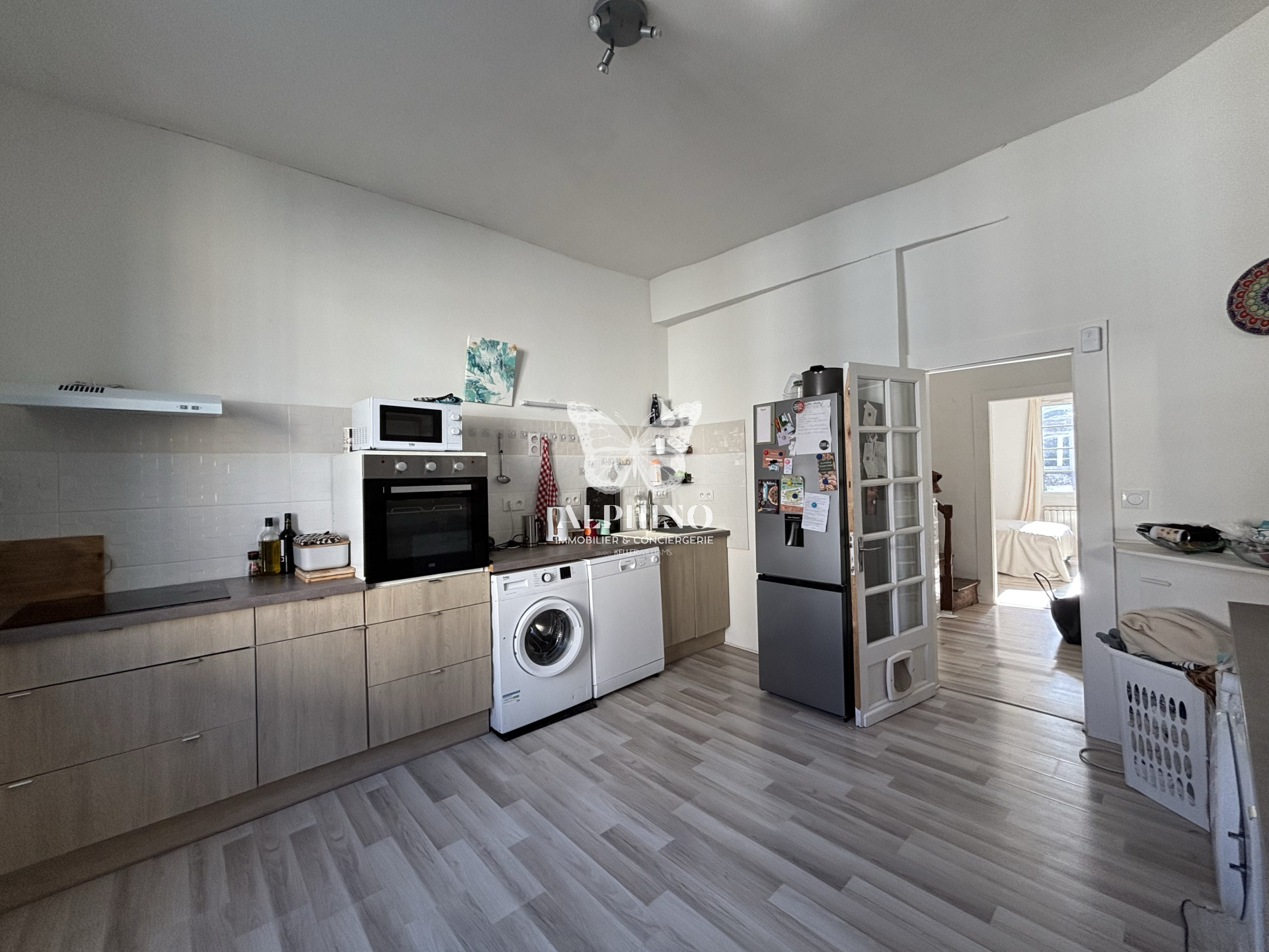 À l’étage, vous découvrirez un séjour lumineux ouvert sur la cuisine, une grande chambre et une salle d’eau fonctionnelle, offrant un espace de vie chaleureux et confortable.