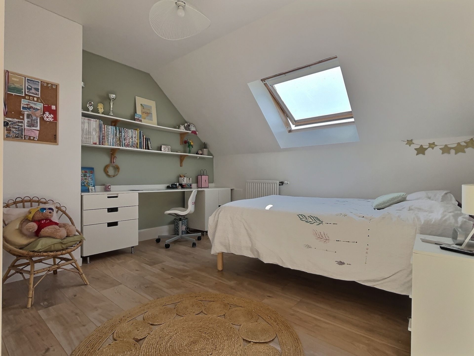 À l’étage, trois chambres confortables, une salle de bain et un wc supplémentaire offrent un espace nuit parfaitement adapté à une grande famille.